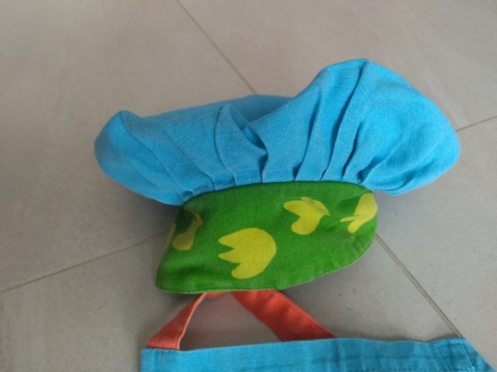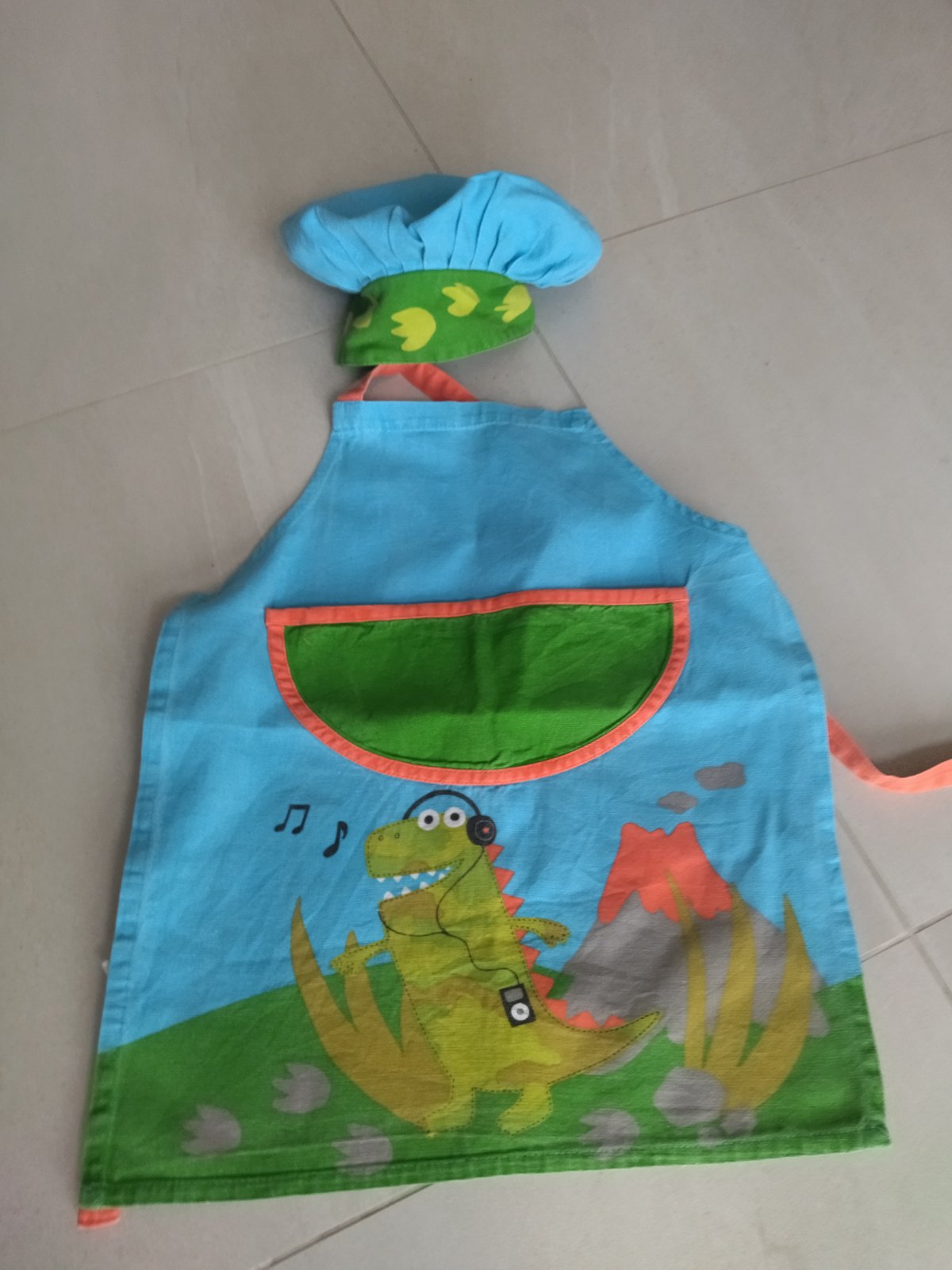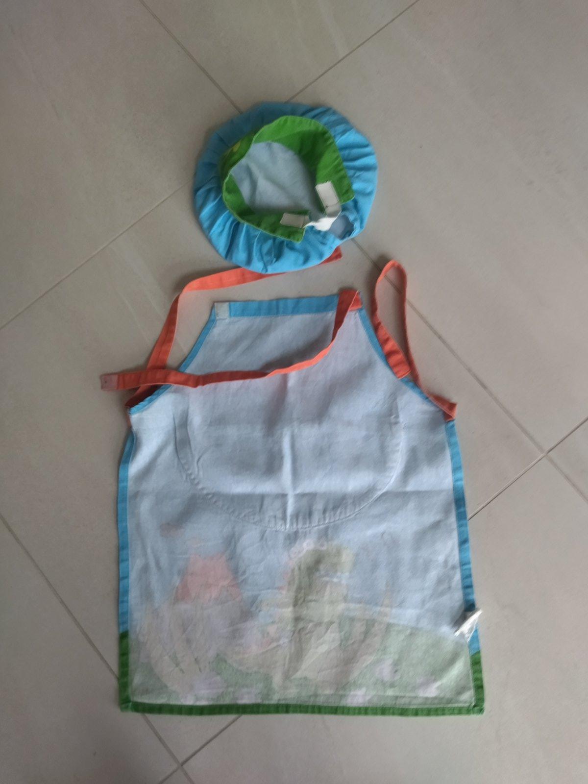 Predám detskú kuchársku súpravu - zastera + čiapka s motívom dinosaura. Vo výbornom stave. Farby sú jasné, nie su vyblednuté. Čiapka má gumičku, takže sa ľahko prispôsobí obvodu hlavy. Okolo krku sa zástera zapína na suchý zips, takže sa ľahko odolné pri silnejším potiahnutí, nehrozí riziko zadusenia. 100% bavlna. Dĺžka zástery je ca.53 cm, šírka cca. 45.cm.