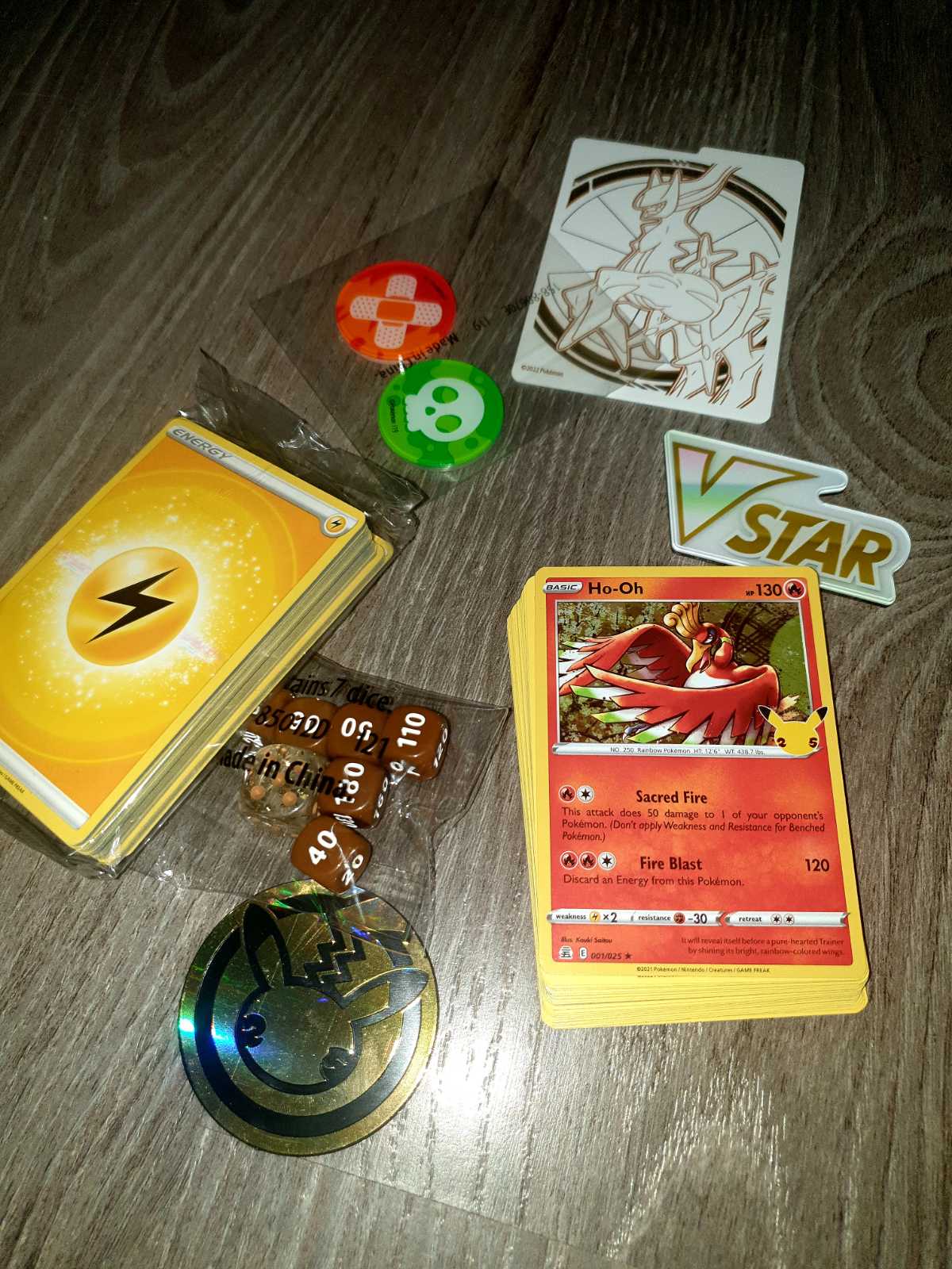 Všetko čo potrebujete na hranie Pokemon TCG kariet - energie (45 roznych typov energii pre rozne typy pokemonov), 25 kariet pokemonov (kazda ina), velku mincu Pikachu, oznacovače (markre) pre hru Vstar, vačšiu kocku a 6 malych kociek na pocitanie zraneni z utokov Pokemona + krasny oddelovač kariet z legendarnym Pokenonom Arceus. Vsetko original
