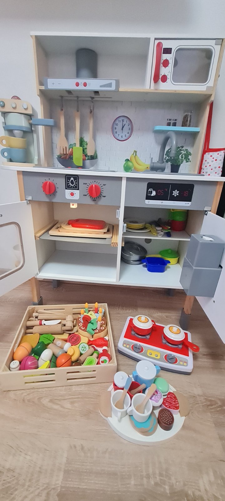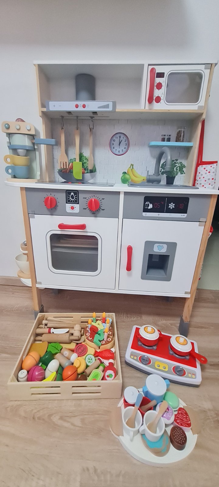 Predám kuchynku v dobrom stave, má bežné známky používania. Pripájam k nej bohaté príslušenstvo - drevený kavovar Little dutch, drevený šľahač Joueco, čajová súprava, varič, poháre, taniere, hrnce, dosky, ovocie, zelenina, torta a mnoho ďalšieho. Len osobný odber.