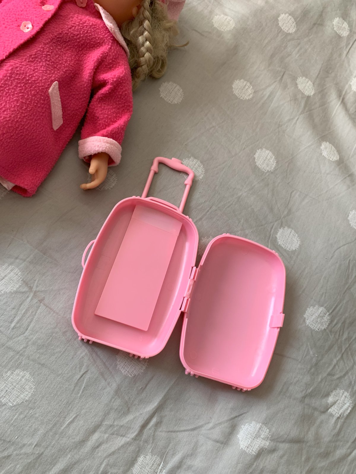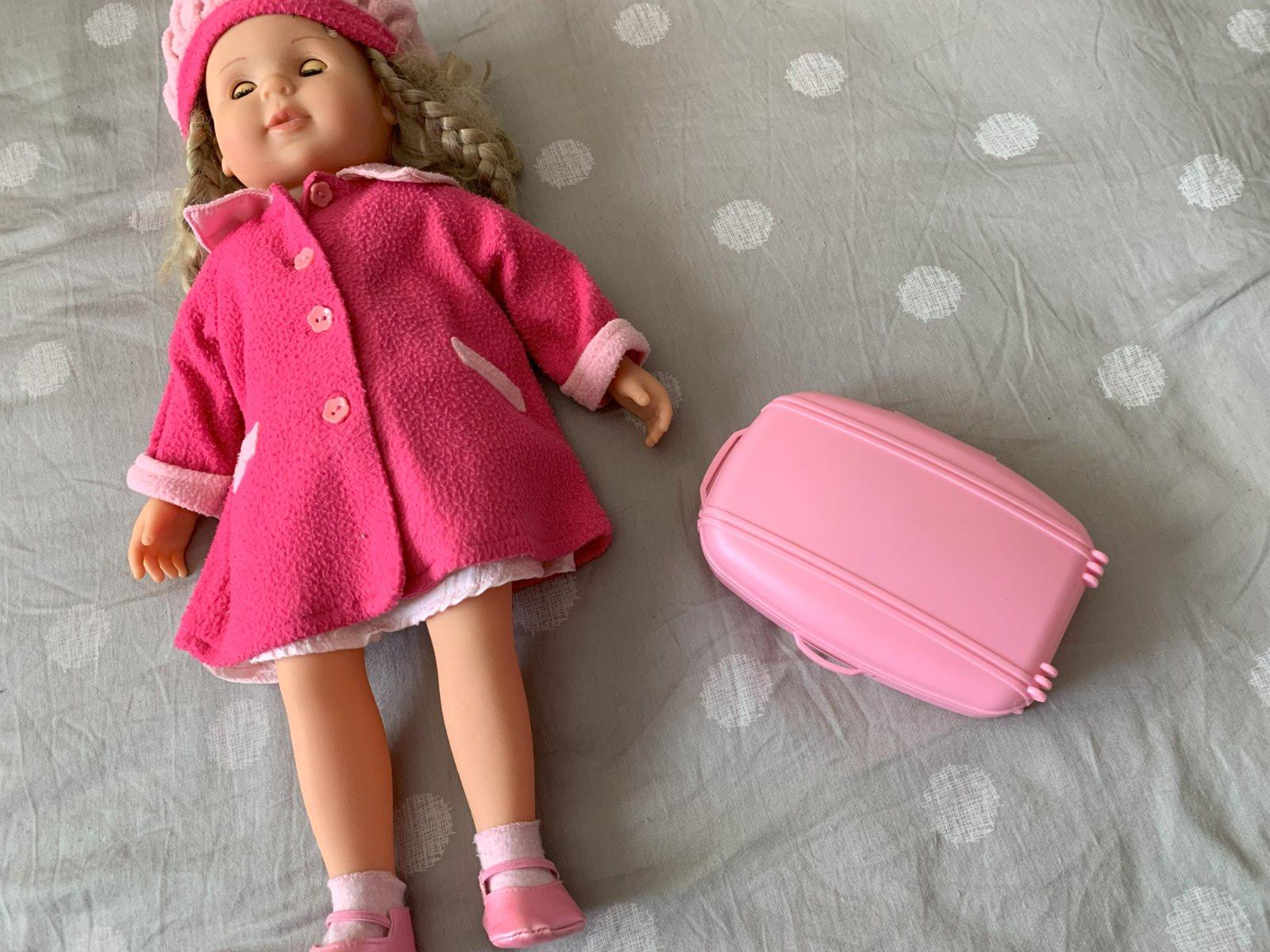 Na sebe má ružový kabátik, šaty, čiapku, ponožky a topánky, a v balení je aj ružový kufrík.