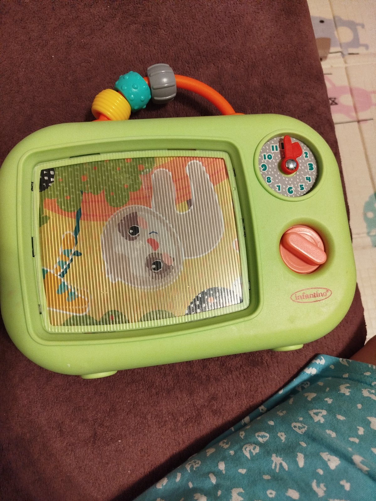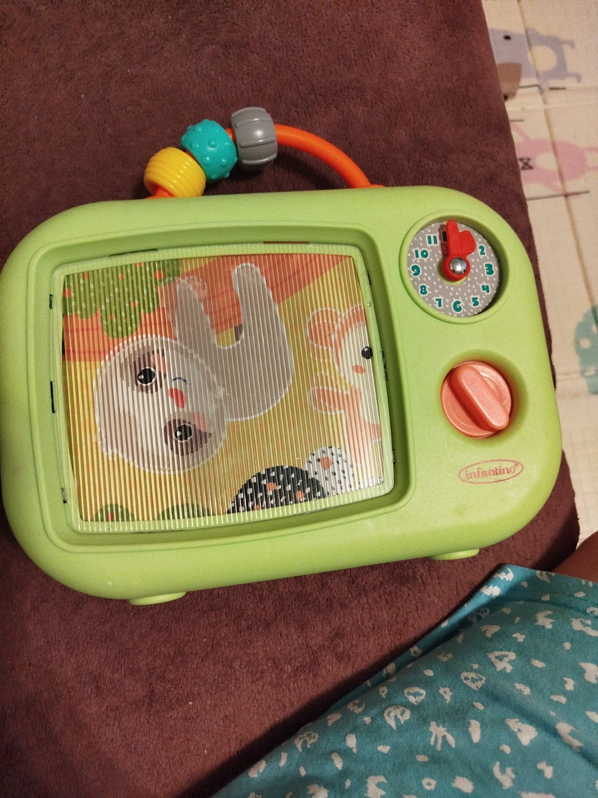 Prvá televízia pre vaše dieťa po otočení gombíka hrá príjemnú melódiu a obrázky zvieratiek na displeji sa začnú pohybovať. Držadlo s pohyblivými korálkami láka dieťa na skúmanie a zároveň uľahčuje uľahčuje prenášanie. Hodiny majú pohyblivé ručičky.