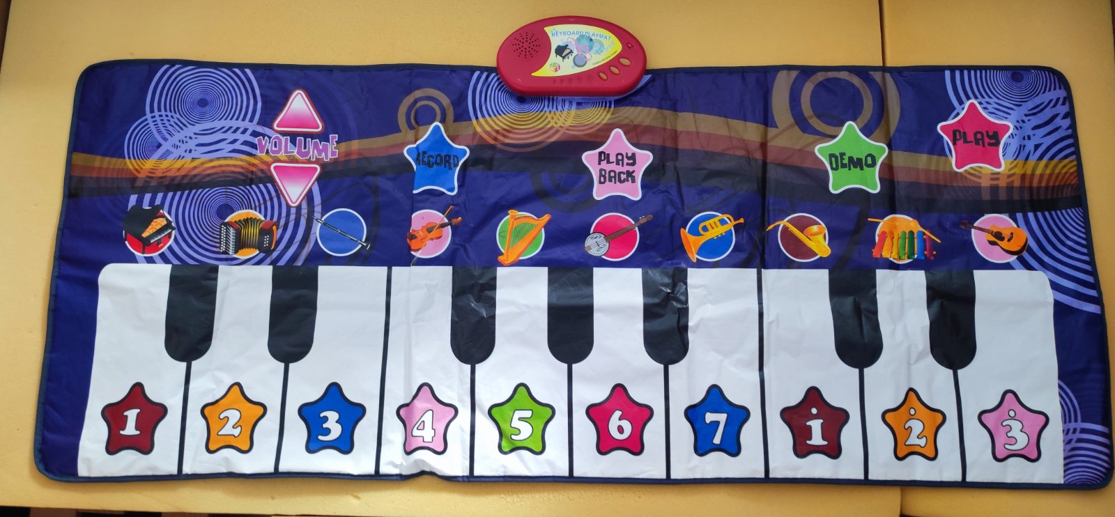 Predám klavír. Keď dieťa po ňom behá, vydáva zvuky, hrá melódie. Zadný kryt na baterky sa zlomil, takže chýba. Prekrývali sme malým kartónom, aby baterky nevypadli a v pohode to fungovalo. Dĺžka a šírka viď posledné foto.