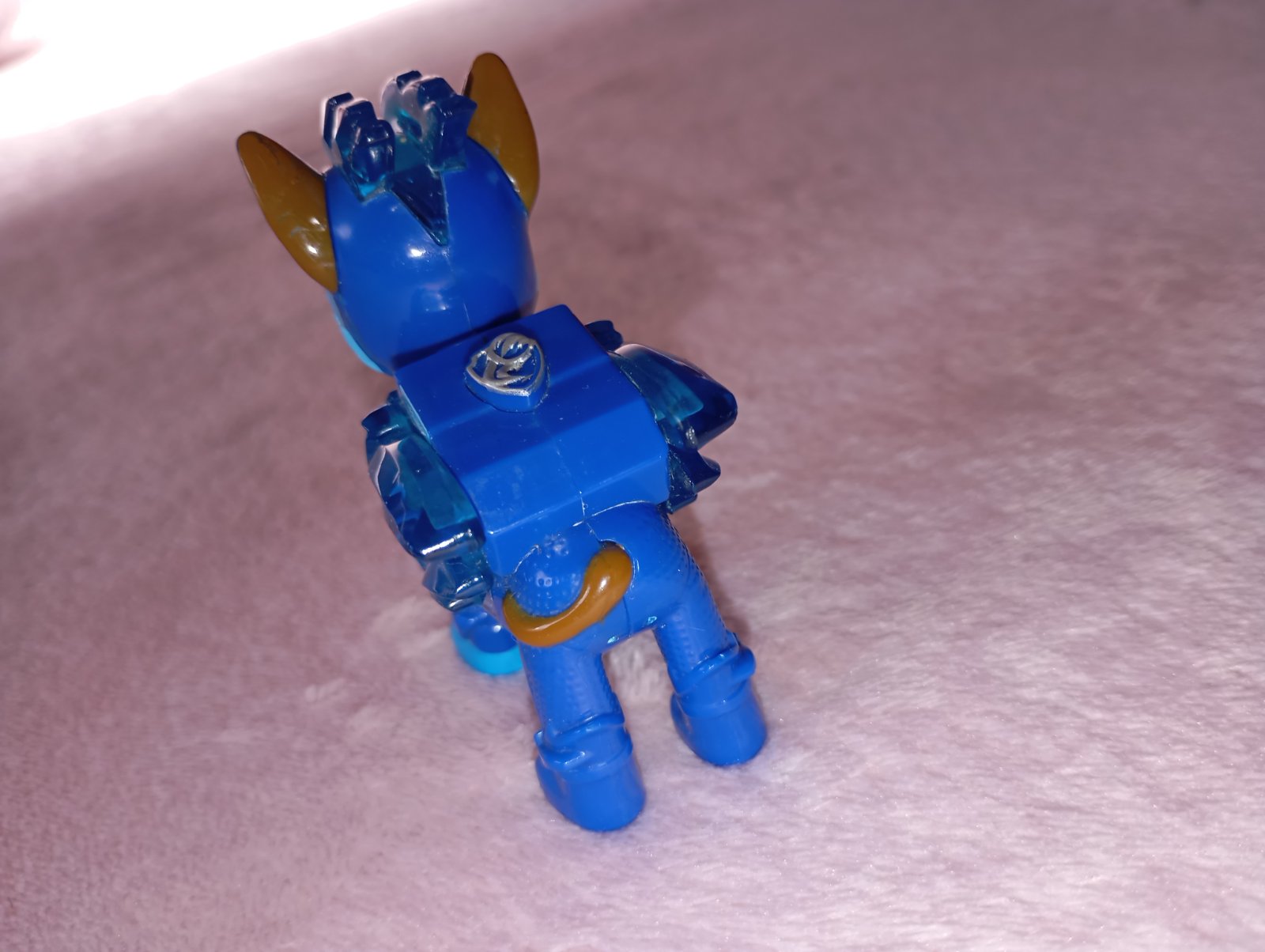 Je v špeciálnej priesvitnej uniforme, ktorá svieti keď stlačíte gombík na batohu šteniat.