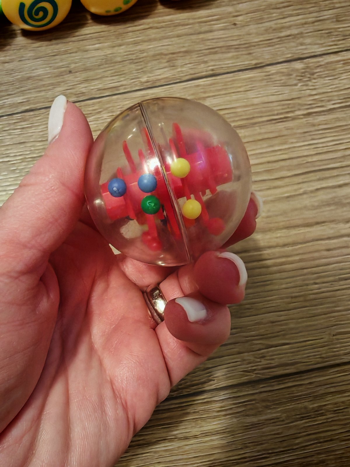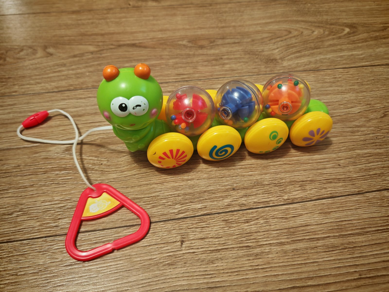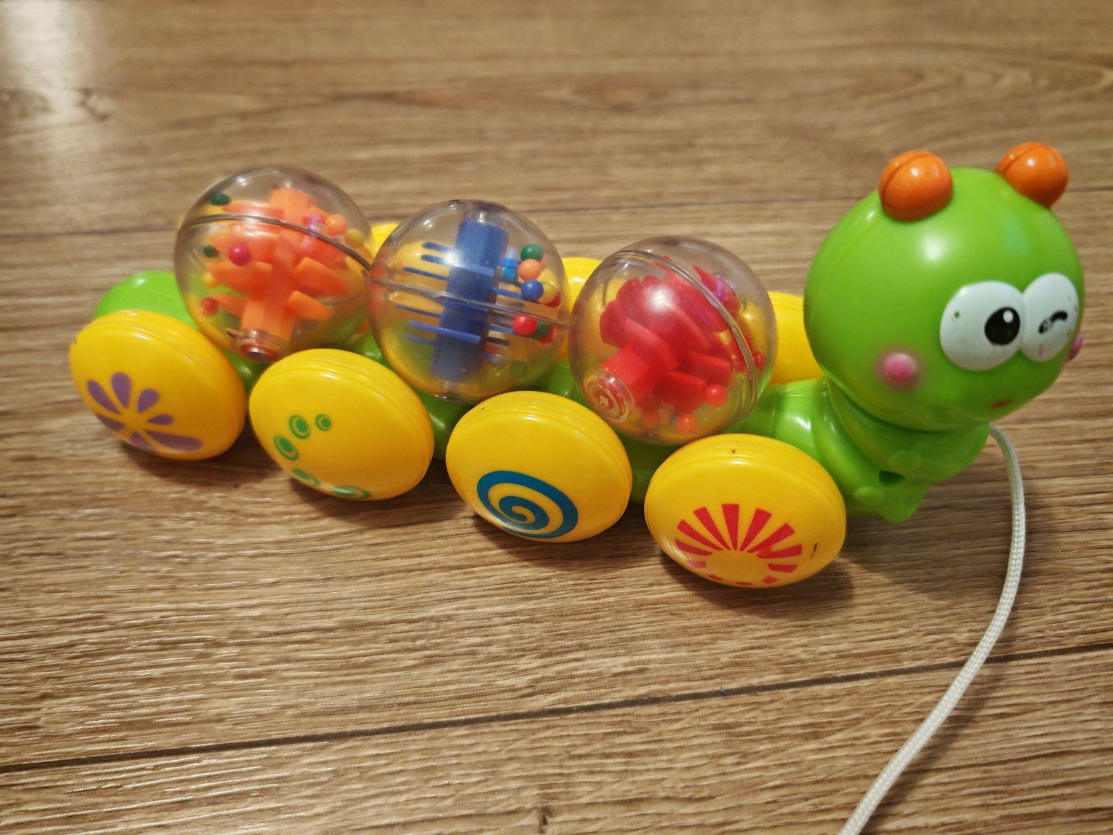 Húsenica ktorá vezie guľôčky a pri ťahaní sa všetky kotúľajú a robia zvuk