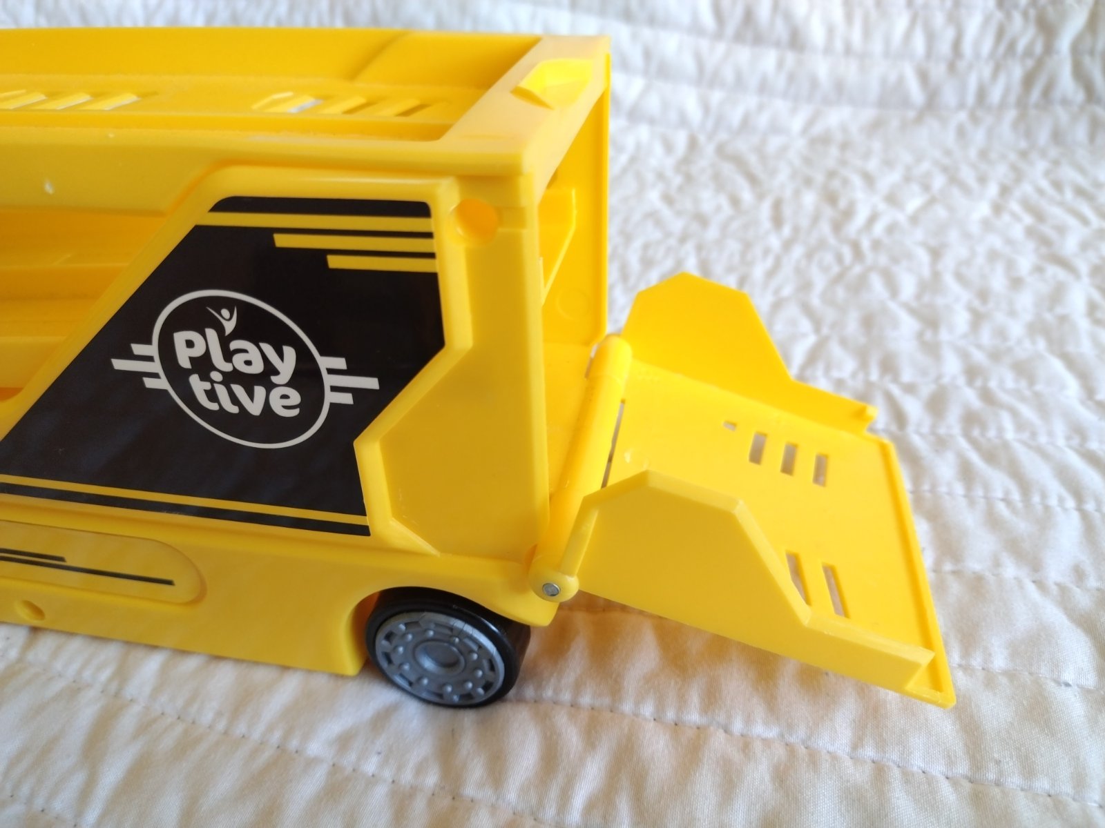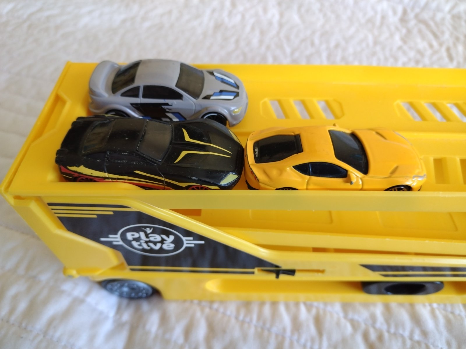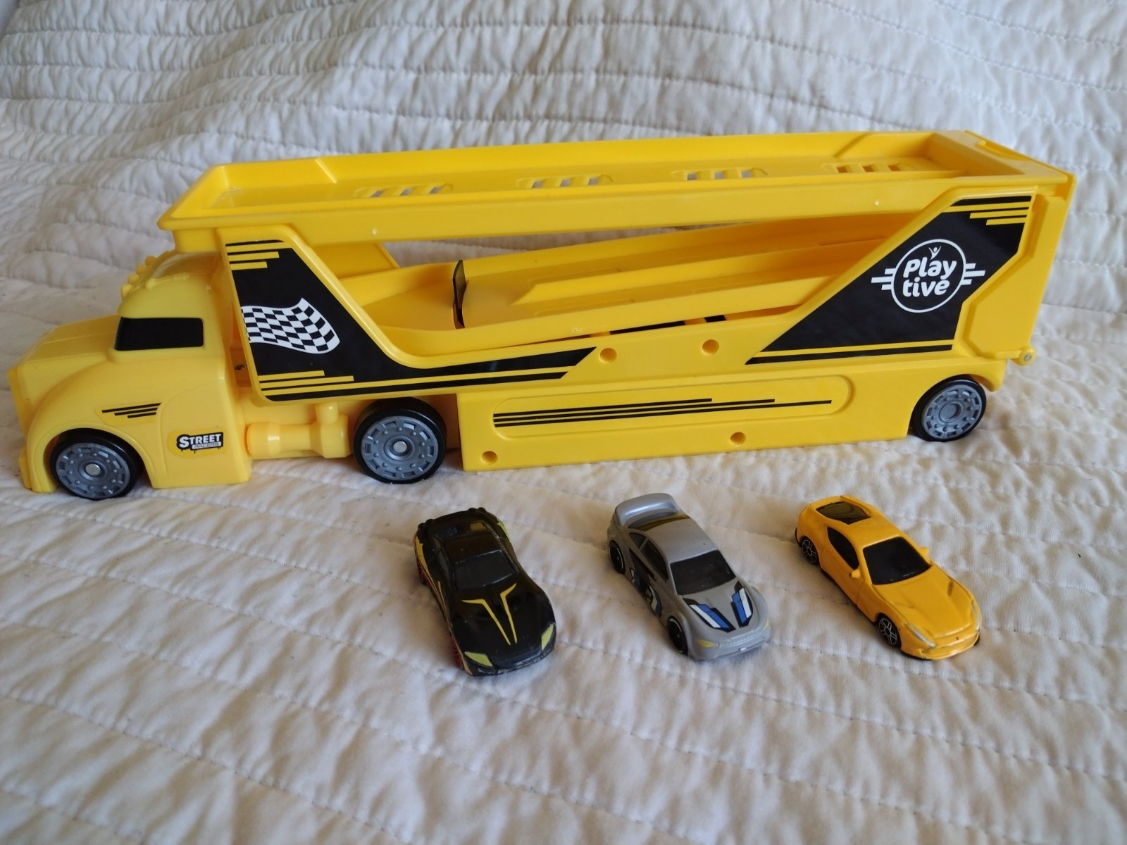 Ťahač s návesom a autíčkami z kvalitného plastu, s odpaľovacou rampou a ložnou plochou až pre 14 vozidiel s tromi autami. Obsah: 1 ťahač, 1 náves, 3 autá Kombinovateľné s ďalšími súpravami od Playtive a sveta Playtive Racers Kompatibilné s bežnými autami zo zinkovej liatiny.