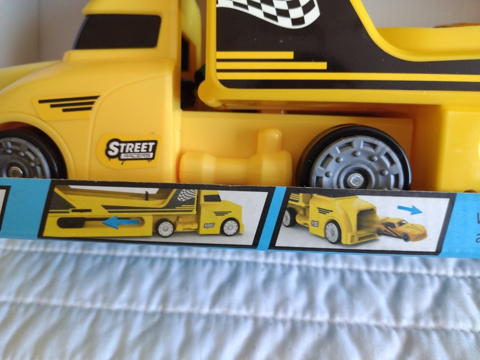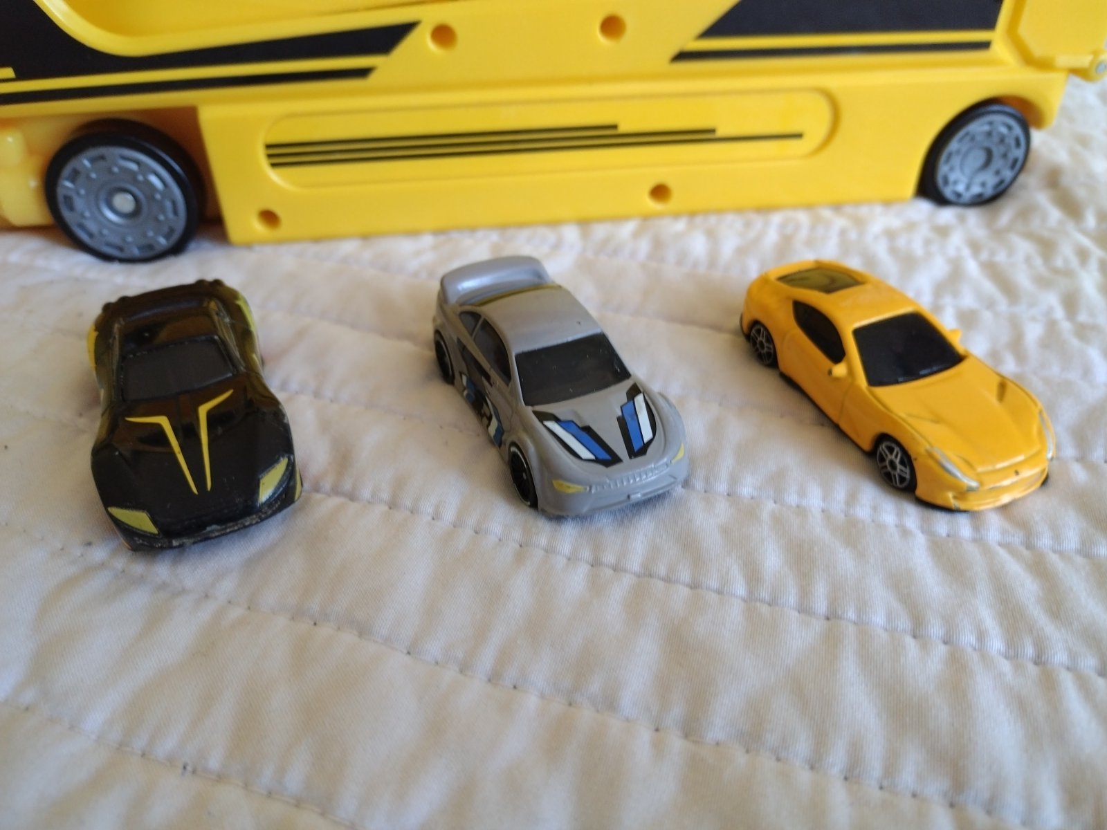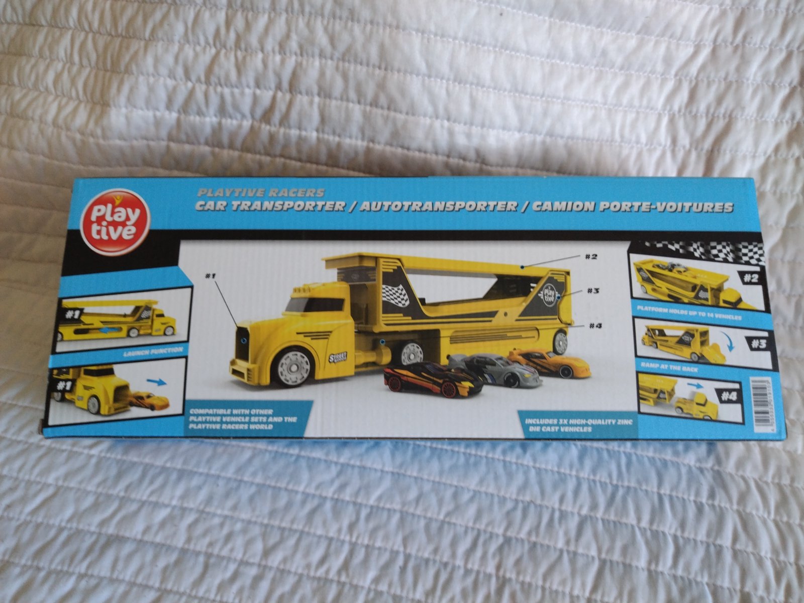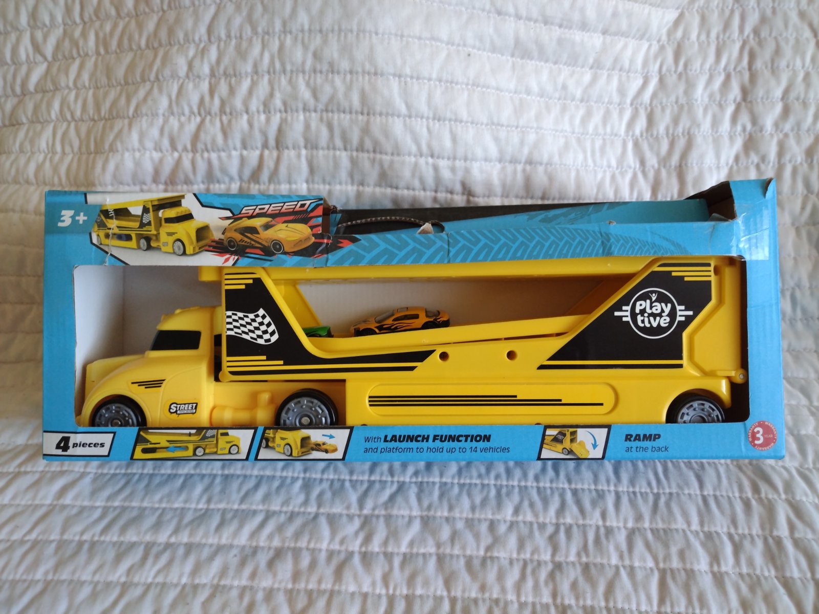 Ťahač s návesom a autíčkami z kvalitného plastu, s odpaľovacou rampou a ložnou plochou až pre 14 vozidiel s tromi autami. Obsah: 1 ťahač, 1 náves, 3 autá Kombinovateľné s ďalšími súpravami od Playtive a sveta Playtive Racers Kompatibilné s bežnými autami zo zinkovej liatiny.