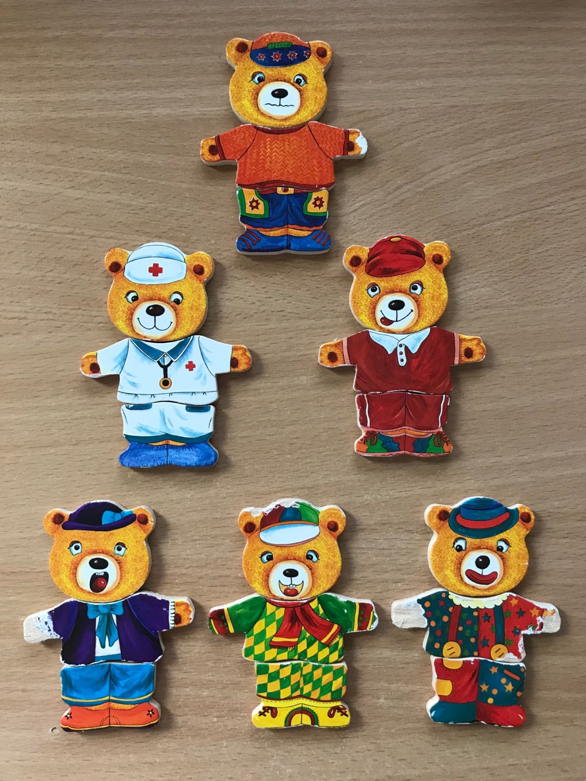 Rozmer krabičky 10,5cm x 9cm, 6 macíkov ktorých oblečenie sa dá meniť, spodní majú trochu olupnuté rúčky vid. foto