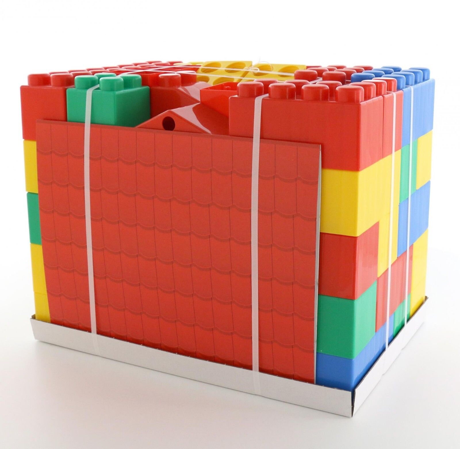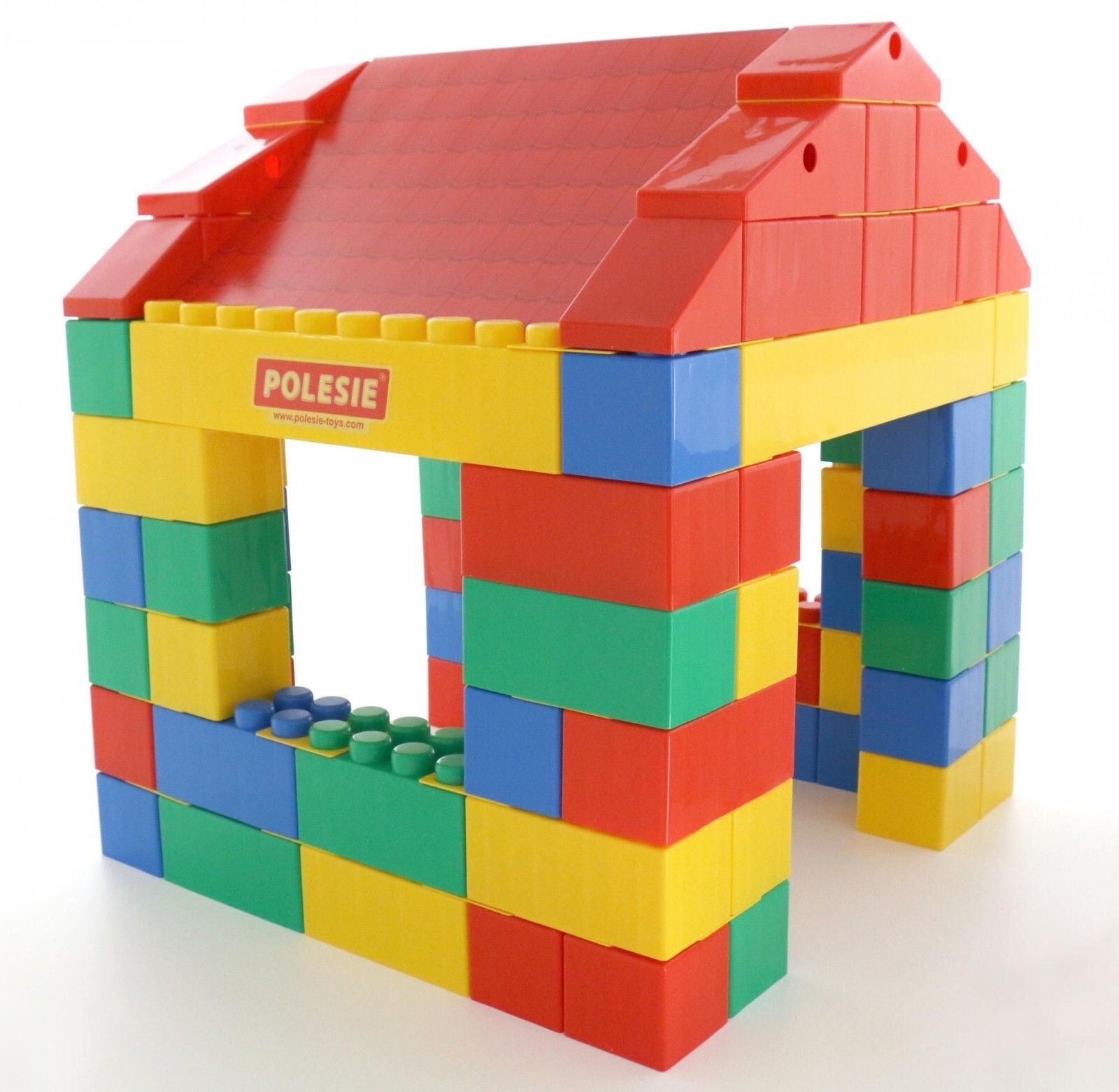 Wader Stavebnica XXL Domček obsahuje 134 dielov, má farebné časti s rozmermi 21,5x10,5x12 cm a 10,5x10,5x12 cm strešné časti a krajné koncové časti.