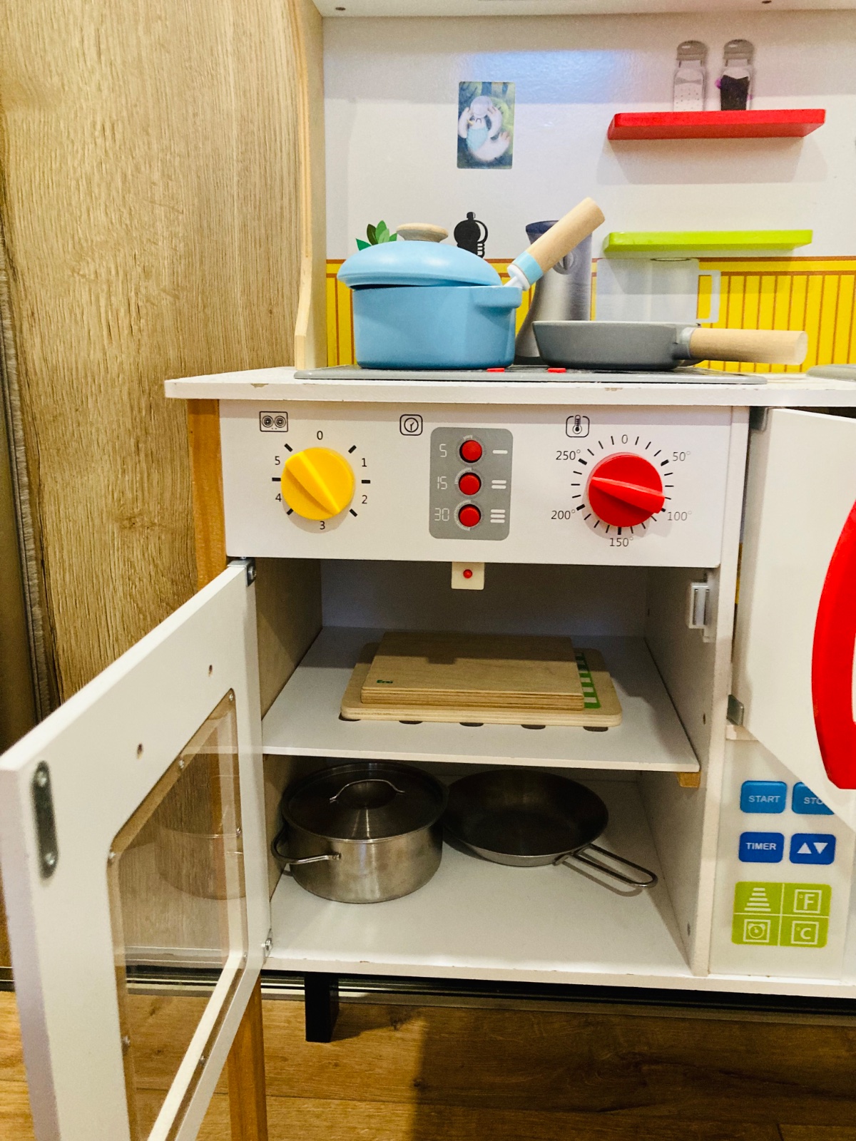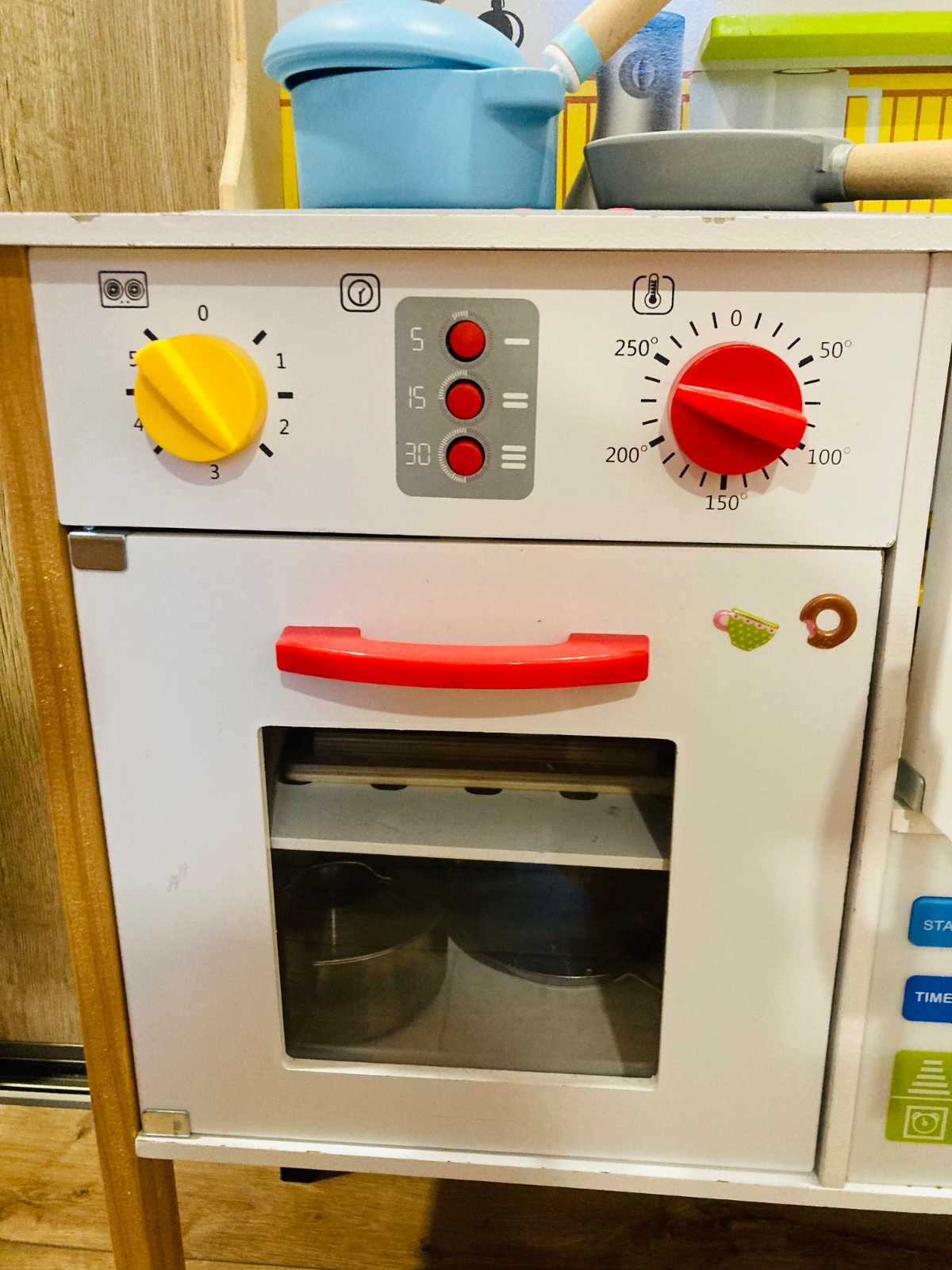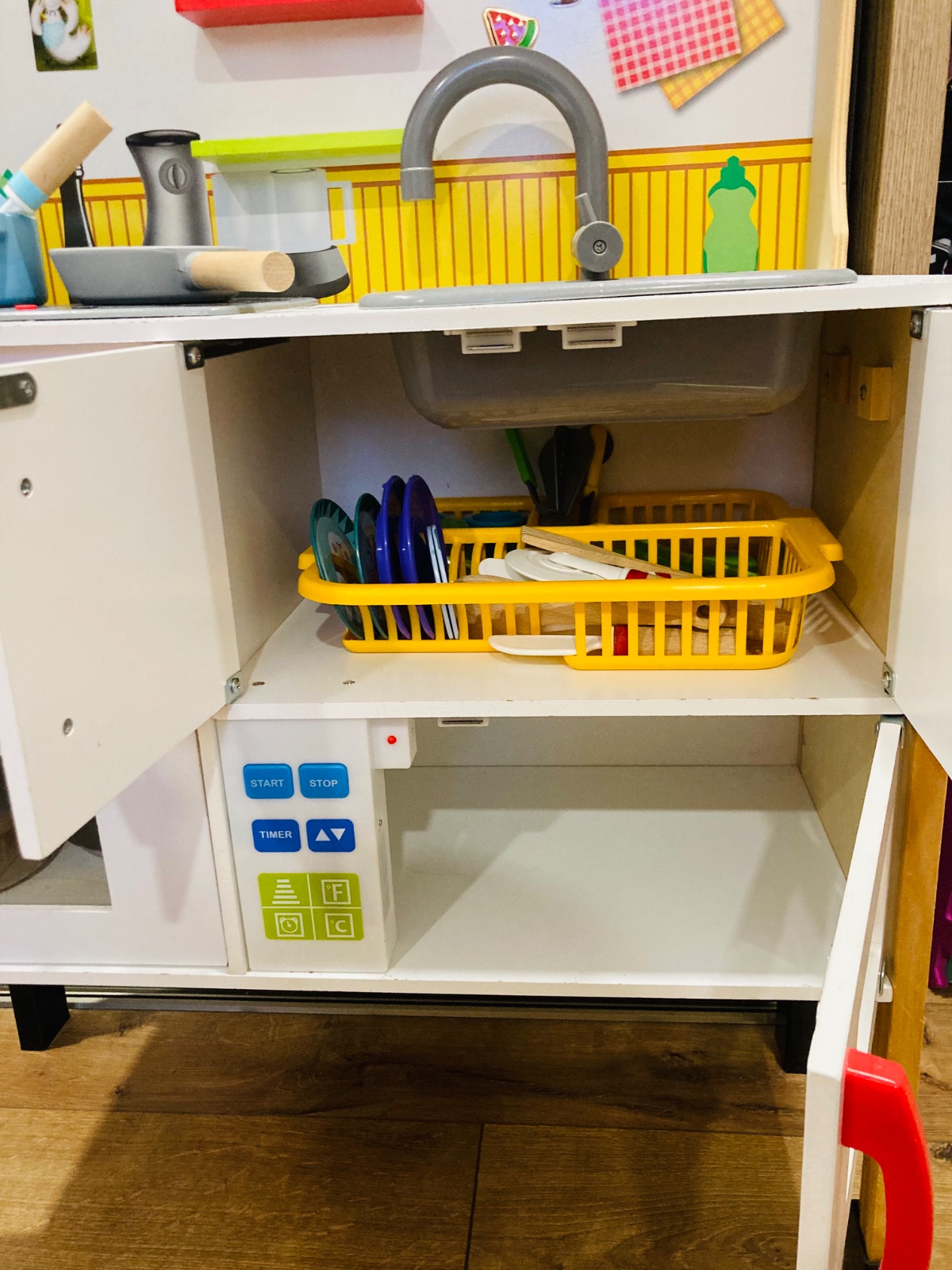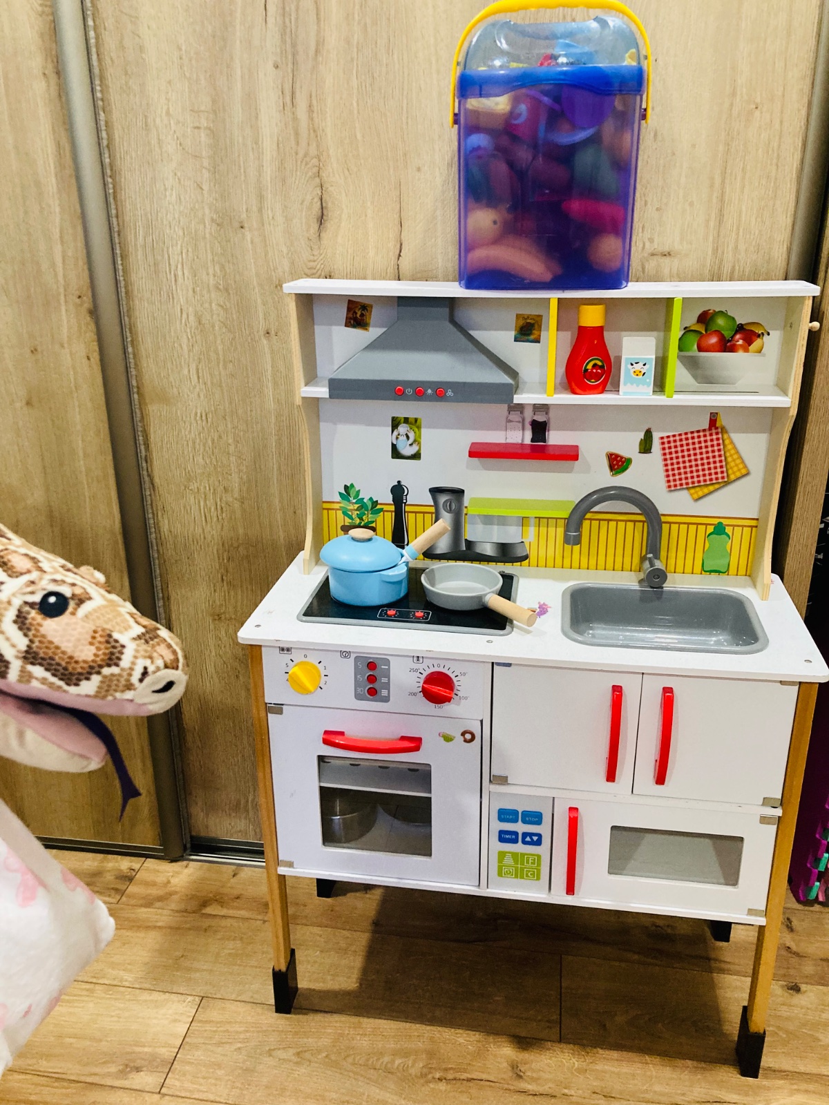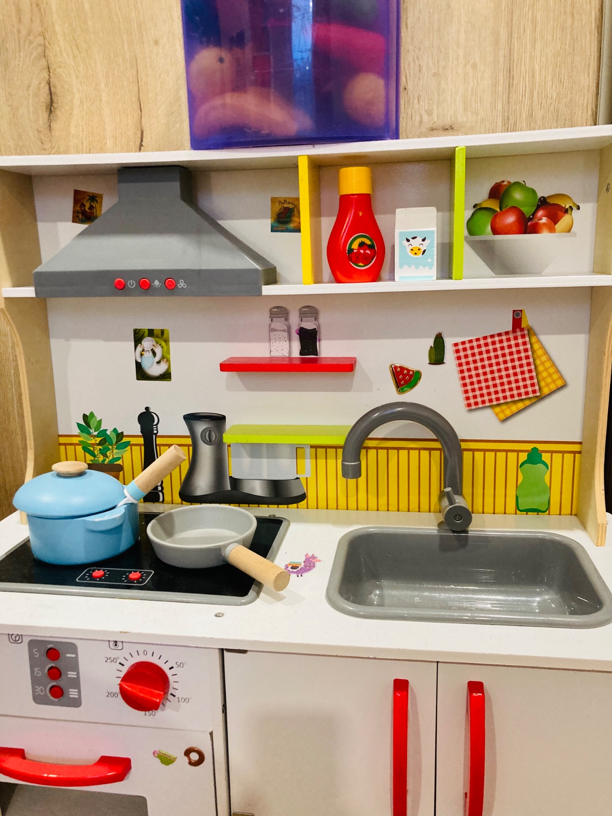 K nej vela doplnkov na hranie ako hrnce,panvice,drevené aj plastové jedlo,ovocie,zelenina,mlieko syry steaky,parky,ryby,príbory,taniere.......