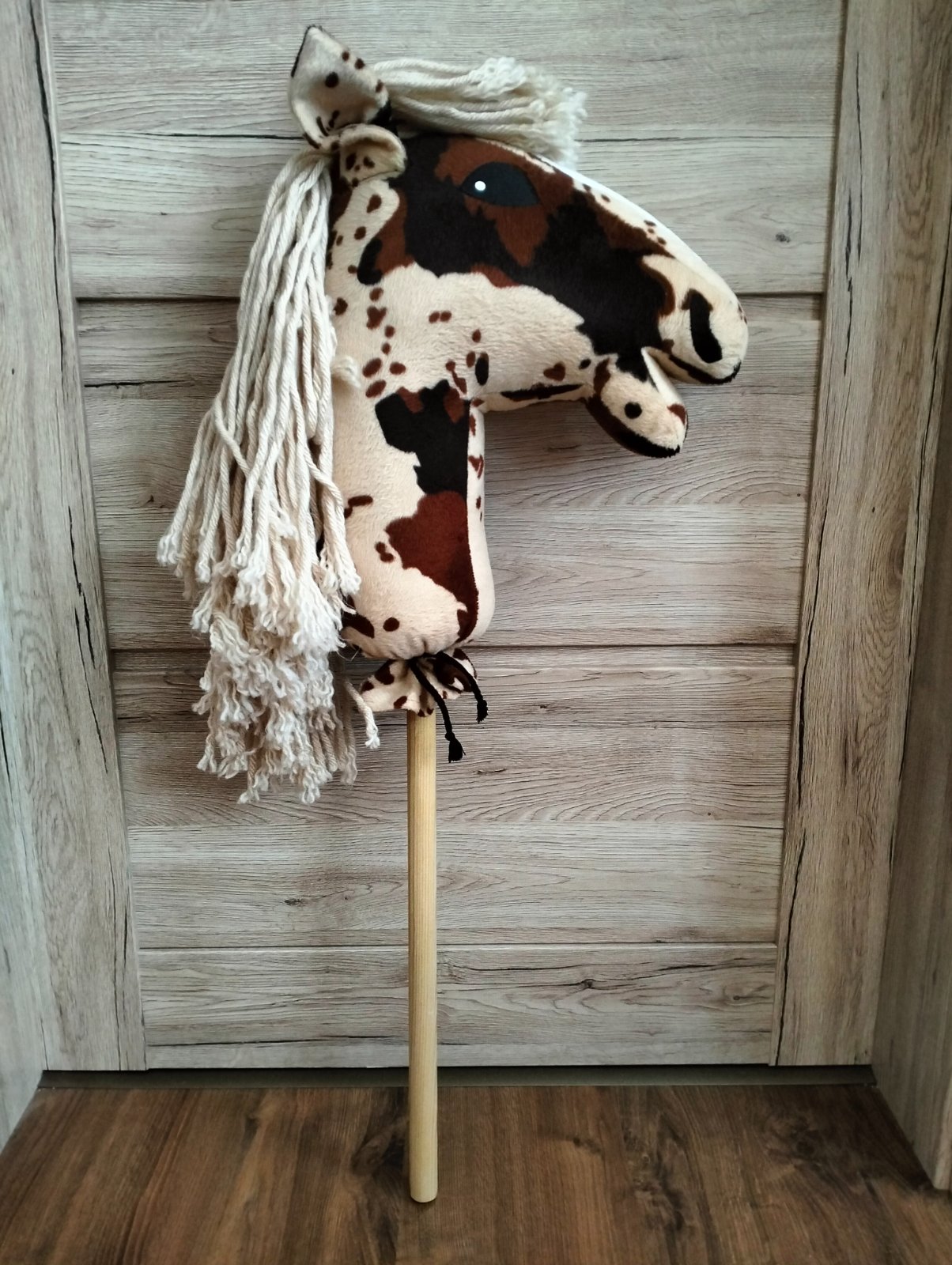 Krásny koník na paličke,dali sme si ho vyrobiť,látka je niečo ako plyš,vyška 84cm+ušká, výška hlavy=39cm,dl.hlavy od ušiek po ústa=39cm, výborný stav,PC=cca do 50€
