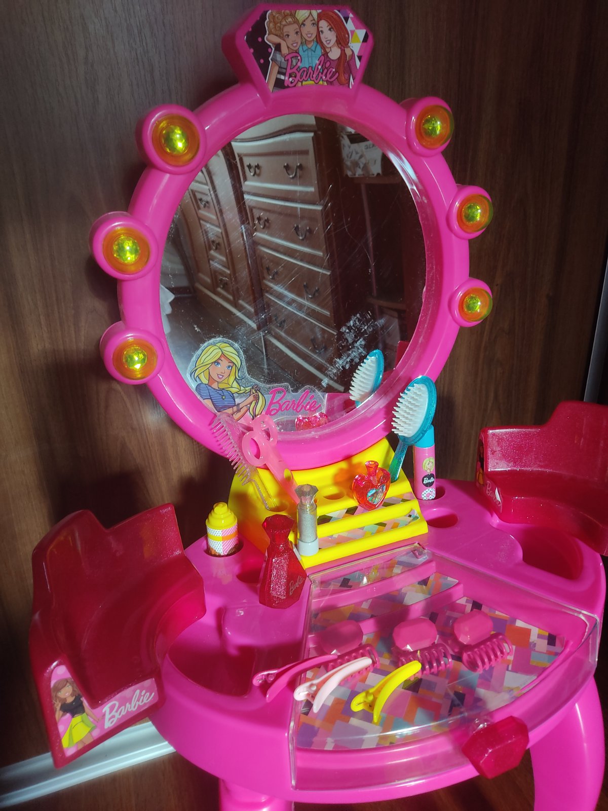 Predám toaletný stolík s príslušenstvom v dobrom stave, pôvodná cena 50e, má známky opotrebenia, ale len trochu na nálepkách, súprava obsahuje pôvodné drobnosti ako hrebeň, kefa na vlasy, sponky atď a originál krabicu, za 12e.