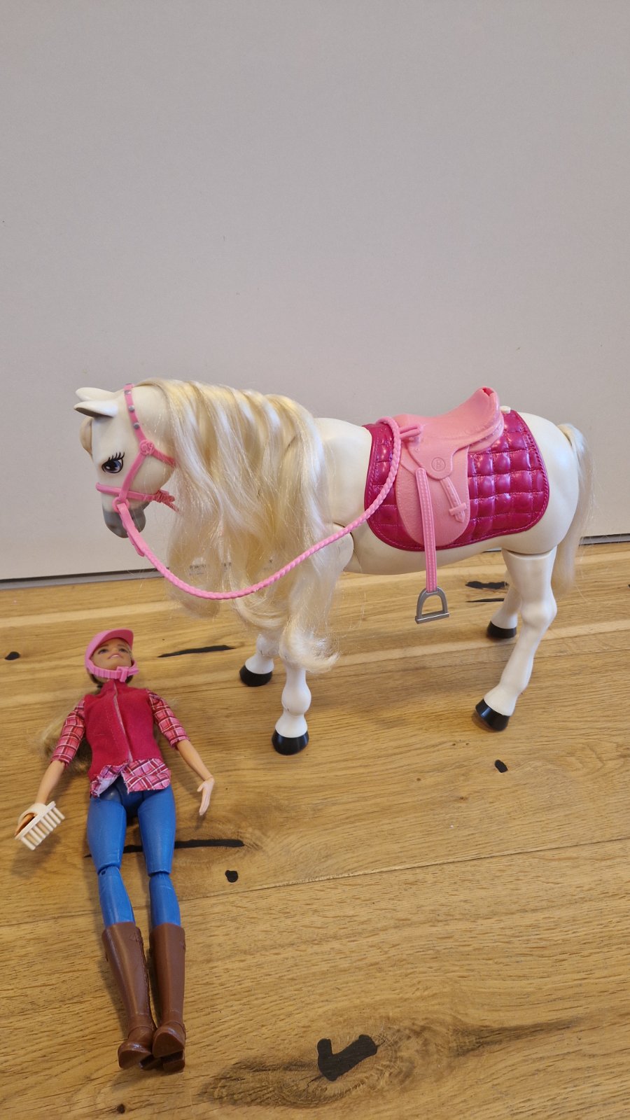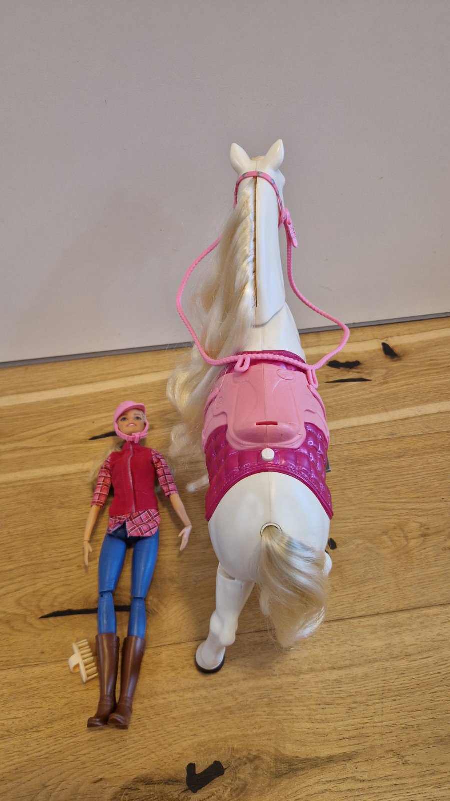 Konik chodi, hra pesnicky, kyva hlavou , otaca sa, atd, reaguje na dotyky, zvuky aj tlacitka. Vzadu na sedle chyba plastovy drziak na barbinu.