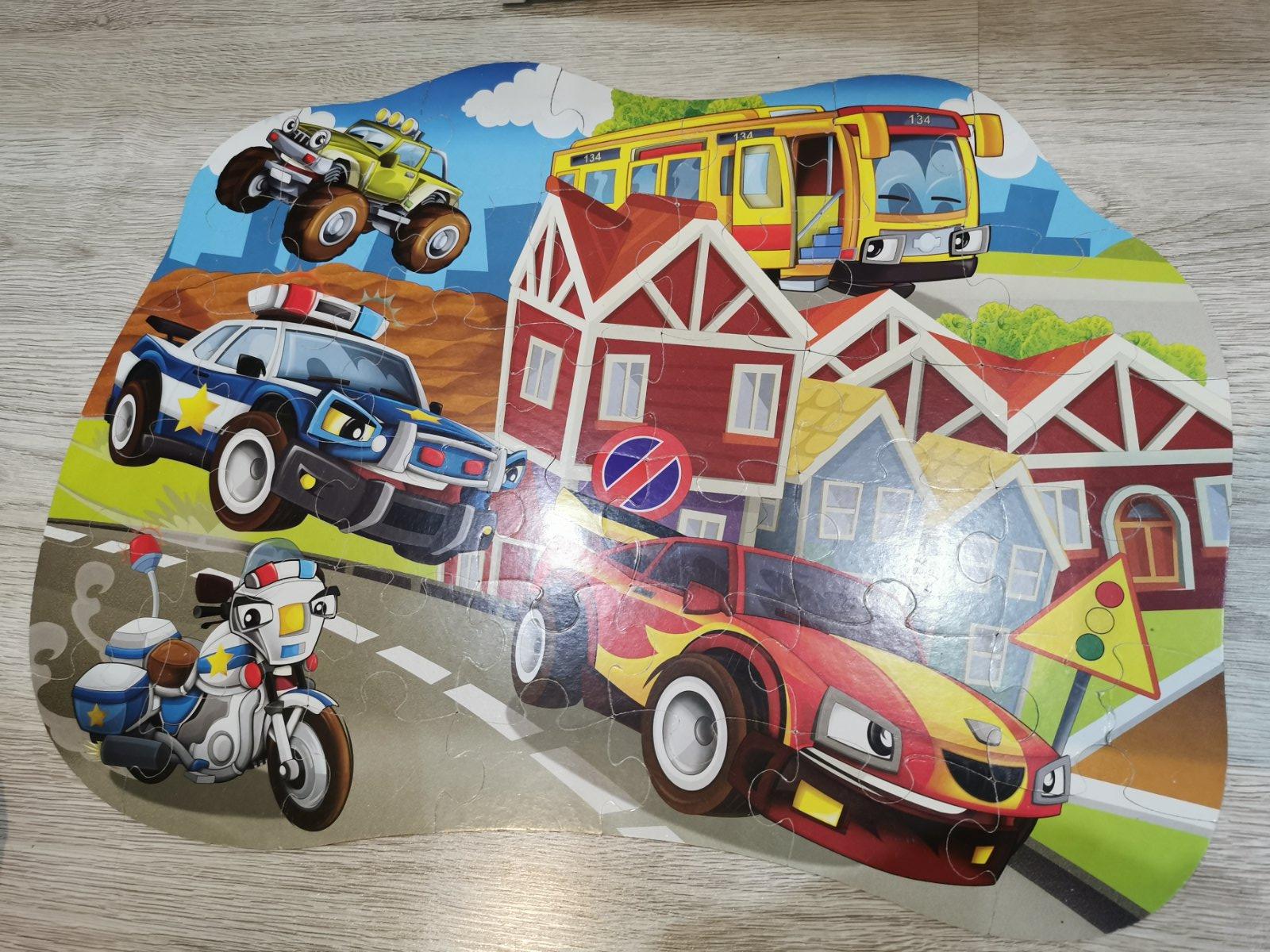 Veľké puzzle z ktorého sa dajú poskladať 2 rôzne obrázky. Po zložení je rozmery obrázka cca 40x60cm. Puzzle v dobrom stave akurát na 1 puzzle je trochu poškodenie, viď foto, ale obrázok sa dá poskladať.V