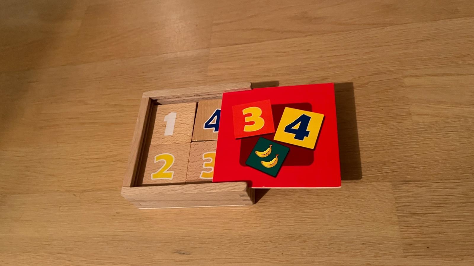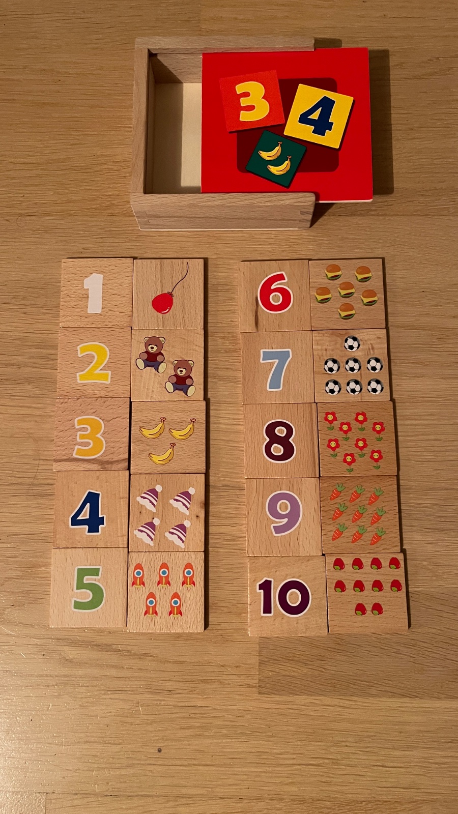 Drevené kartičky pre predškolákov príp. prváčikov uskladnené v praktickej drevenej krabičke. Vhodné na precvičovanie základov matematiky.