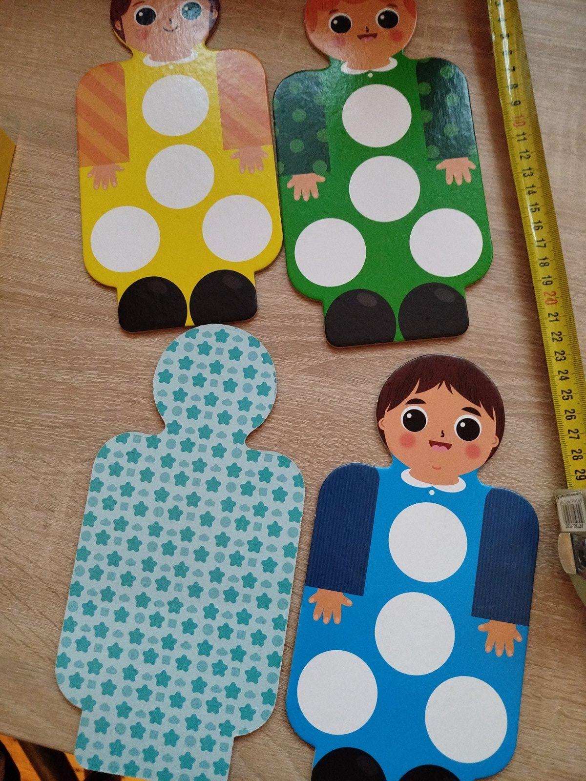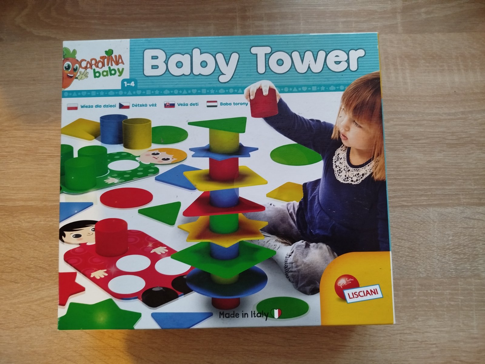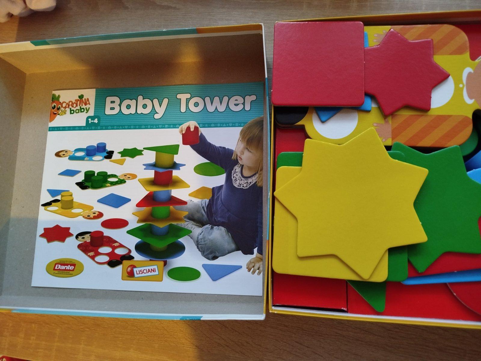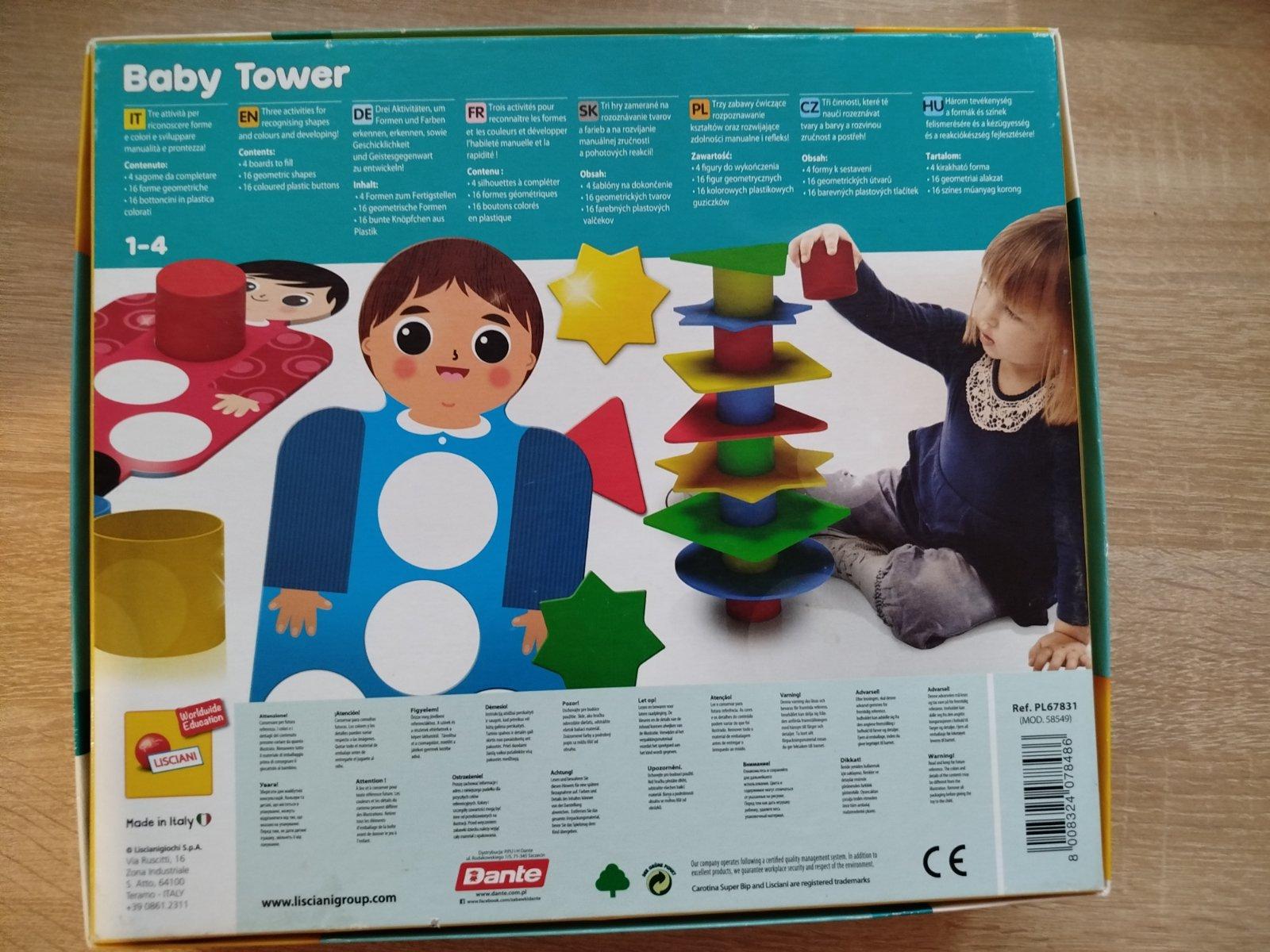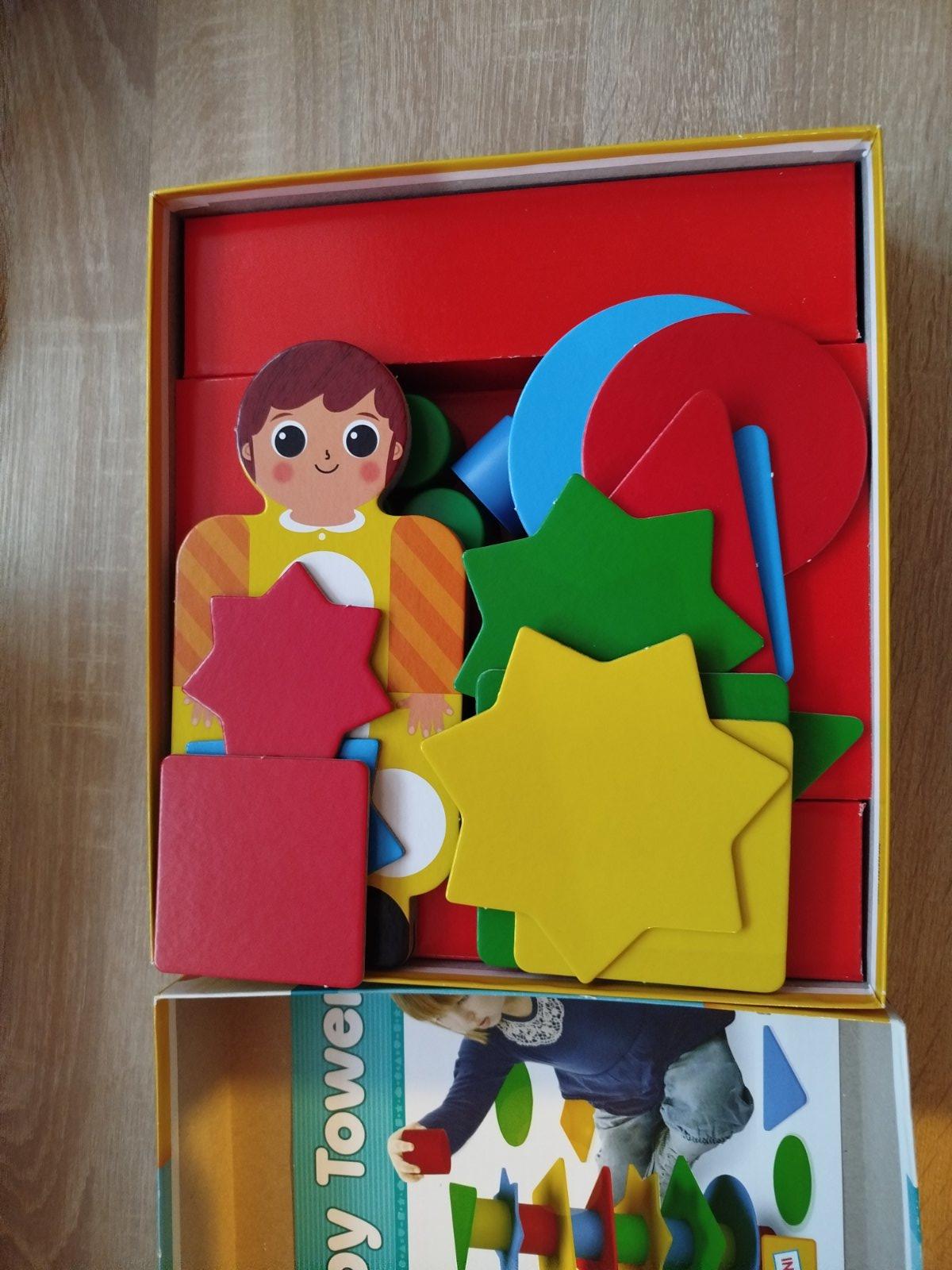 Zahŕňa kartónové puzzle, geometrické tvary a plastové valčeky na stavbu veže.