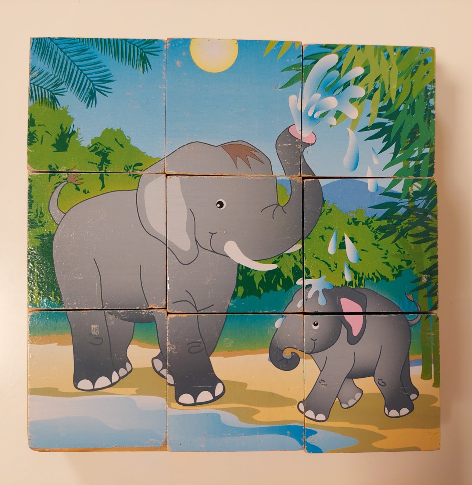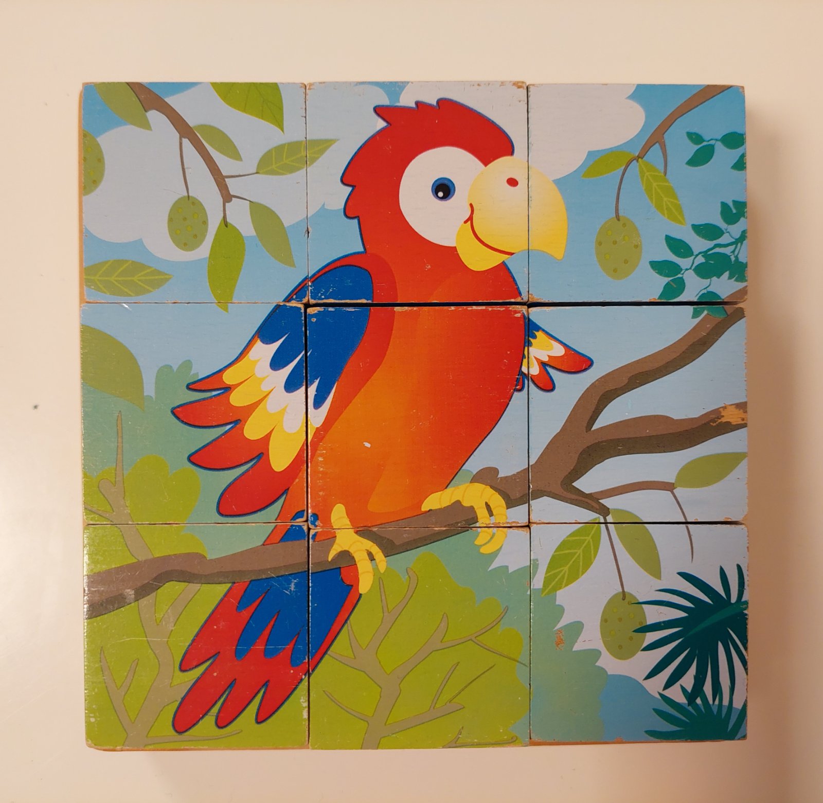 Balíček obsahuje 1x drevenú skladačku - vežu (krúžky sa ukladajú na drevený kolík), 2x pexeso, 1x skladačka z drevených kociek (obrázky sú nafotené v galérii k inzerátu: tiger, lev, opice, papagáj, slony, žirafy).