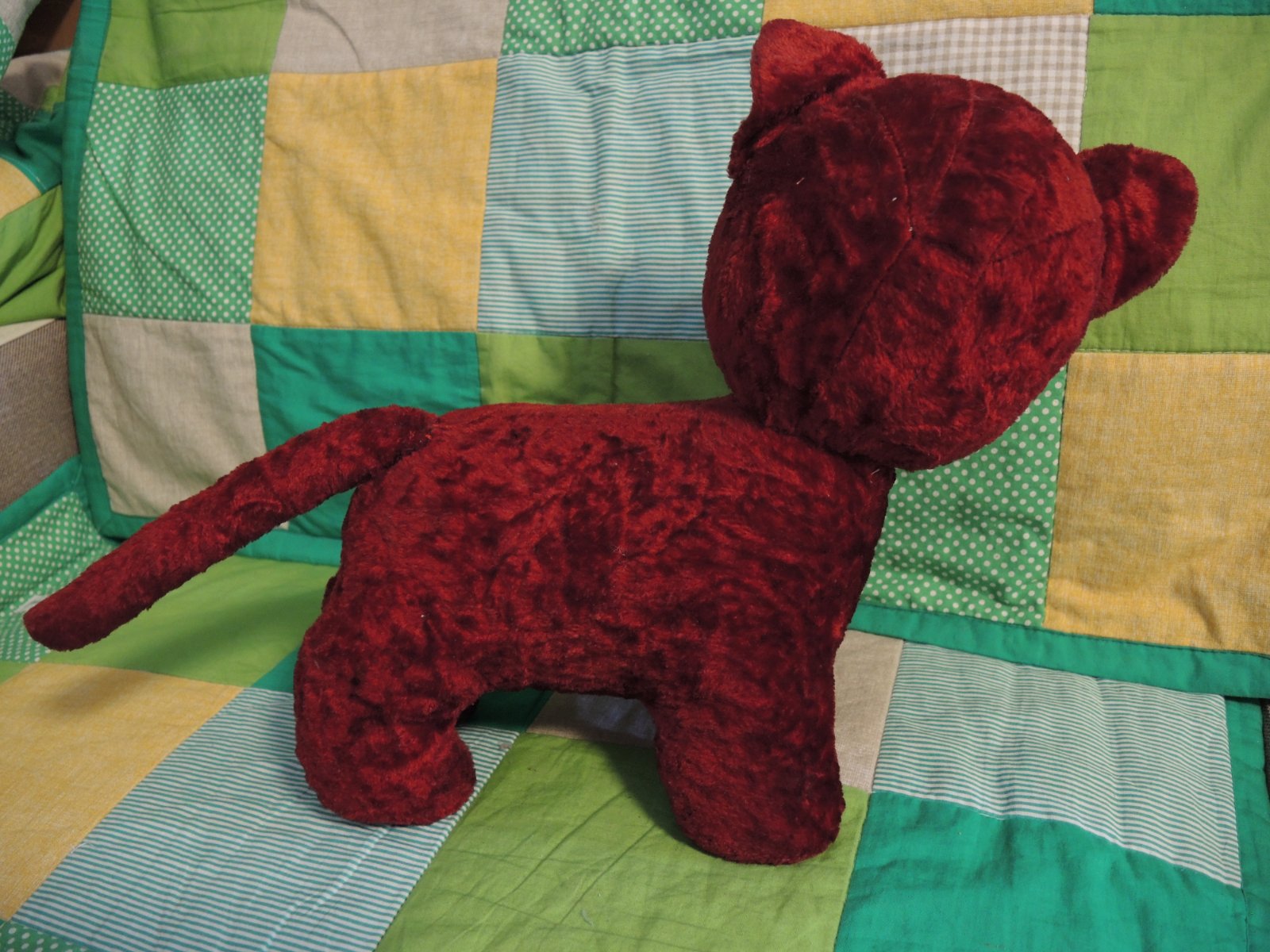 Predám krásnu väčšiu retro mačičku. Farba je tmavo bordová. Tmavšia ako na foto. Na svoj vek je vo veľmi krásnom stave .... U nás bola nehraná a vystavená na poličke. Je v top stave. Na šírku je od uška k poslednej labke 36 cm. Nemerala som chvostík. A na výšku 32 cm. Roztomilá.
