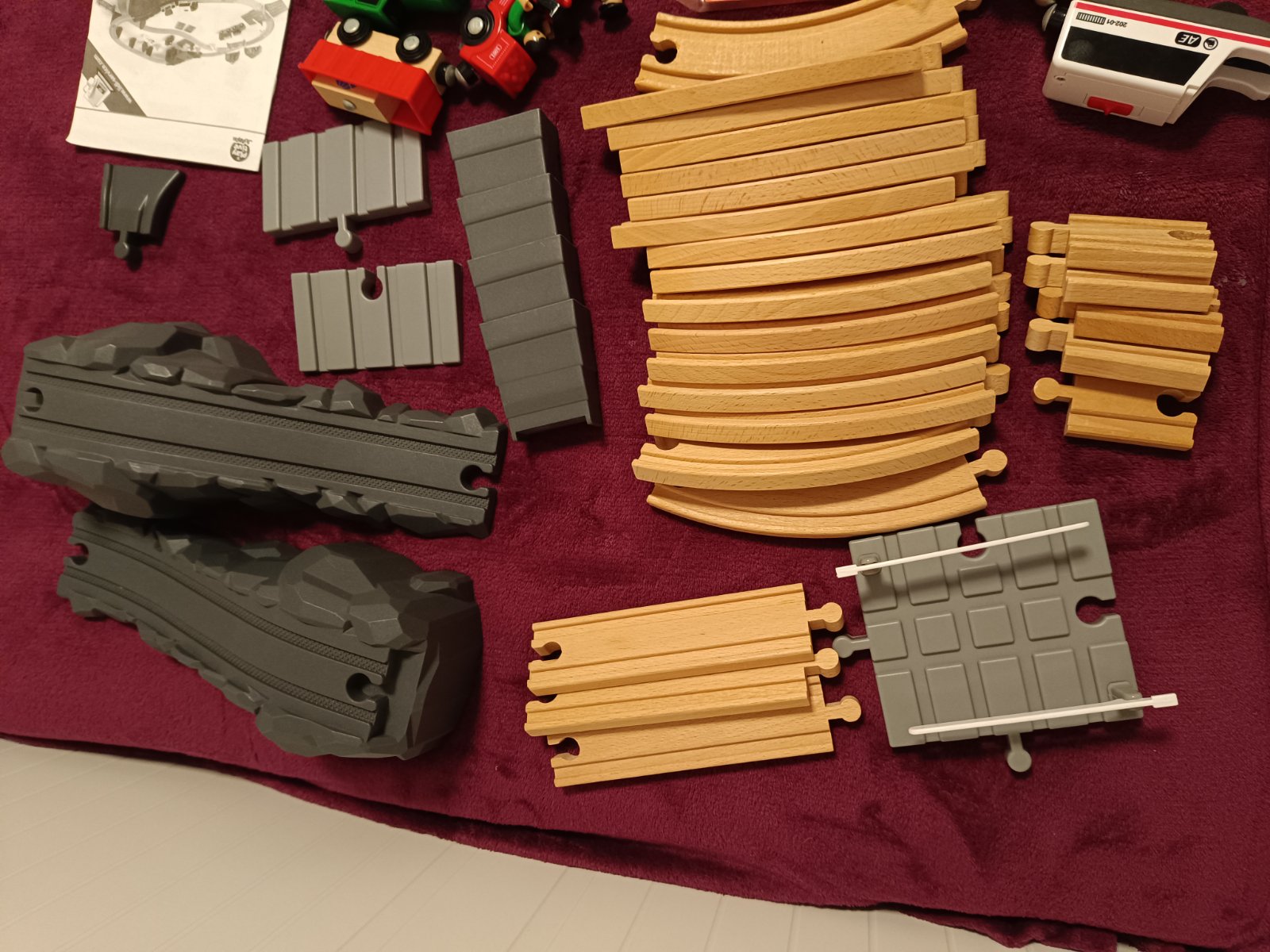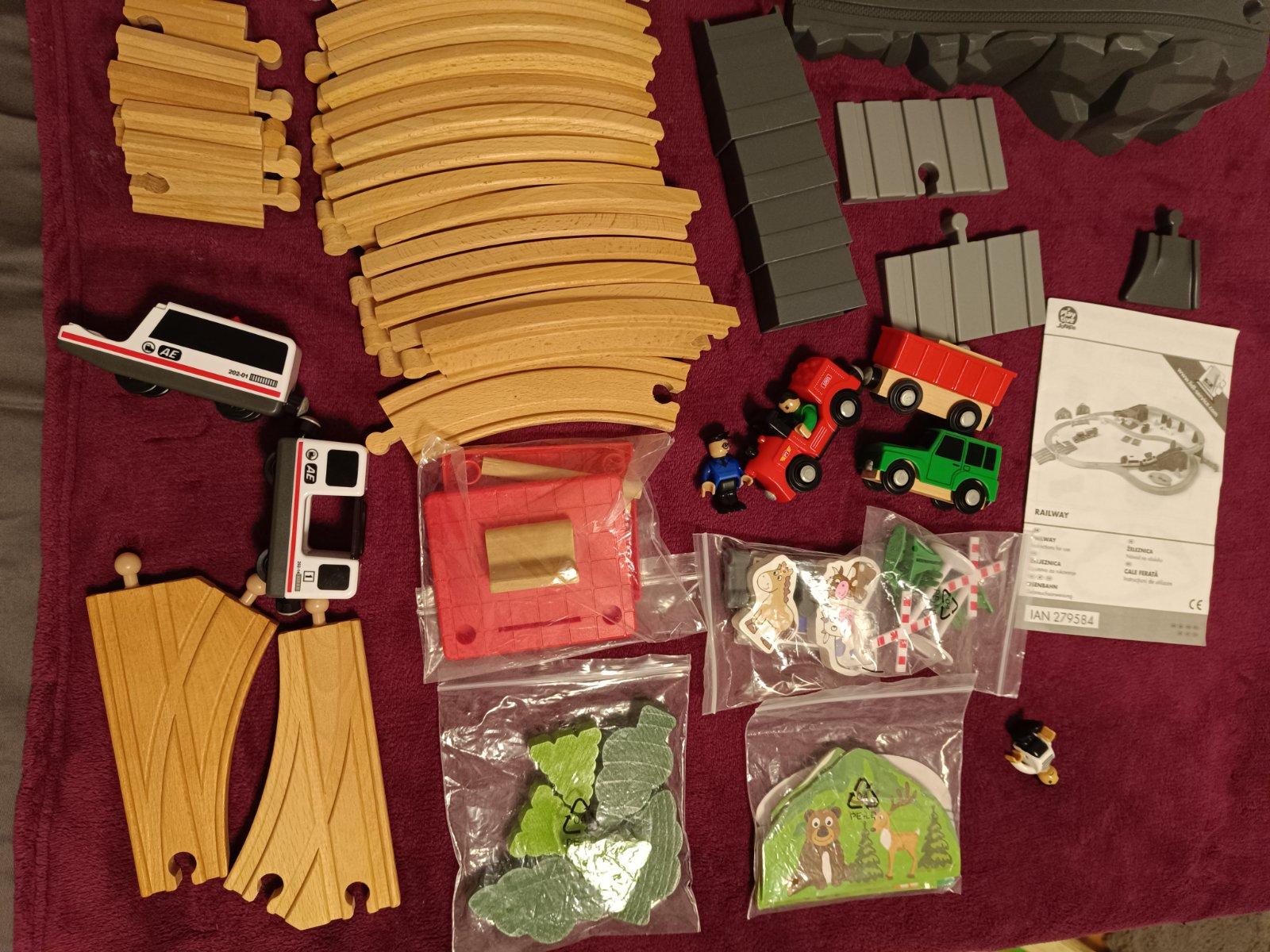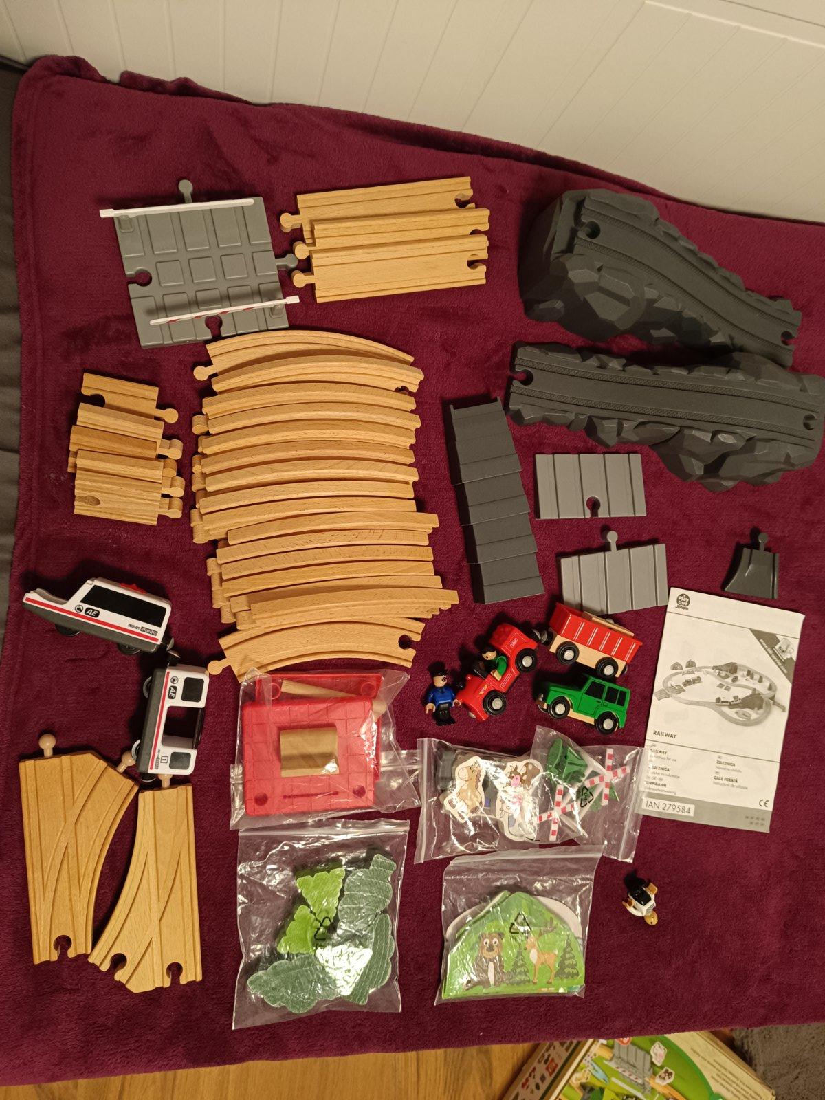 všetky časti na fotke, kompletné balenie, krabica trošku zlepena, jeden dielik pridávam grátis - posledná foto, nie je v originál baleni, vláčik nefunguje - možno budete vedieť opraviť, vie si ho dieťa tlačit po kolajnici