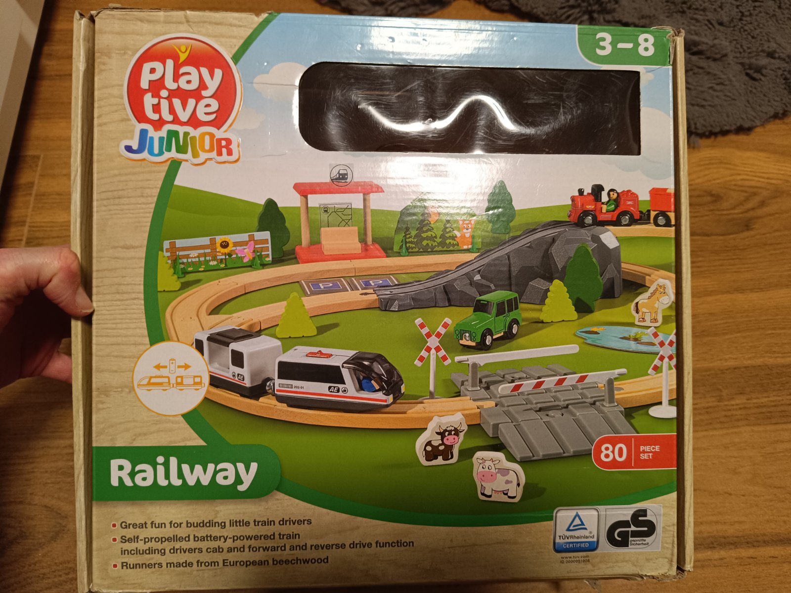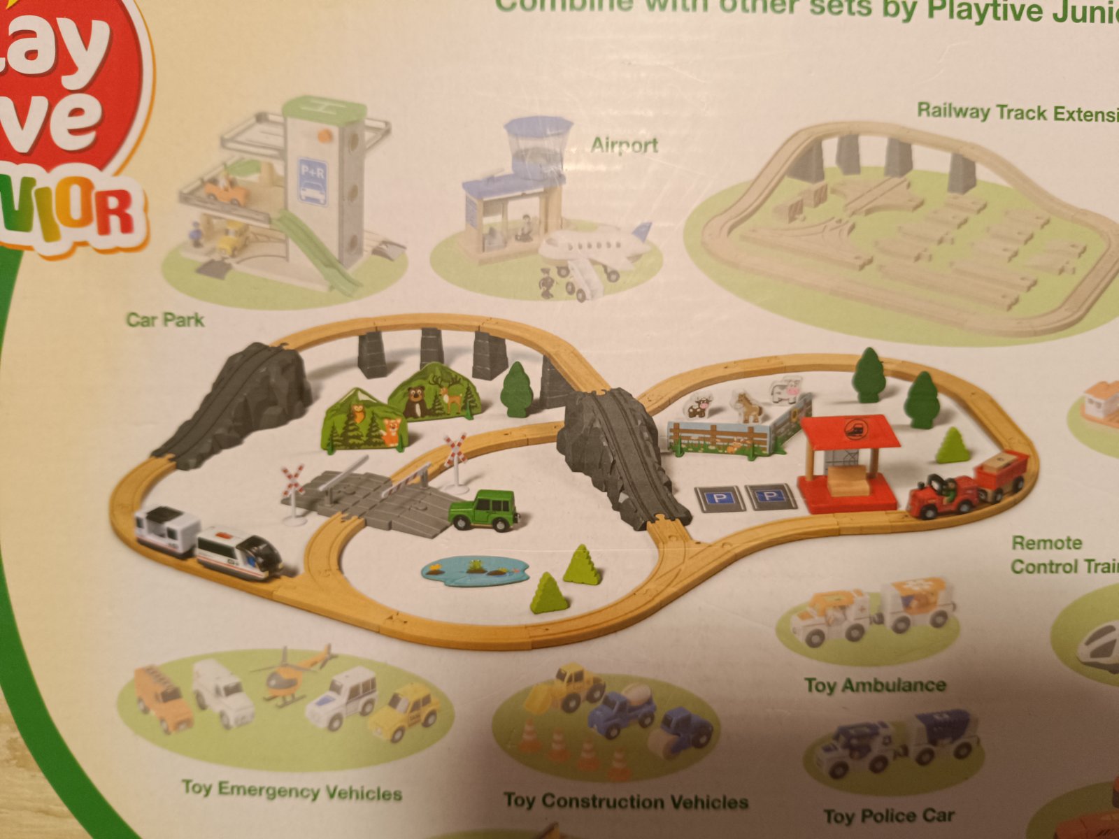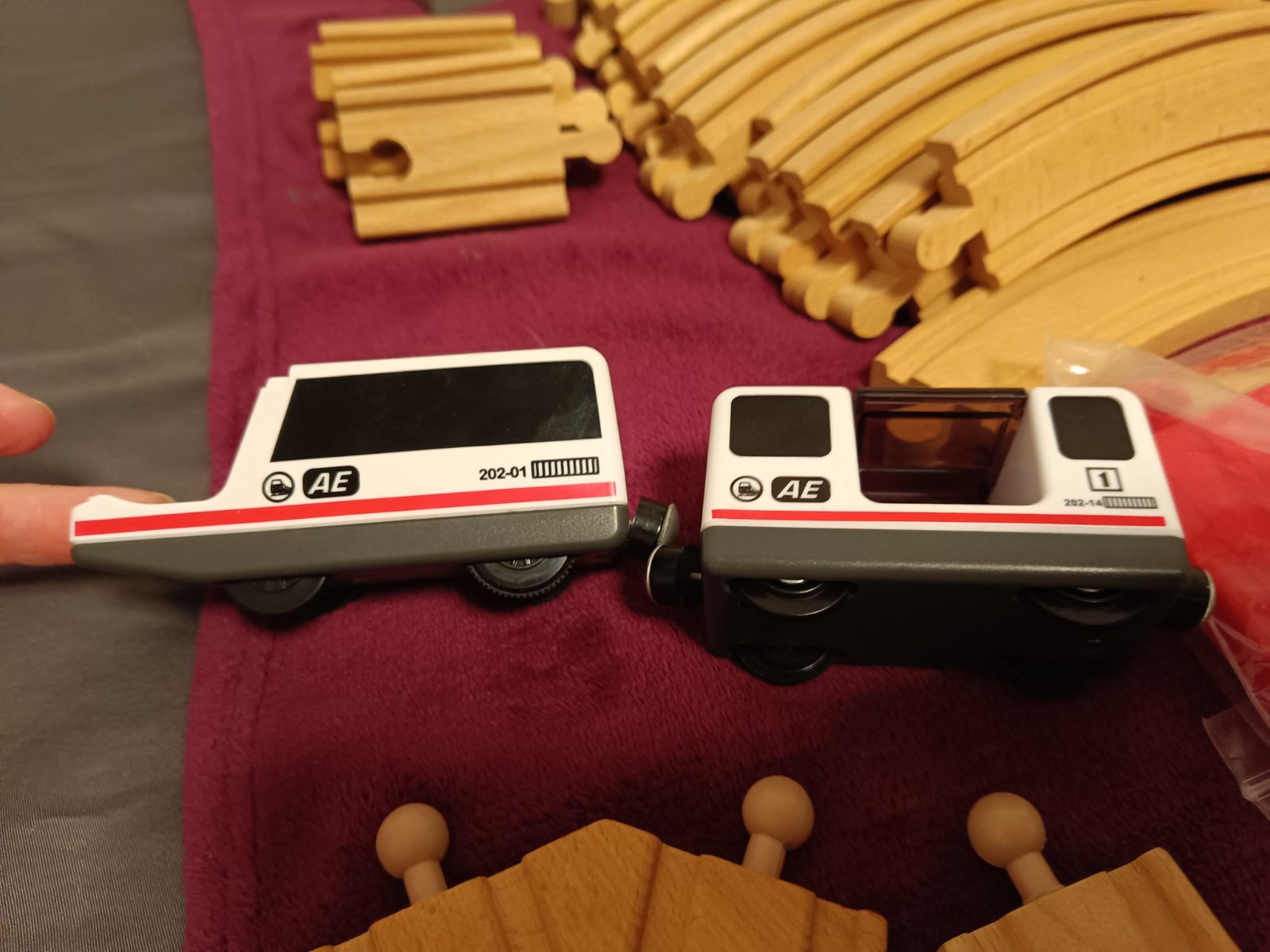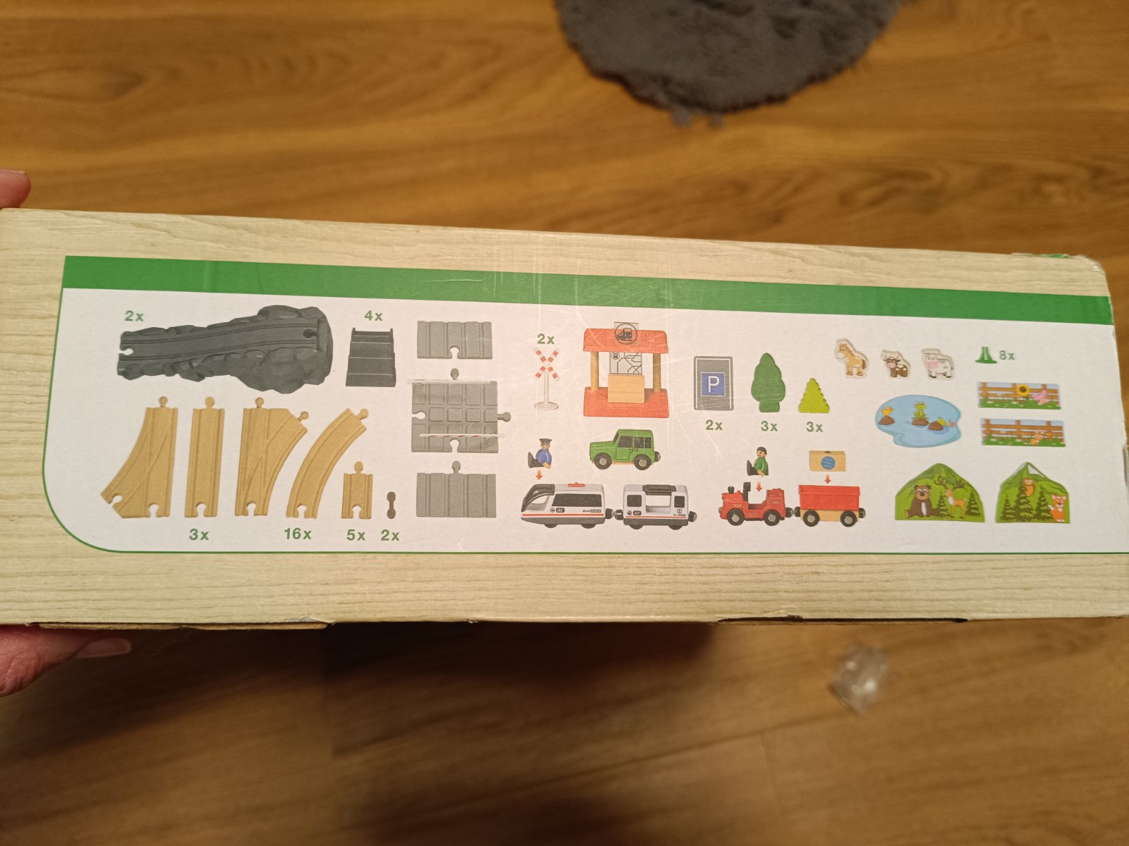 všetky časti na fotke, kompletné balenie, krabica trošku zlepena, jeden dielik pridávam grátis - posledná foto, nie je v originál baleni, vláčik nefunguje - možno budete vedieť opraviť, vie si ho dieťa tlačit po kolajnici