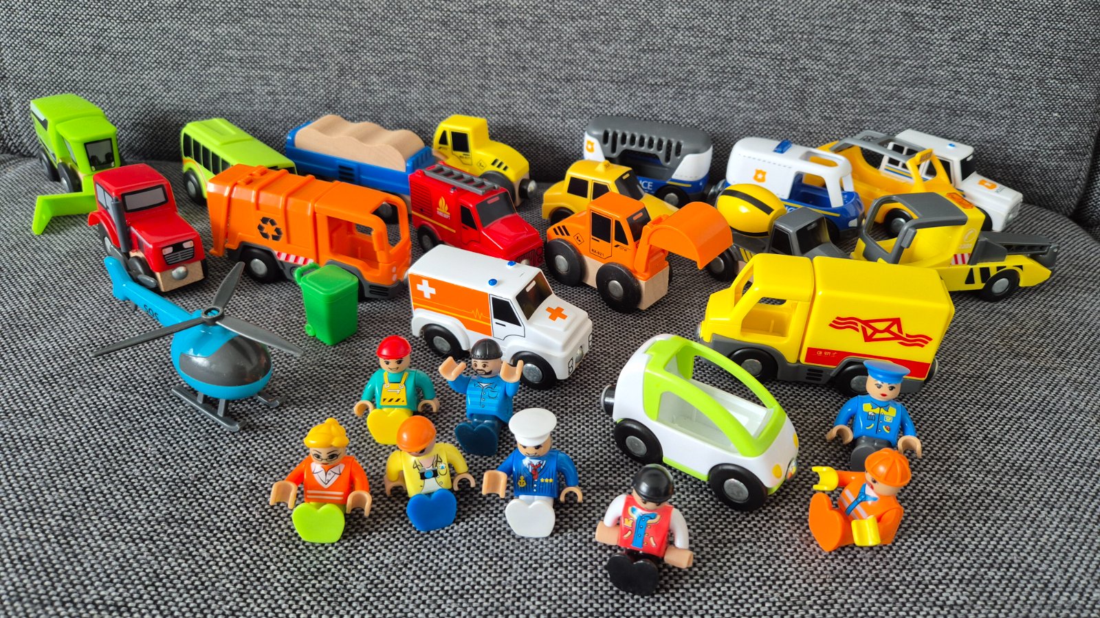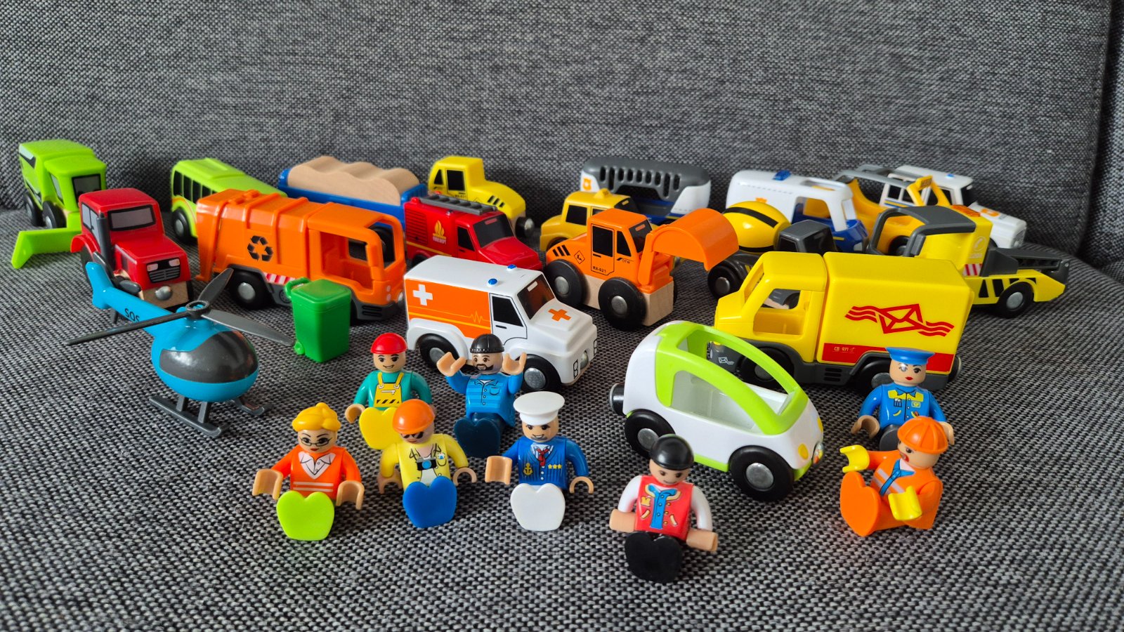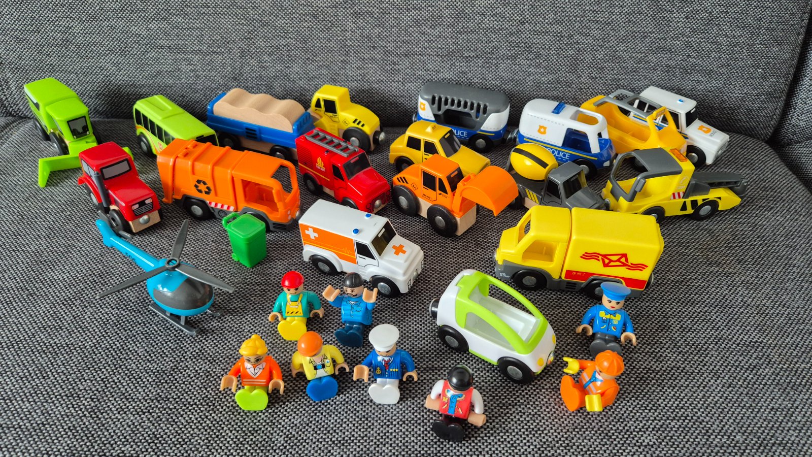 Plastové dopravné prostriedky aj s panáčikmi, top stav, na magnety, kompatibilné s tými bežnými drevenými vláčikovými dráhami.