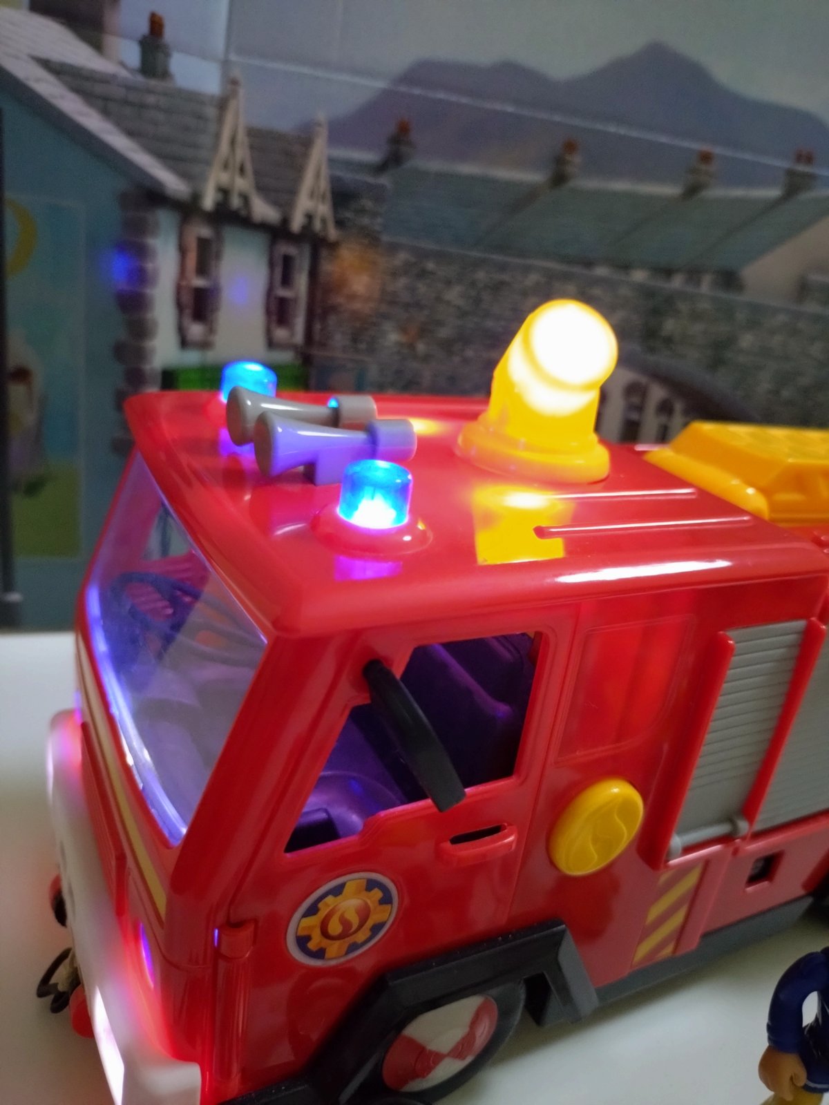 Požiarne auto Jupiter s figúrkami Sama a Elvisa + výbava. Nič nie je zlomené, všetko funkčné, húka, sirény blikajú a reflektor svieti, naviják funguje.