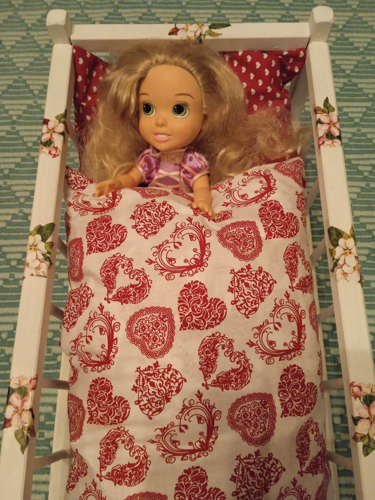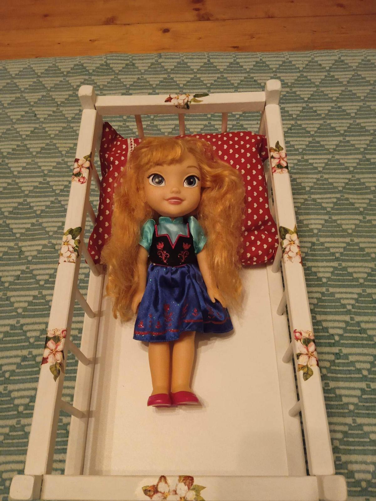 Postielka pre babiky, drevena rucne dekorovana s paplonom a vankusikom, ktore su tiez robene rucne , babiky su iba na porovnanie velkosti, toe oredavame v samostatnom inzerate