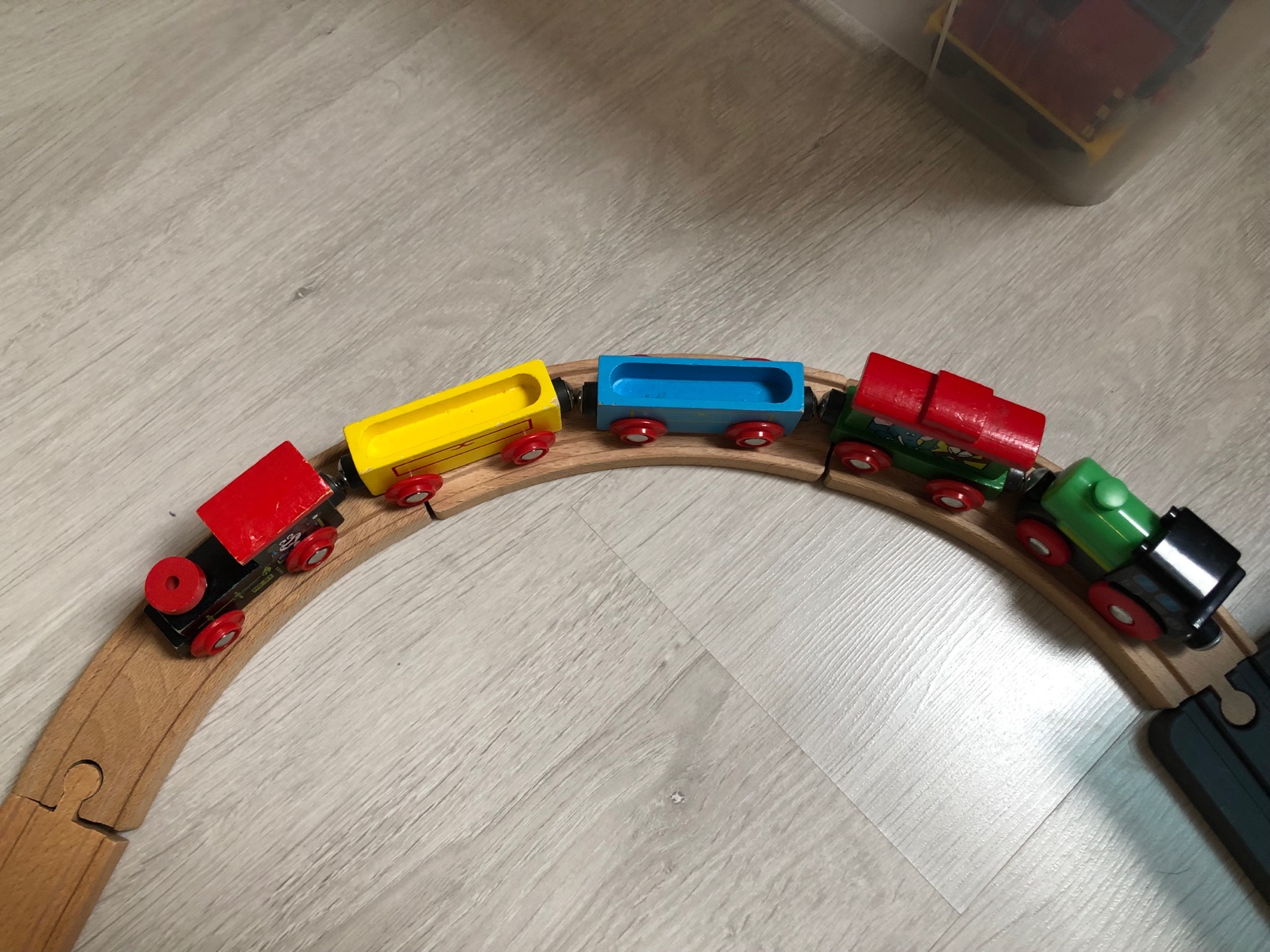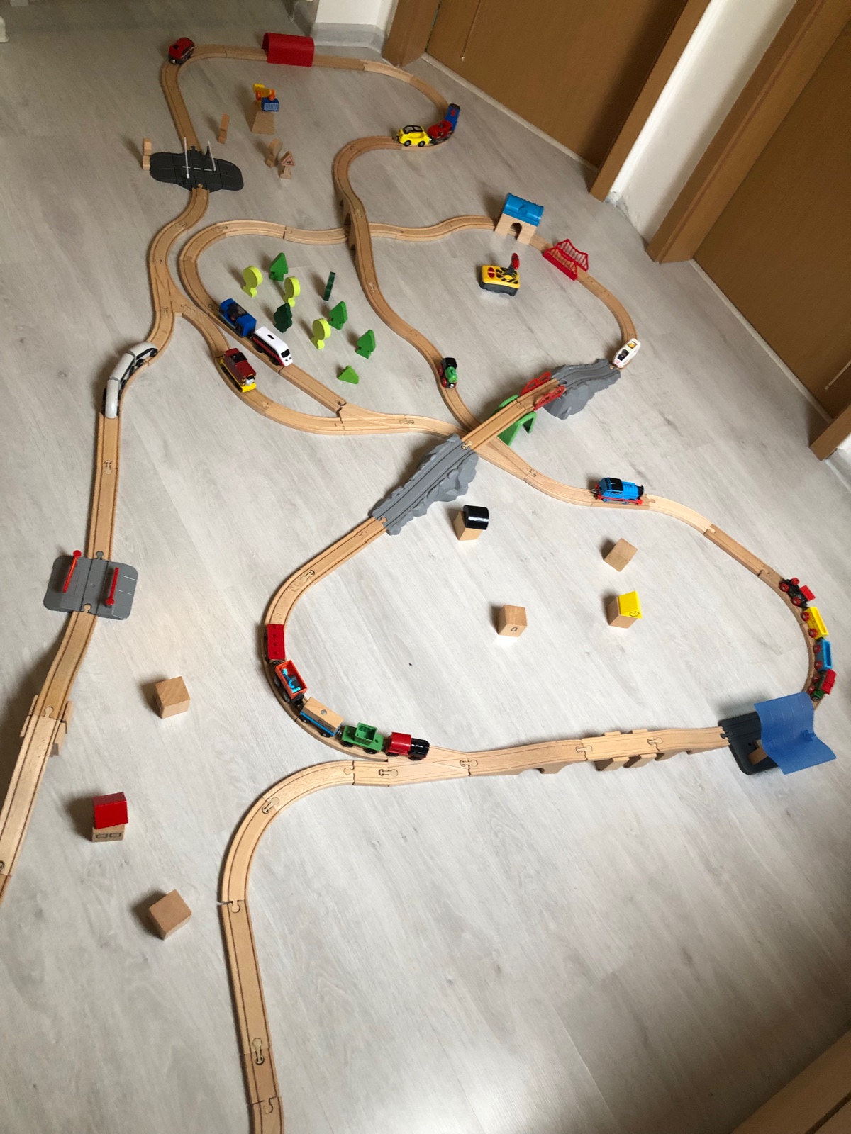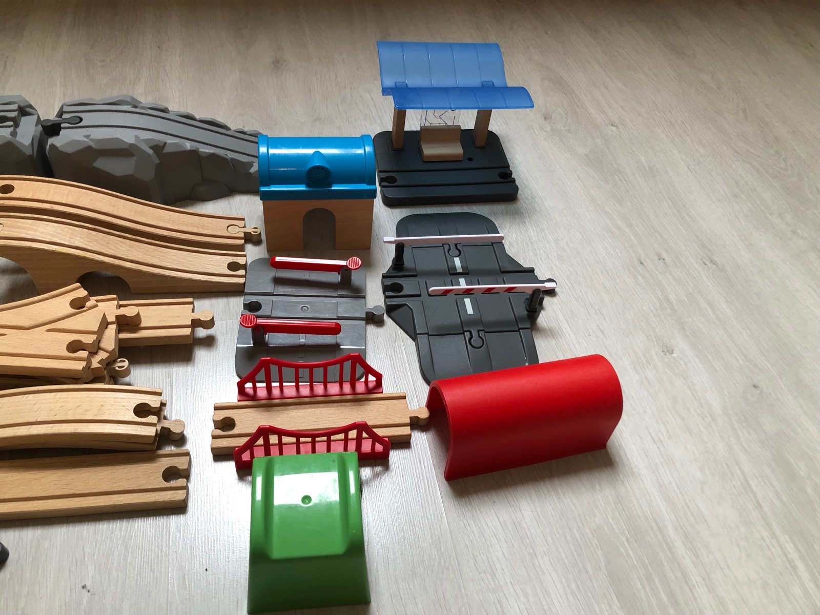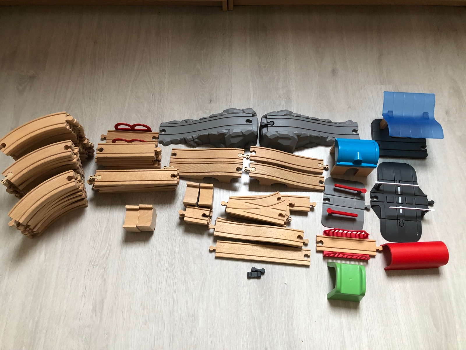 Ponúkam zbierku drevených koľajníc, všetko kompatibilné. pekný hraný stav bez poškodení. Niektoré kusy/sady boli dokupované postupne, je to veľká zbierka a dá sa z nej vytvoriť čokoľvek, stačí len fantázia. 9 stromčekov drev, 4x značka, 7 kociek ako domček, 1x žeriav, 1 x červený vláčik na ovládanie s panáčikom, 1x biely vláčik na baterky s panacikmi, 2x vlak Tomas na baterky, 1x modry vláčik (ide na baterky a ma panáčikov), veľa drevených vlacikov z Ikea,