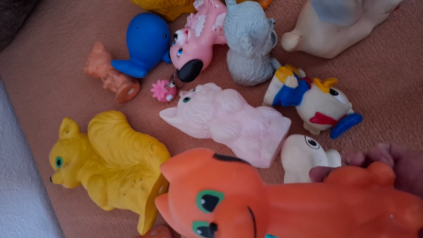 15 ks plastových postavičiek. Veľmi retro postavičky, niektoré ešte aj po stlačení píštia. Veselé farby, pekné tvary, pre malé detičky čisto rozprávkové postavičky. Zachovalé.