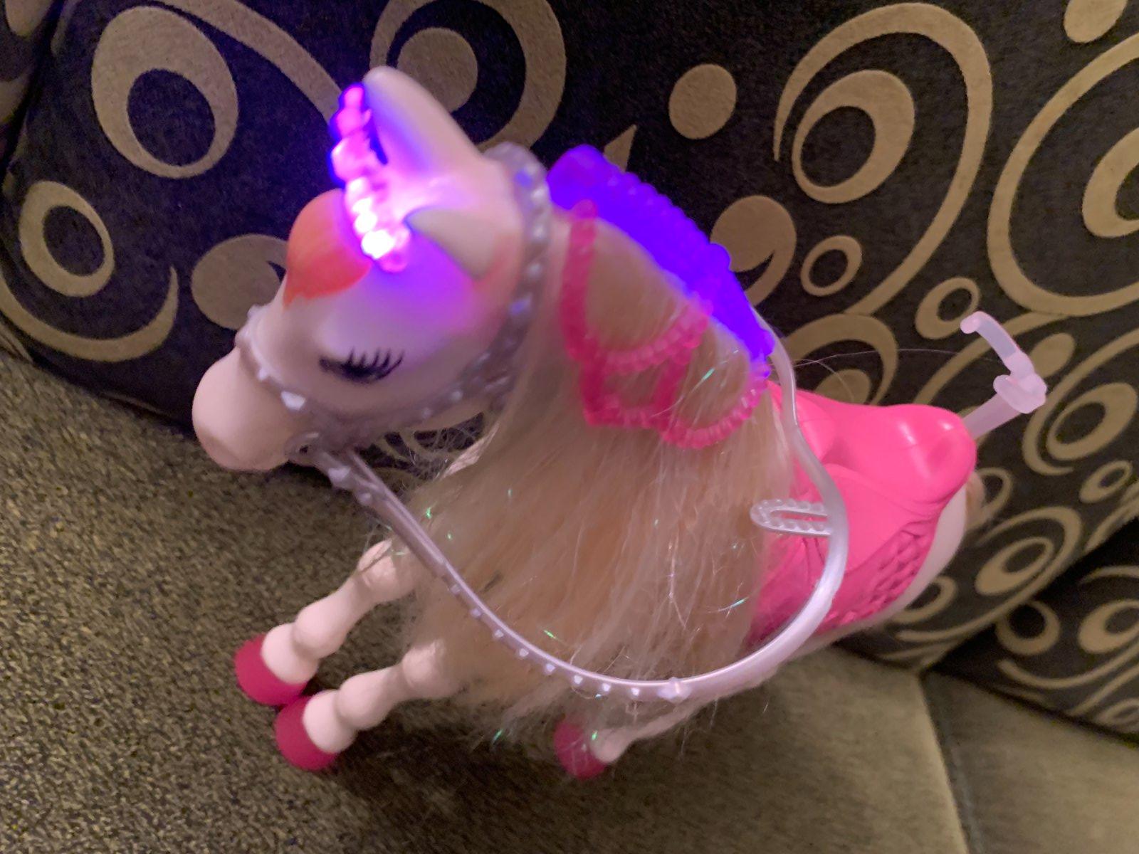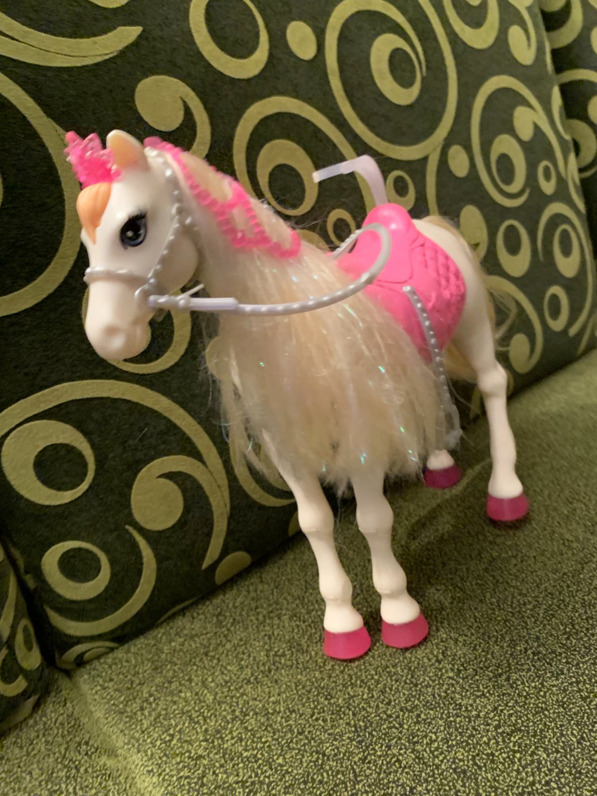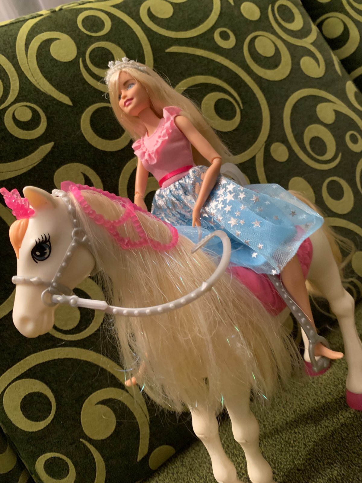 Barbie princezná a kôň so svetlami a zvukmi. Po zatlačení "ofinky" začne hrať a rozsvietia sa jeho kopytá, korunka a uzda, pričom kôň hýbe hlavou, erdží a nadvihuje predné nohy.