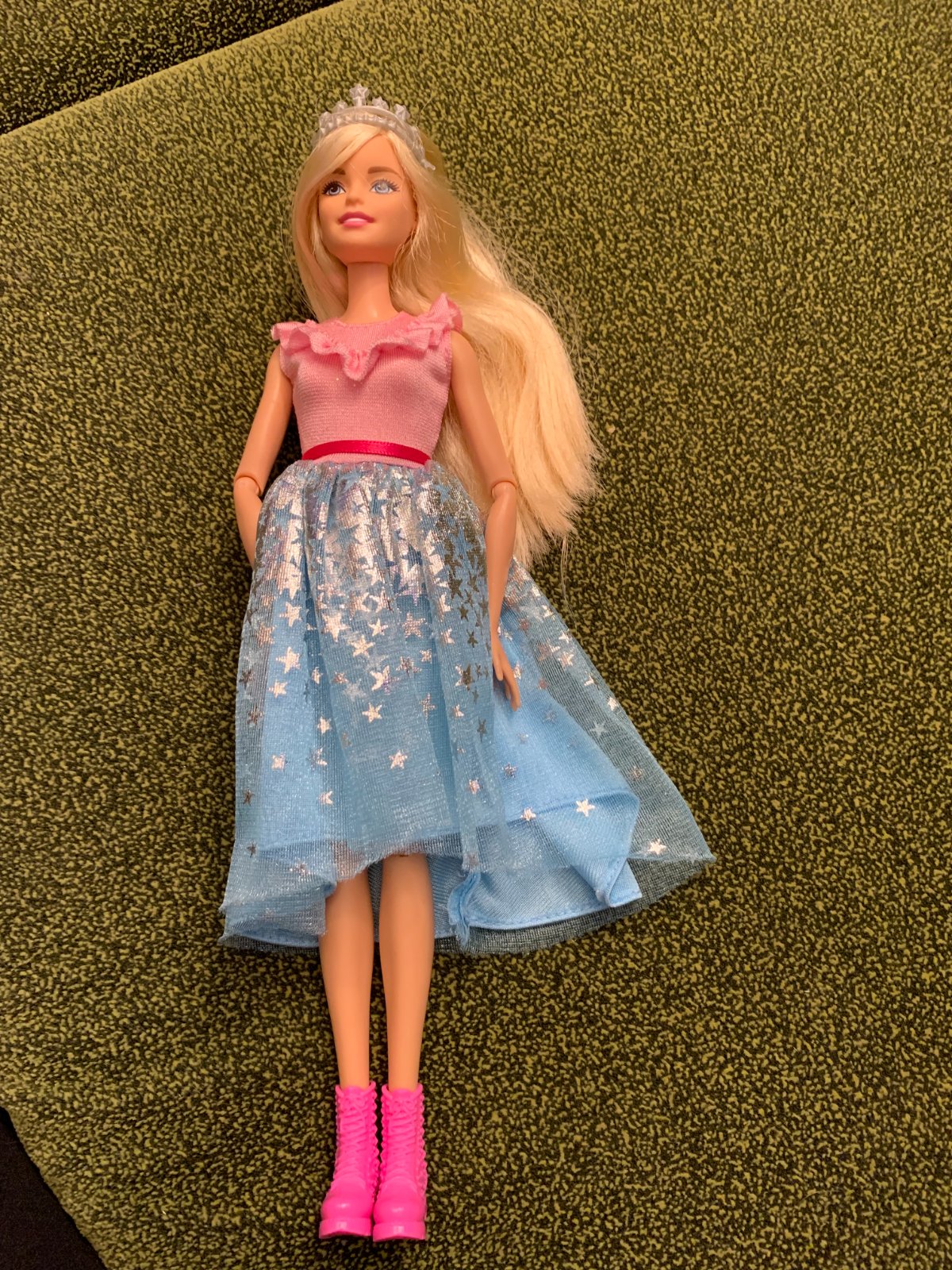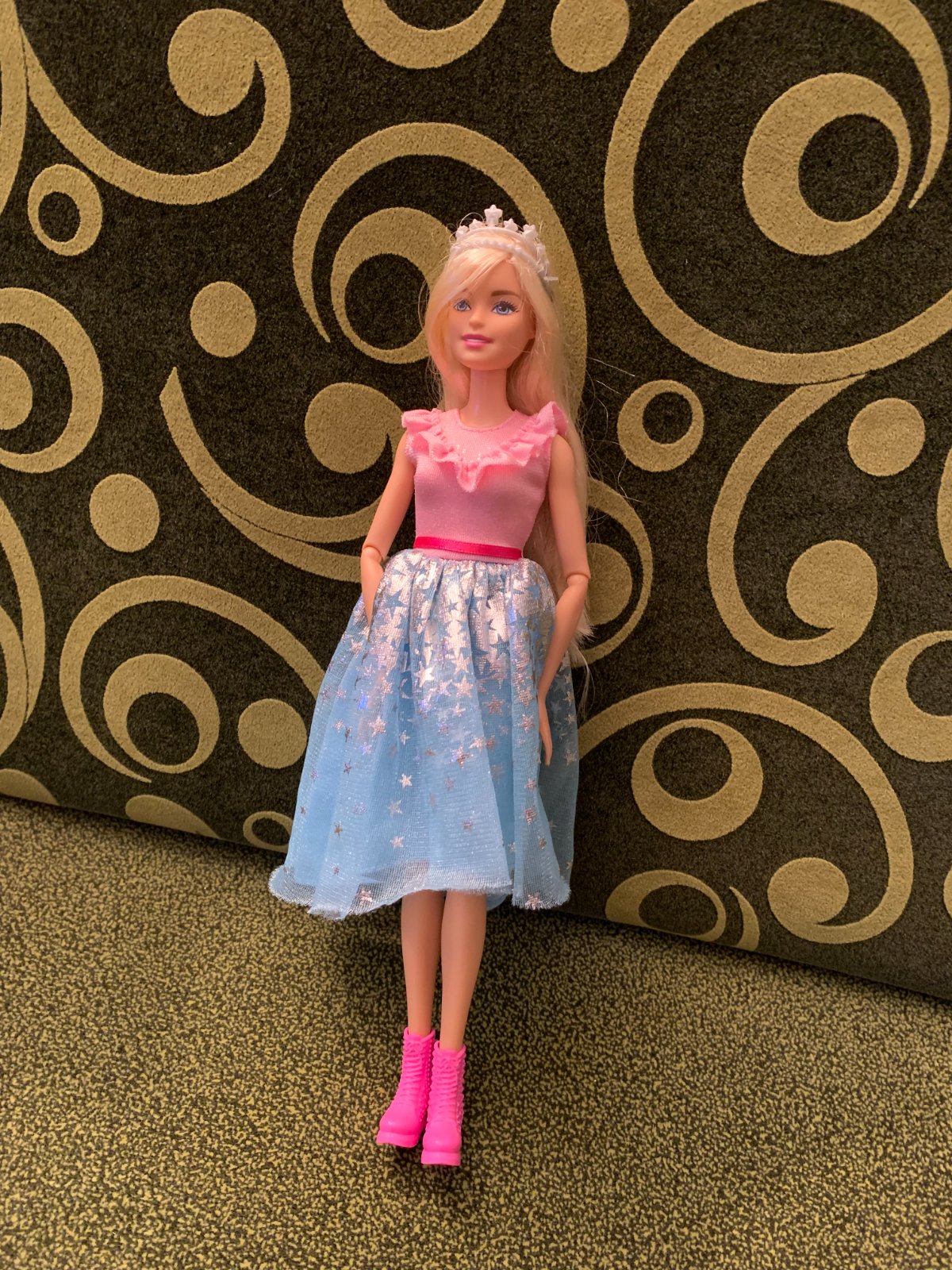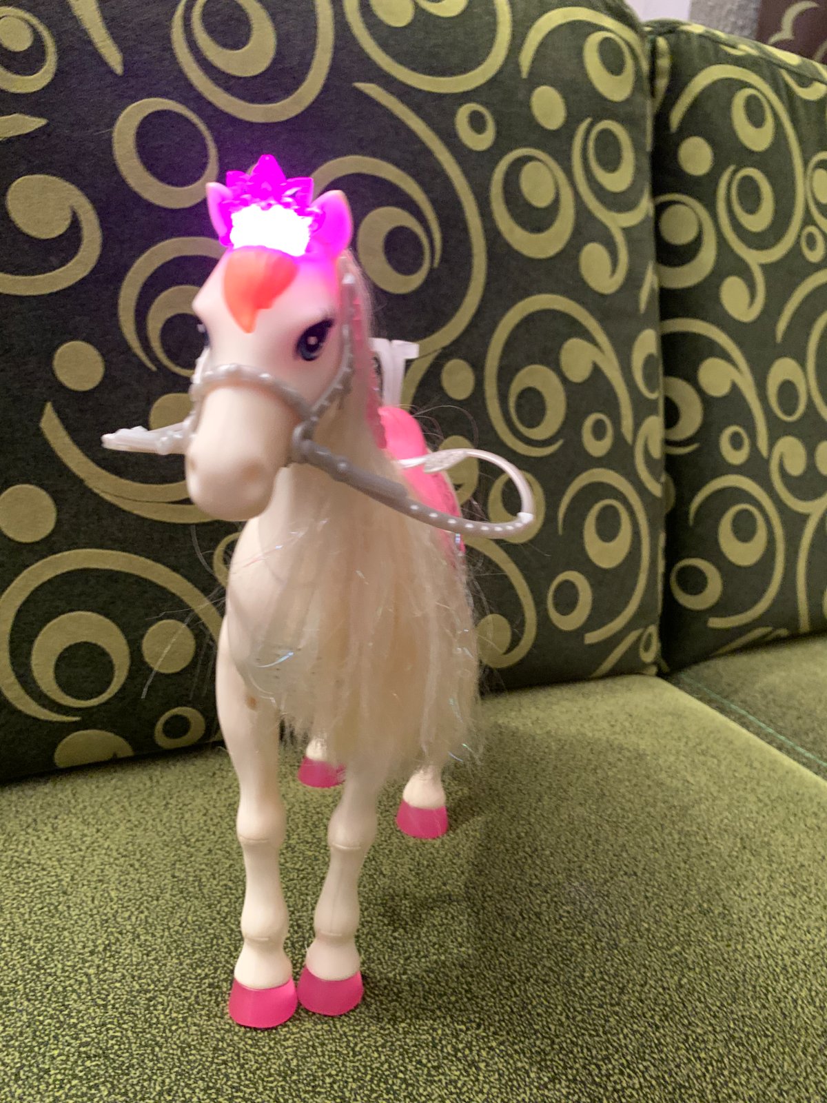 Barbie princezná a kôň so svetlami a zvukmi. Po zatlačení "ofinky" začne hrať a rozsvietia sa jeho kopytá, korunka a uzda, pričom kôň hýbe hlavou, erdží a nadvihuje predné nohy.