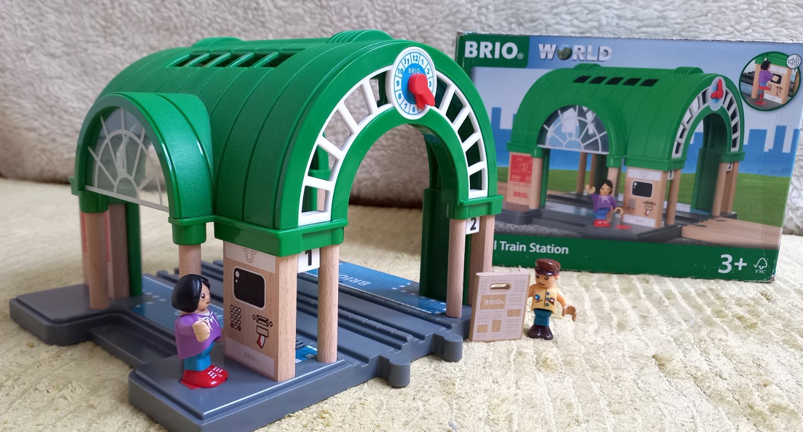 Dvojkoľajová vlaková stanica BRIO s dvoma figúrkami (jedna je pridaná navyše). Vydáva zvuky automatu na kúpu železničných lístkov. Viac info napr.tu: https://www.mironetcz.sk/brio-hlavna-vlakova-stanica-od-3-rokov+dp612684/?hgtid=f6f6dd56-5b2f-4c07-bd02-08f92195f5a8.