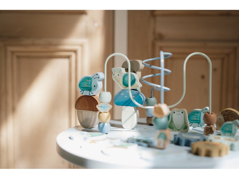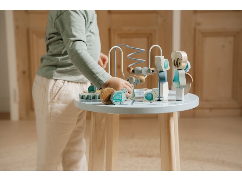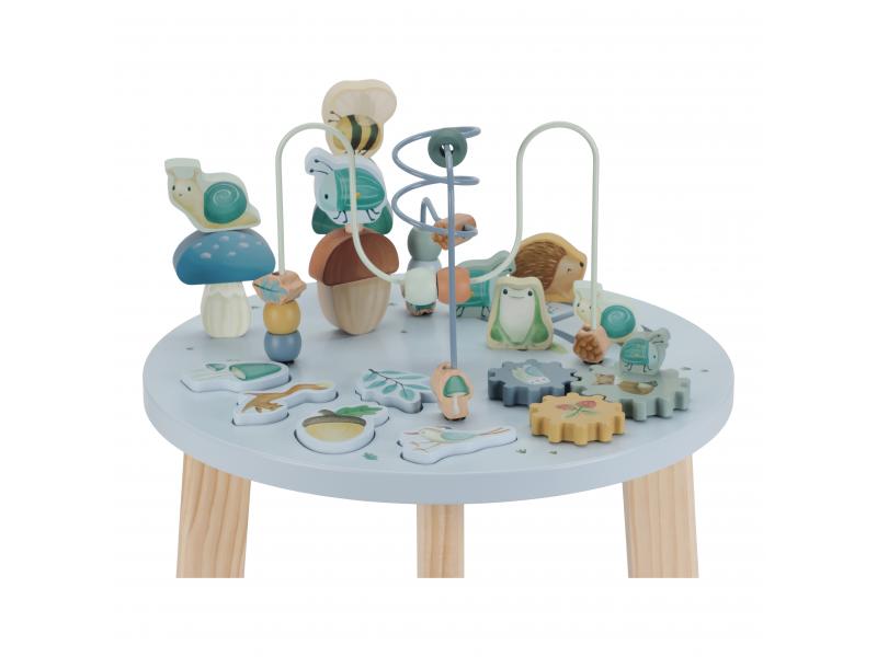 Drevený multifunkčný stolík v krásnom a vysoko kvalitnom prevedení ponúka vášmu dieťaťu množstvo rôznorodých aktivít, ktoré dieťa zabavia a zároveň pomáhajú rozvíjať jeho jemnú motoriku aj jednotlivé zmysly. Lákať dieťa na skúmanie budú pohyblivé, posuvné aj odnímateľné drevené diely v podobe ježka, slimáka, žaby, hubiek a ďalších motívov zo života v lese.