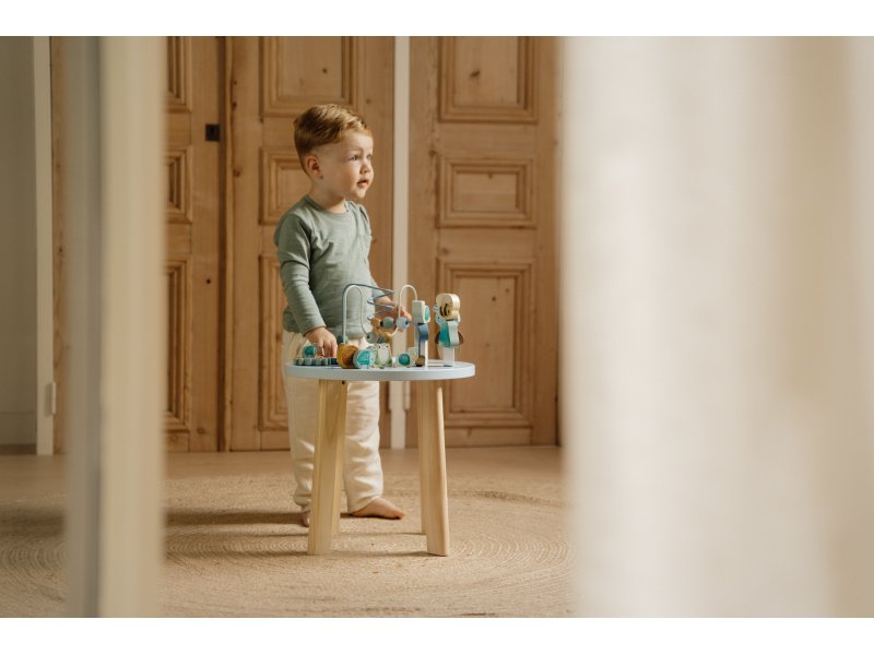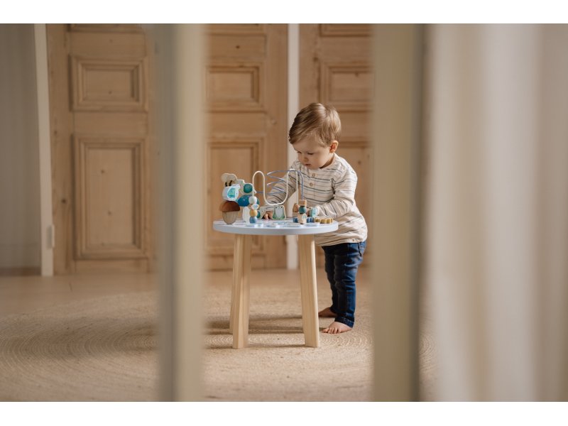 Vďaka stabilnému drevenému prevedeniu je stolík vhodný aj pre deti, ktoré hľadajú oporu pri prvých krôčikoch.