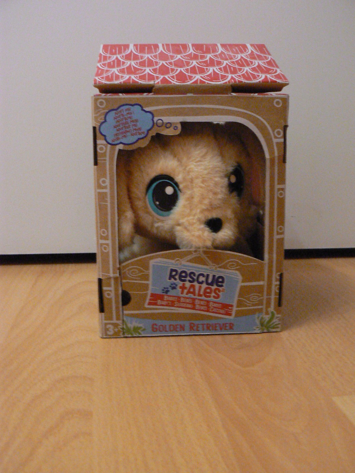 Plyšák psík zlatý retriever s búdou z kartónu. Strecha búdy sa dá odklopiť a vznikne krabica. Zachovalé, stav viď. foto.