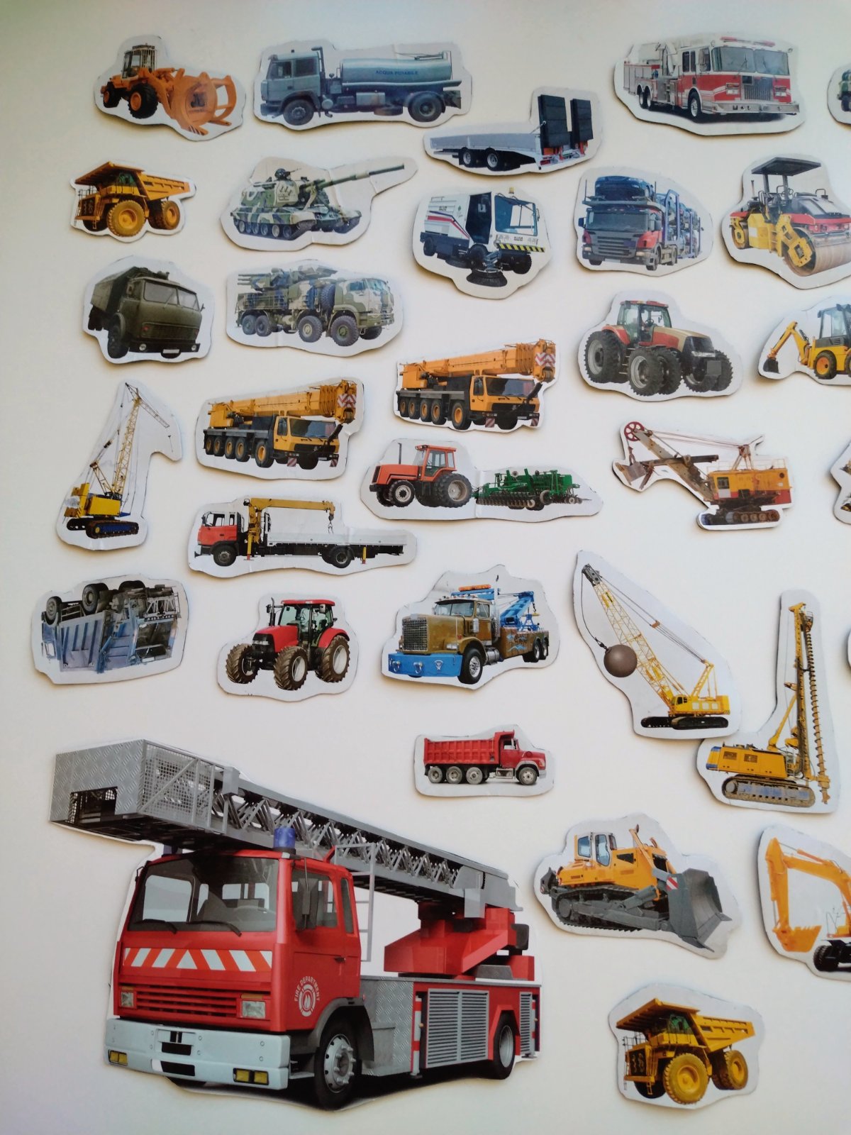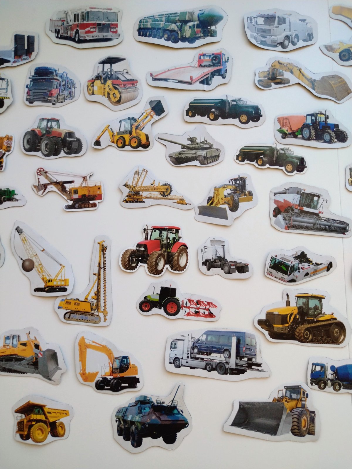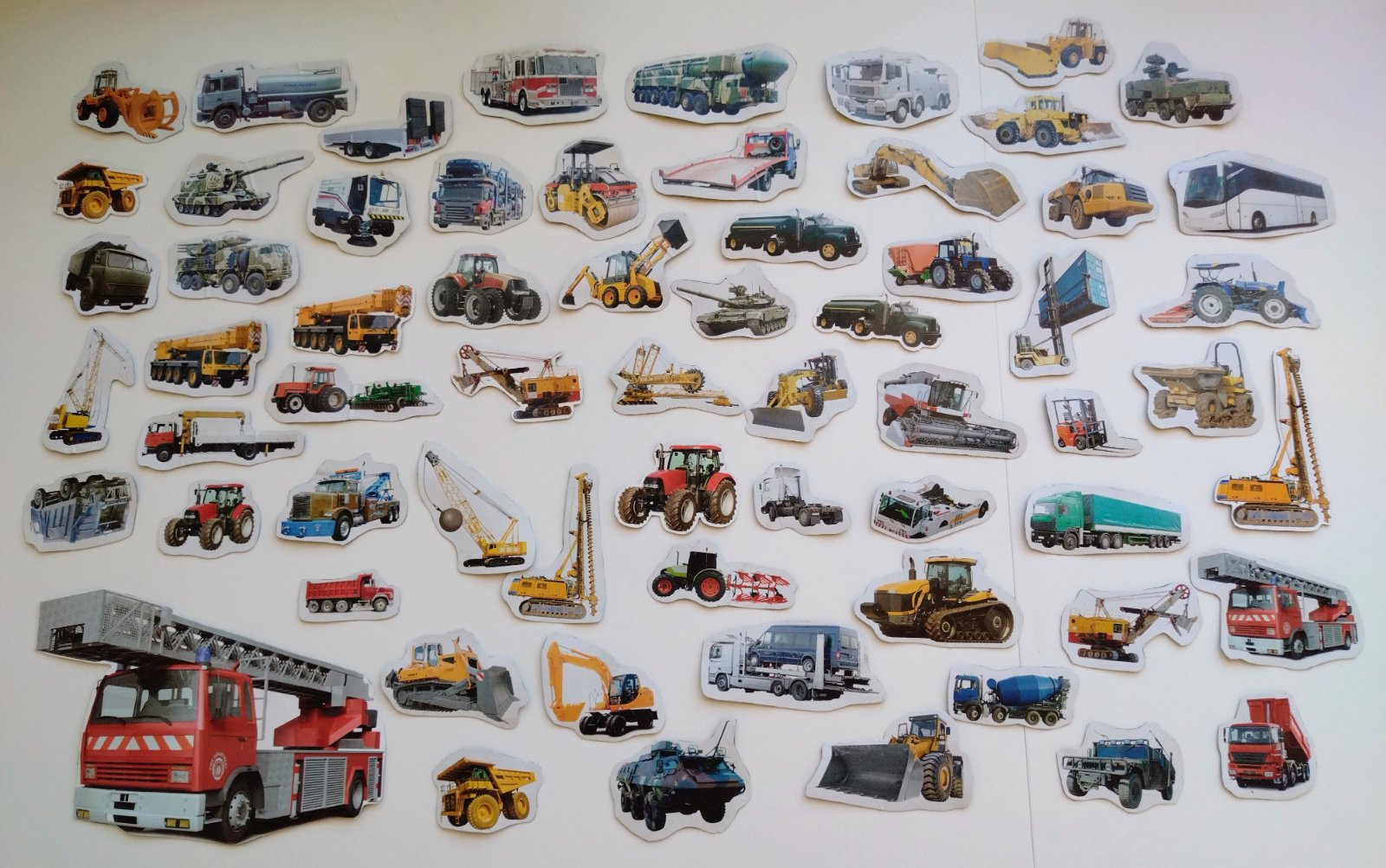 Kolekcia detských vzdelávacích magnetiek s motívom dopravných prostriedkov a stavebných strojov, motívy vozidiel (ako hasičské autá, bagre, traktory či miešačky), použité, bez poškodenia. Spolu ich je 63 kusov.