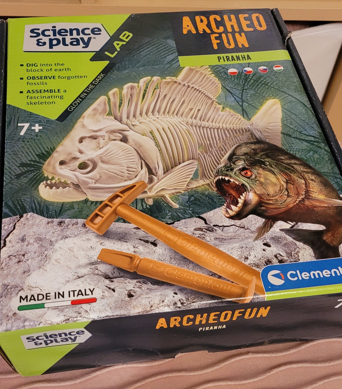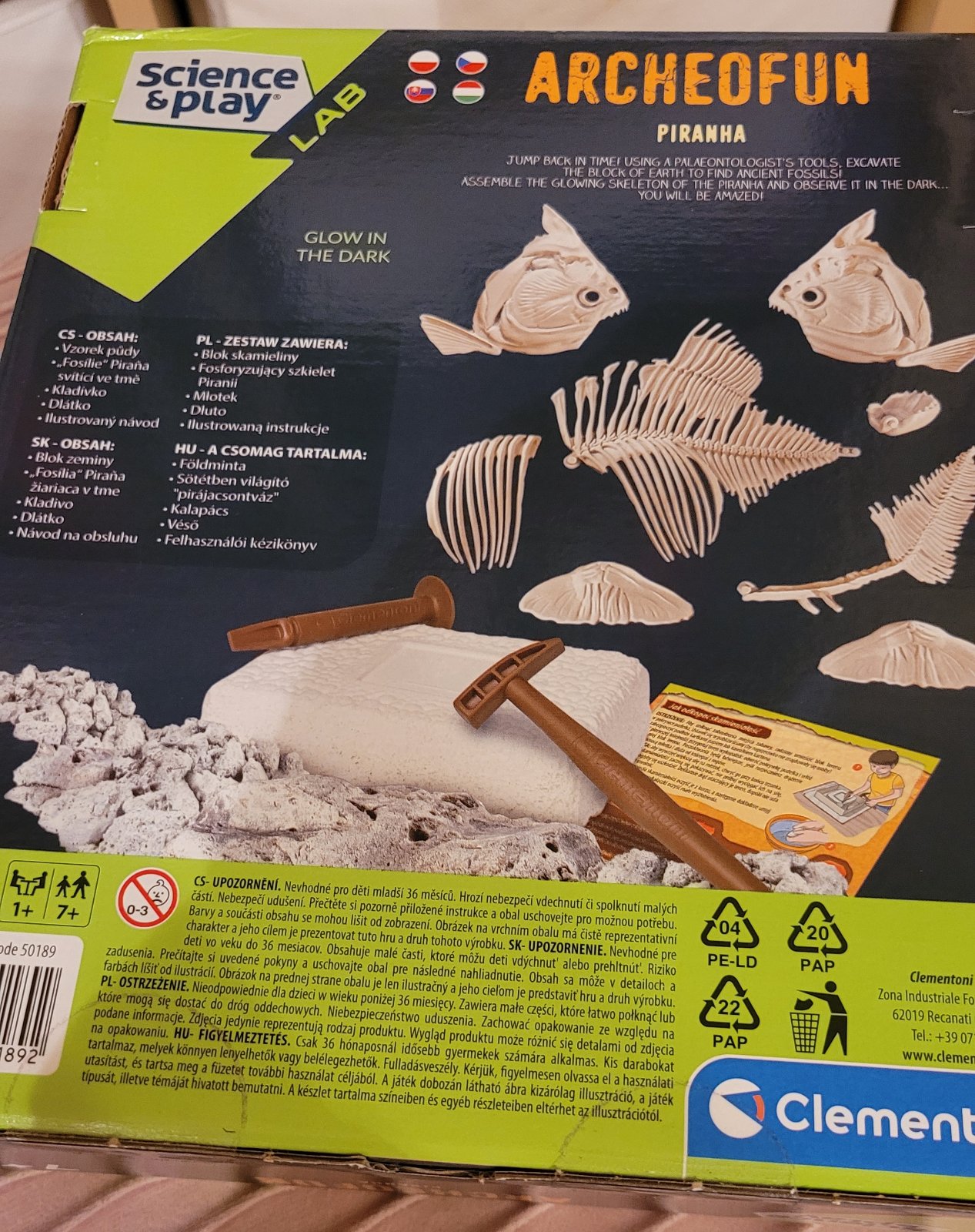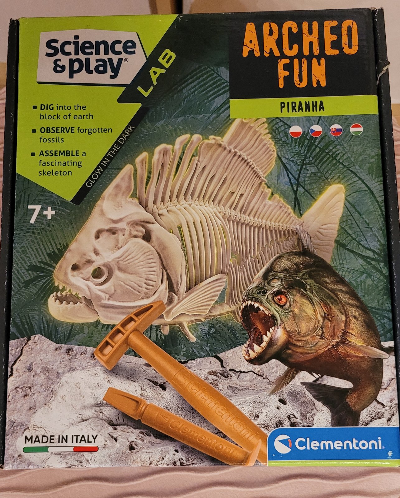 Predám Clementoni Pirana - nové neotvorené. Zahraj sa na paleontológa a objav staroveké fosílie. Použi náradie a nájdi kostru starovekej ryby piraňa. Poskladaj jej kosti a sleduj, ako v tme svietia. Obsahuje zeminu, fosílie piraní, kladivko a dlátko.