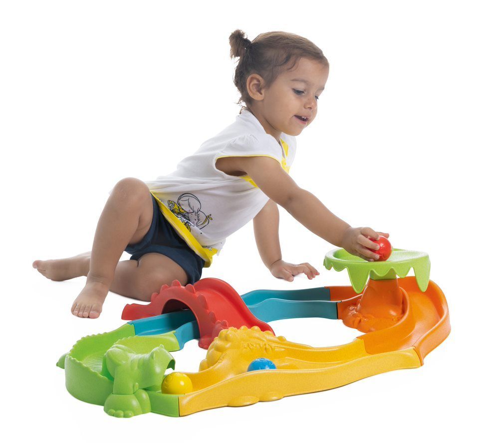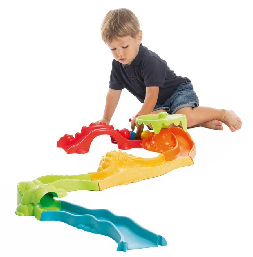 Hračka sa skladá z modulov a ľahko sa montuje: diely je možné ľubovoľným spôsobom kombinovať a vytvoriť tak dráhu. Farebné prvky trate odkazujú na safari – tunel s krokodílom či šmykľavka zo stromu.