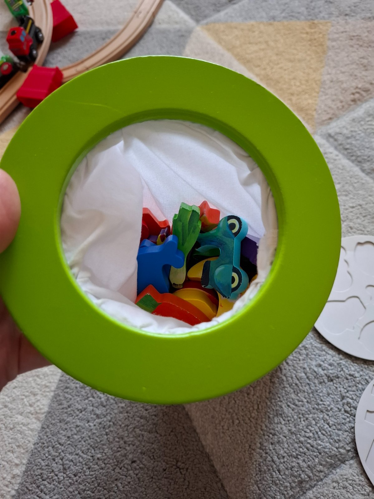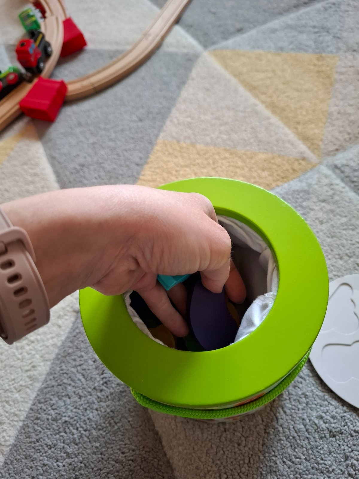 Hra Hmataj a nájdi je založená na tom aby dieťa vďaka hmatu našlo potrebný tvar.