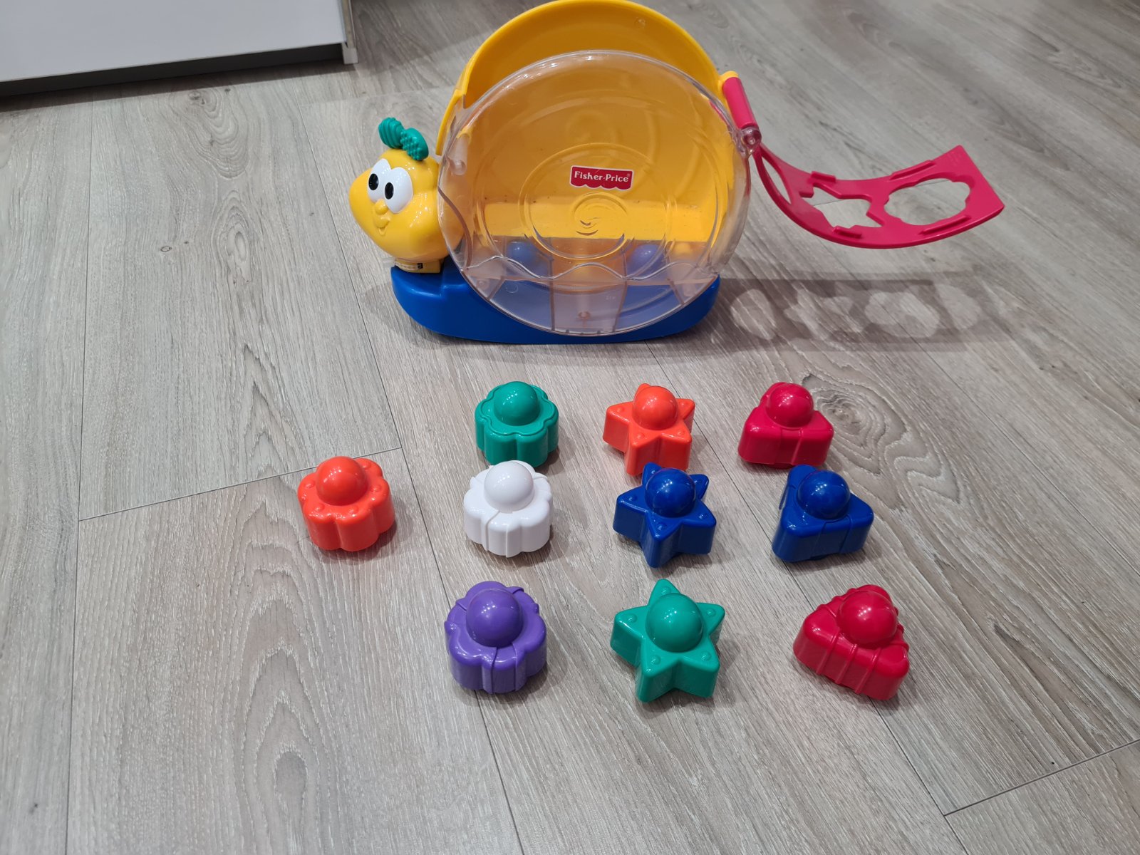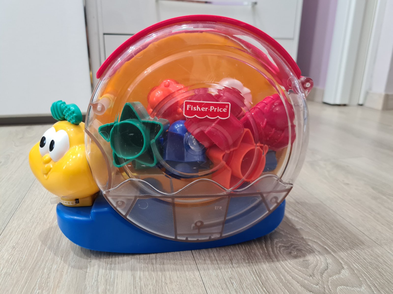 Tento slimák pomáha deťom rozoznávať tvary a veľkosti. Do ulity sa mu zmestí všetkých 10 kociek len cez správne otvory. Kocky sa dajú spájať a vytvárajú pyramídu. Pri hraní slimák hrá hudbu.