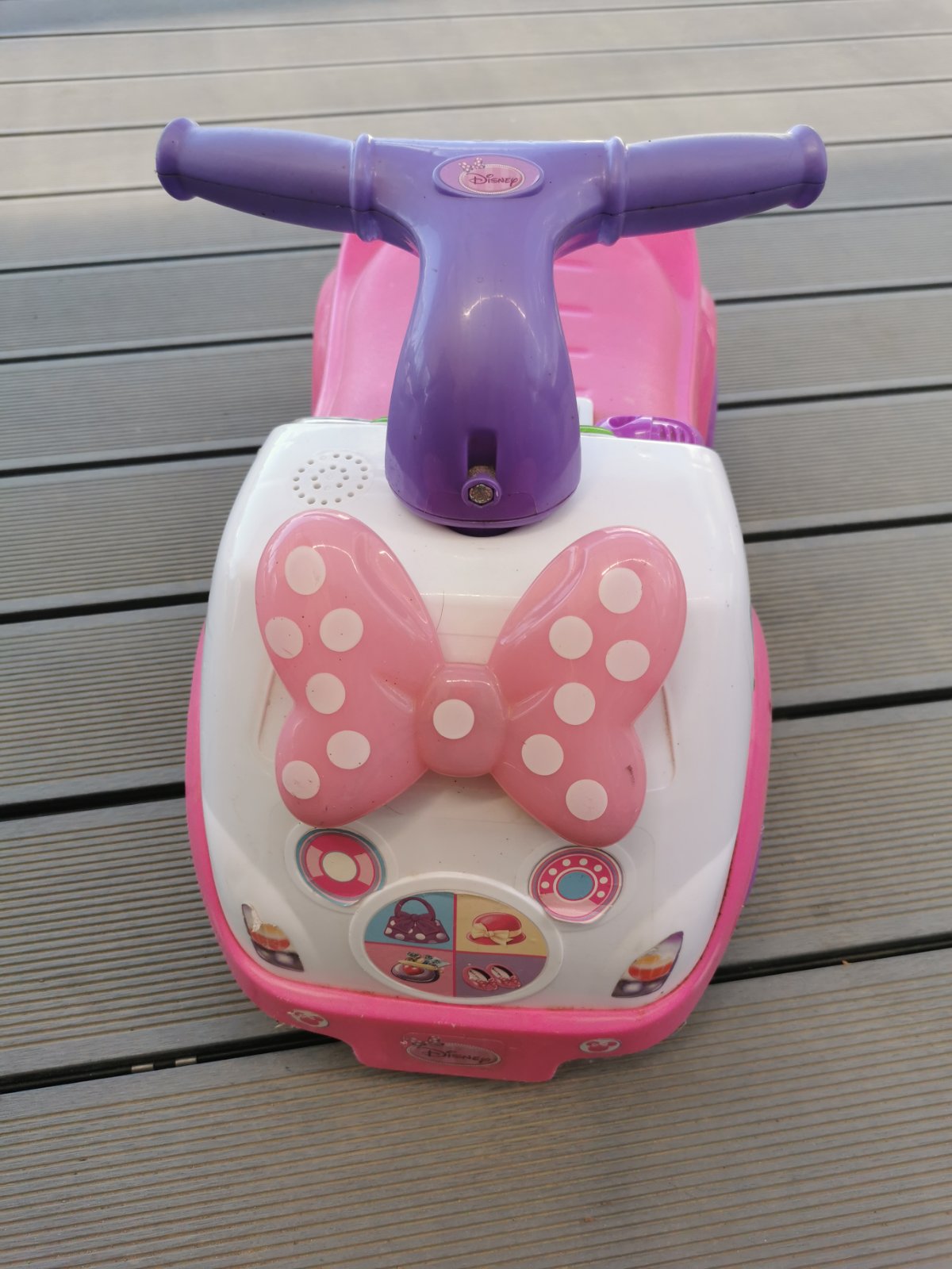 Odrážadlo Minie, bez poškodenia, akurát niektoré nálepky sa trhajú, viď foto. Odrážadlo vydáva zvuky, trúbi, štartuje, smerovky blikajú. Mám aj Frozen odrážadlo.V