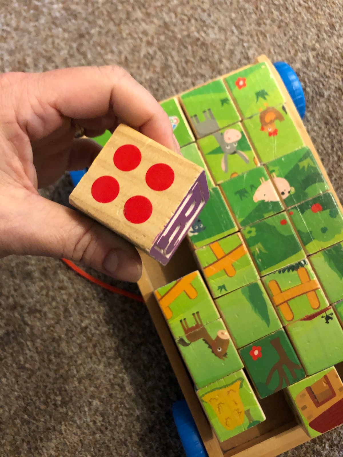 Vozik s kockami s abecedou, obrazkami, cislami a geometrickymi tvarmi. Bezne znamky pouzivania.