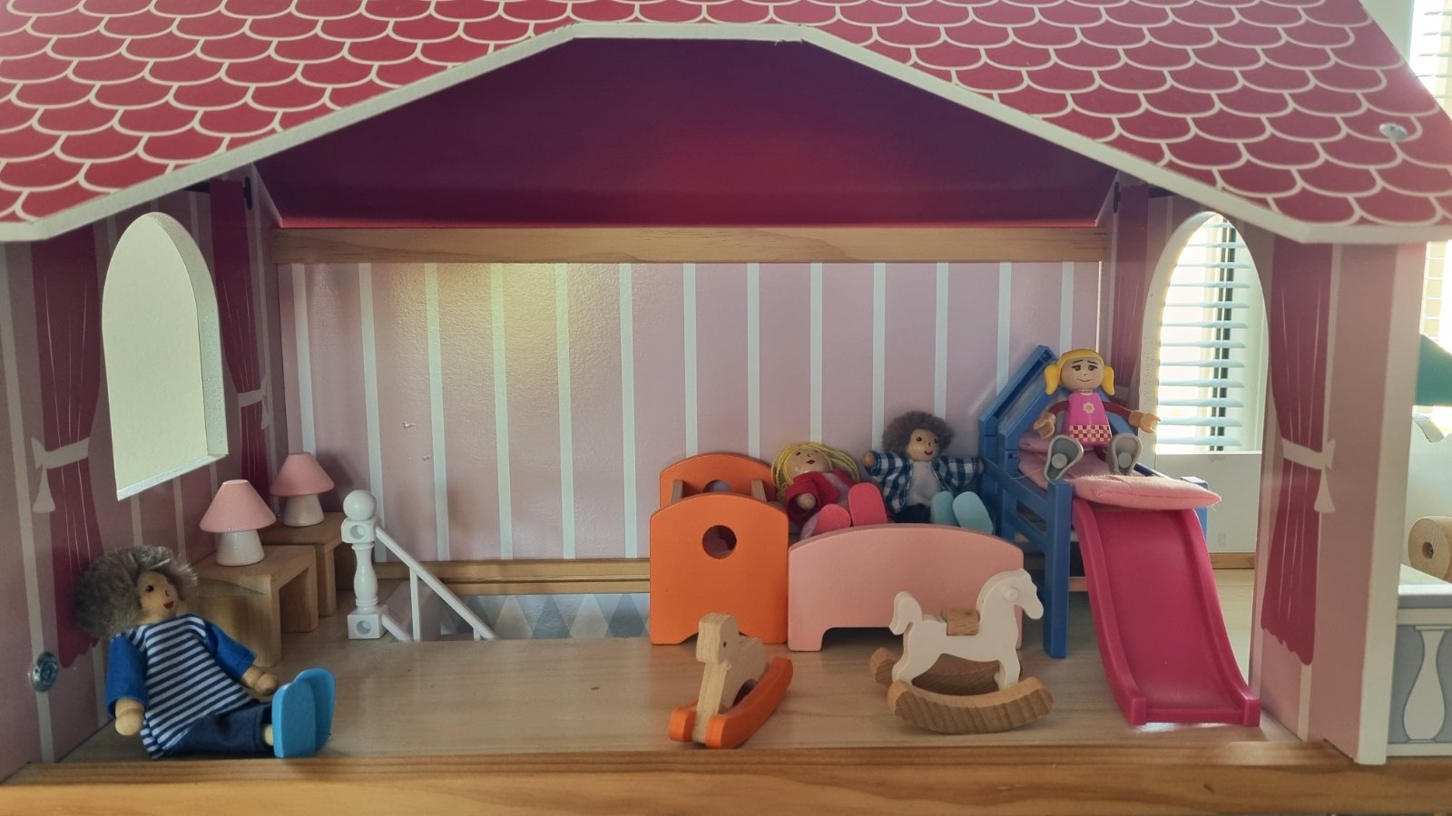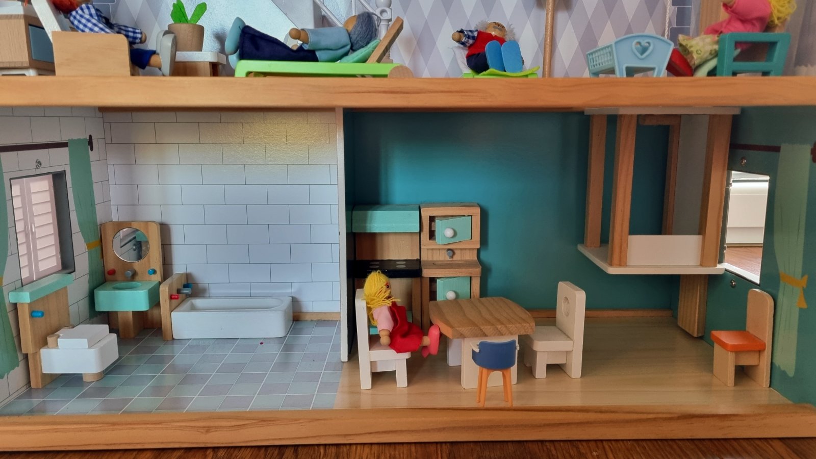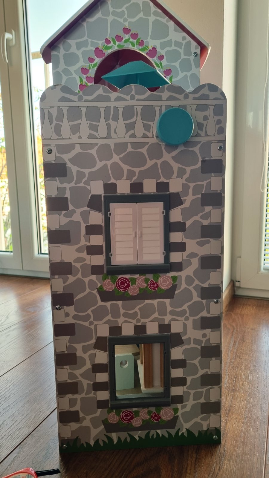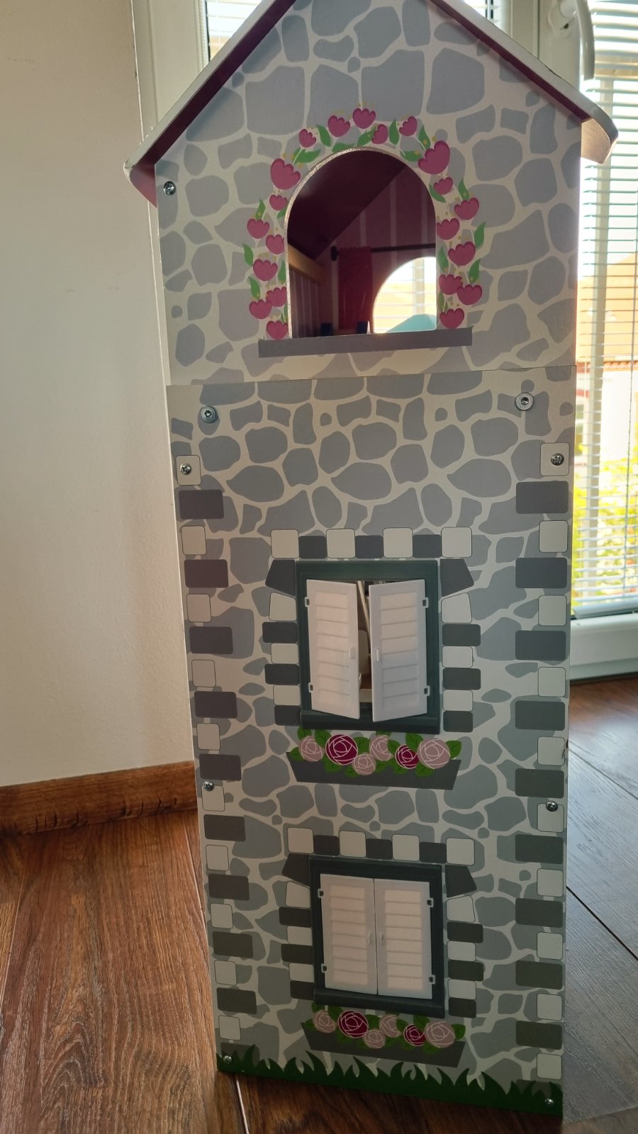 Drevená konštrukcia, aj väčšina nábytku. Každý kúsok je len voľne položený, môžete si zariadiť ľubovoľne. Vnútorný mechanický výťah, pohybuje sa na princípe šnúrka koliesko. Myslím, že máme všetky súčiastky. Iba osobný odber, tak ako stojí zmontovaný. Hraný, ale stále výborný stav.