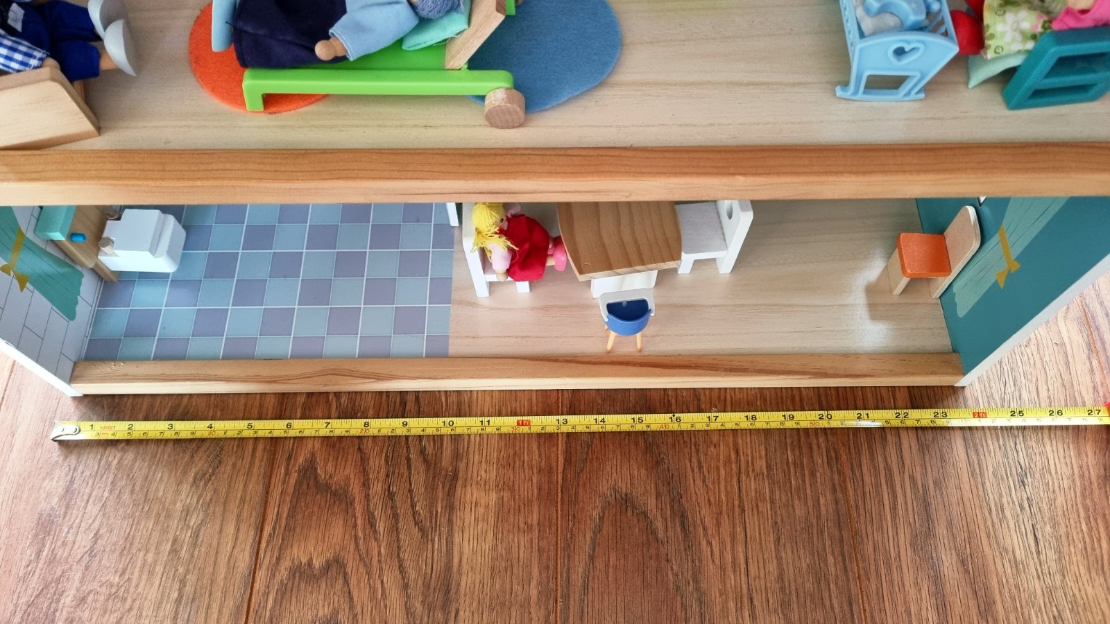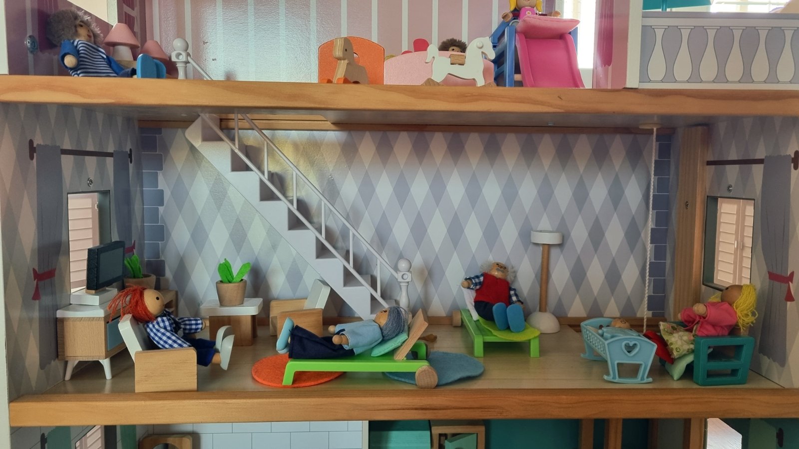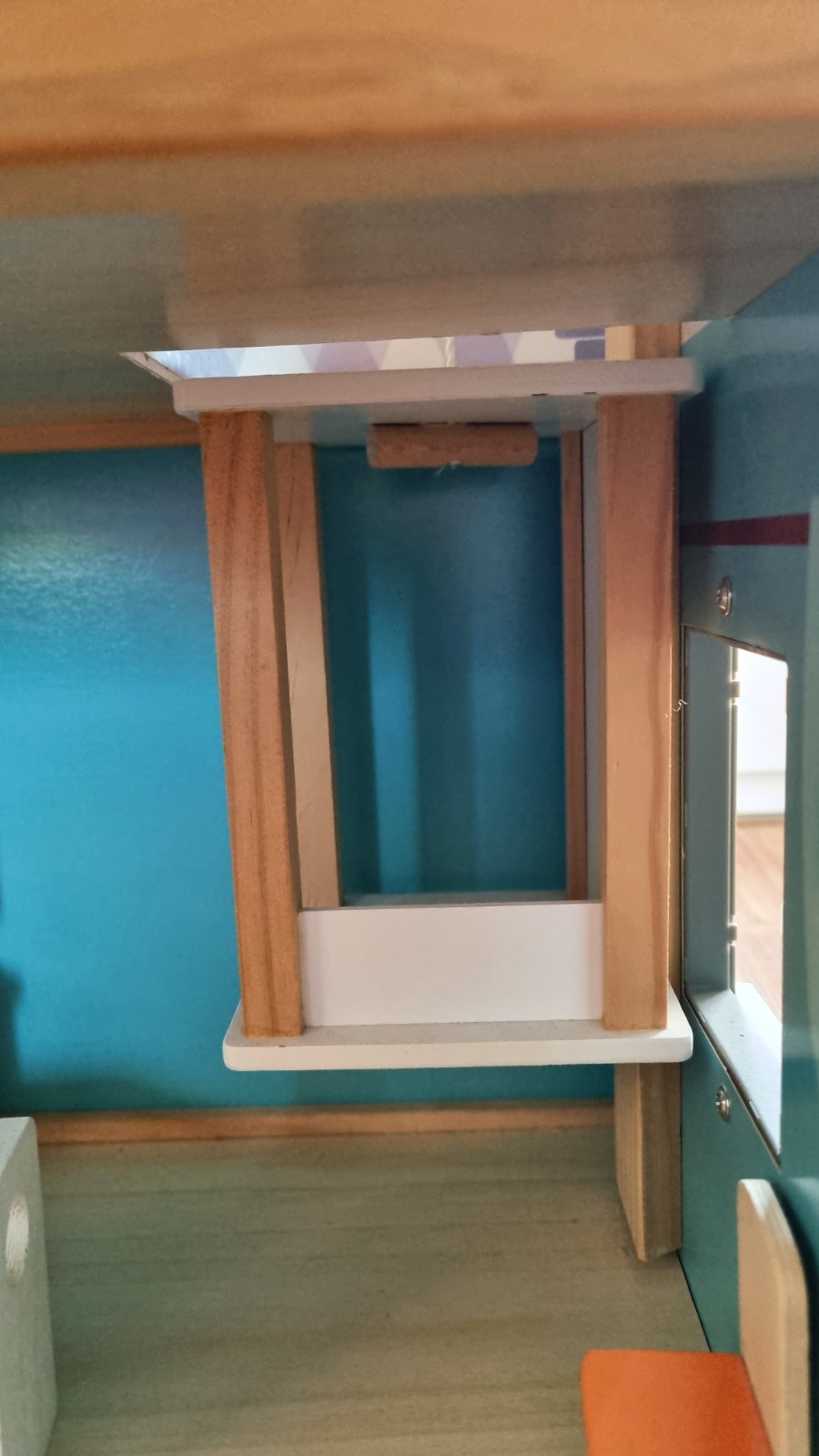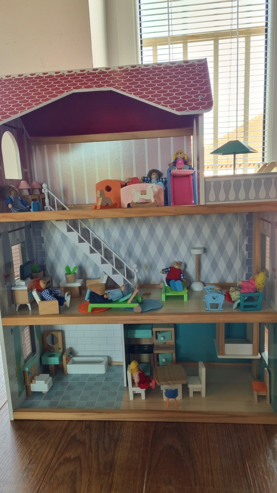 Drevená konštrukcia, aj väčšina nábytku. Každý kúsok je len voľne položený, môžete si zariadiť ľubovoľne. Vnútorný mechanický výťah, pohybuje sa na princípe šnúrka koliesko. Myslím, že máme všetky súčiastky. Iba osobný odber, tak ako stojí zmontovaný. Hraný, ale stále výborný stav.