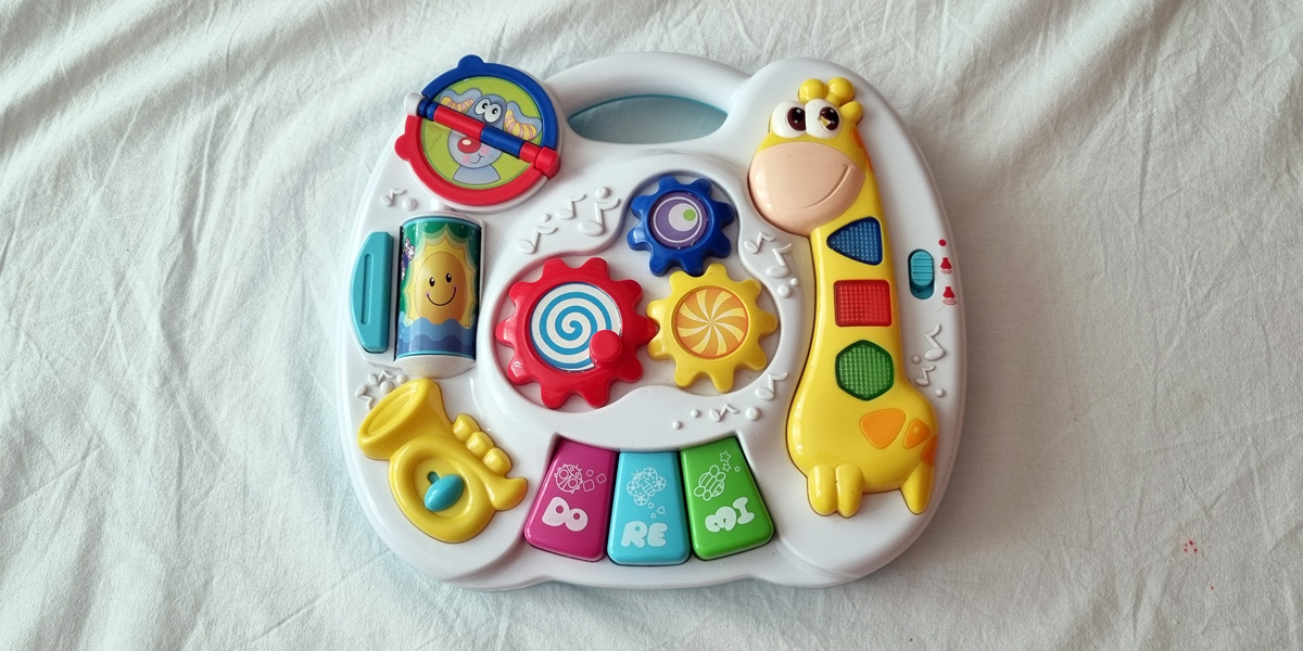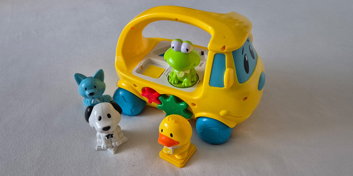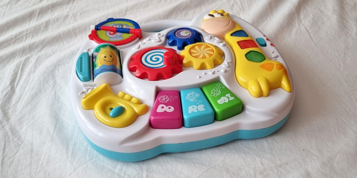 -zvukovú hračku (kufor s melódiou) s rôznymi možnosťami spúšťať zvuk, krútením, stláčaním, otáčaním. Hračka zahrá kratšie melódie, zvieracie zvuky. Na klavíriku je možné hrať rôzne tóny. Vhodné od 18 mesiacov. Cena: 7 €