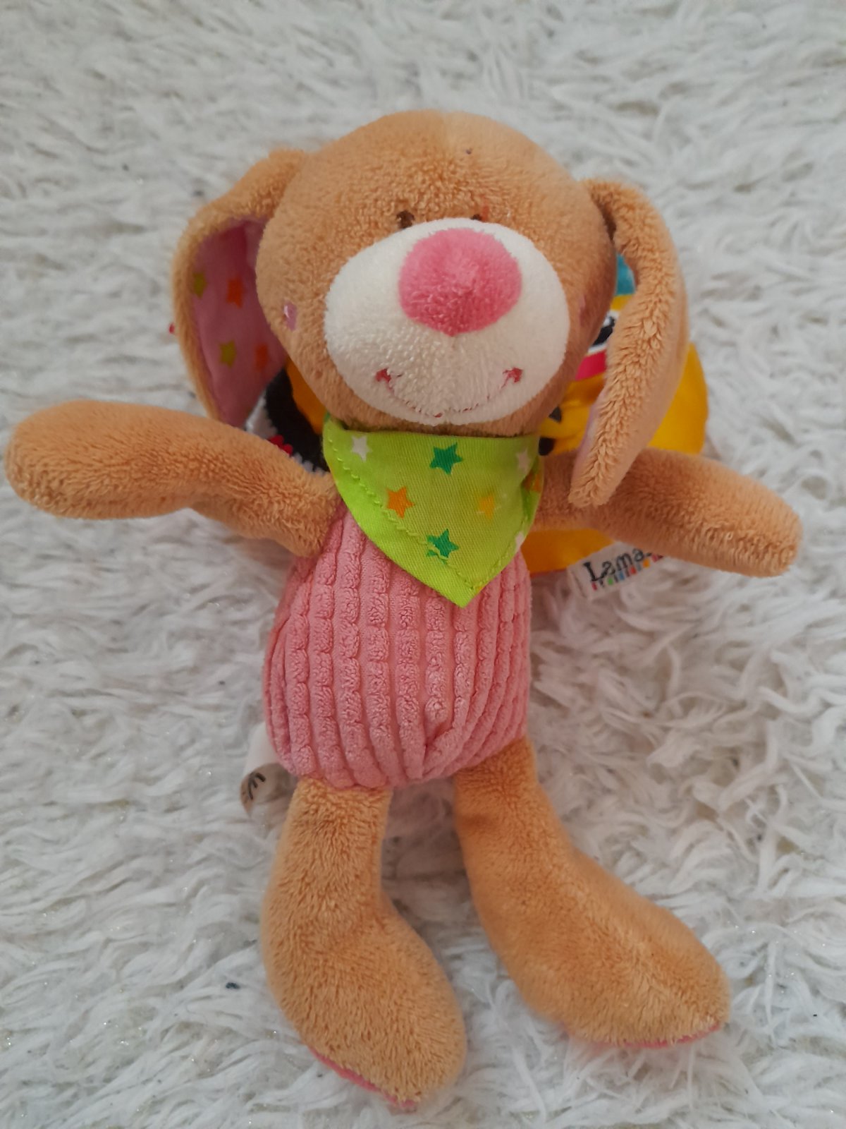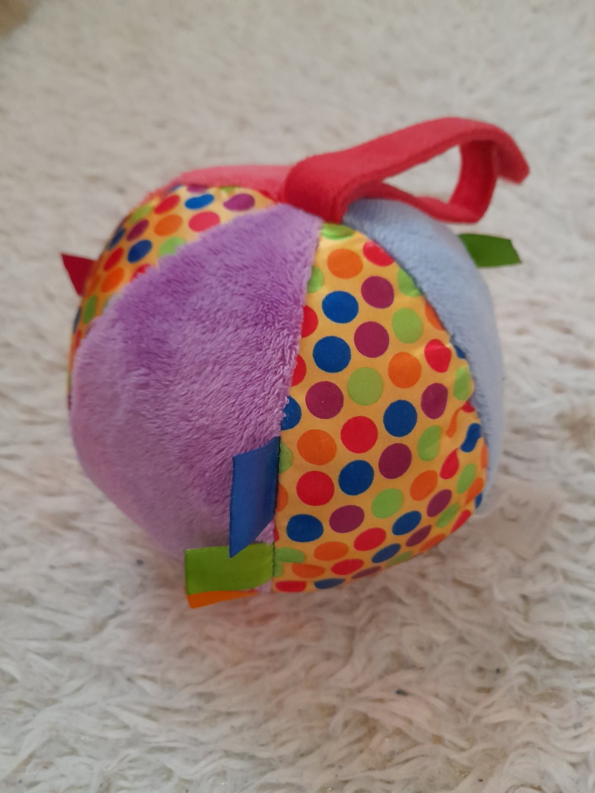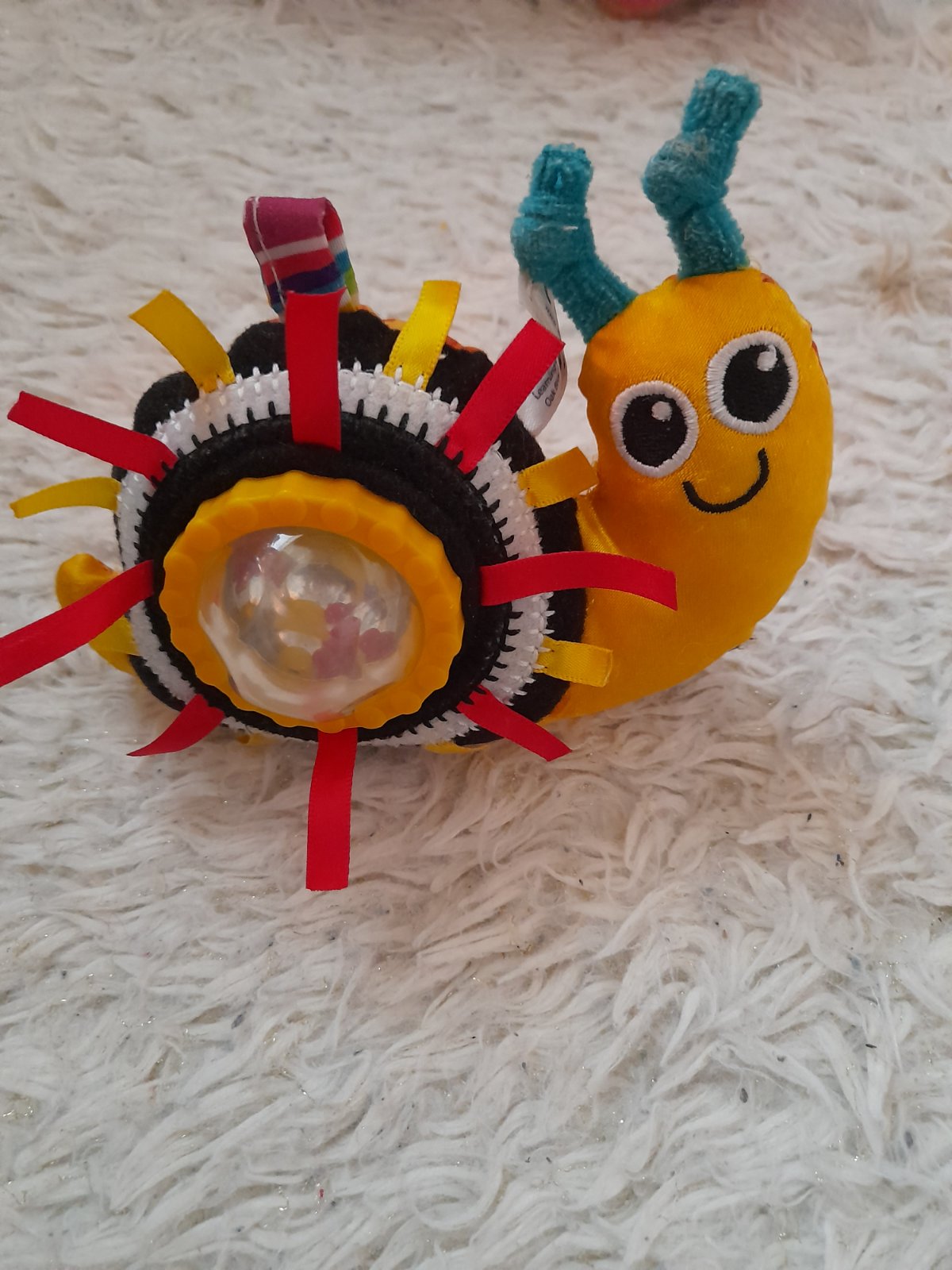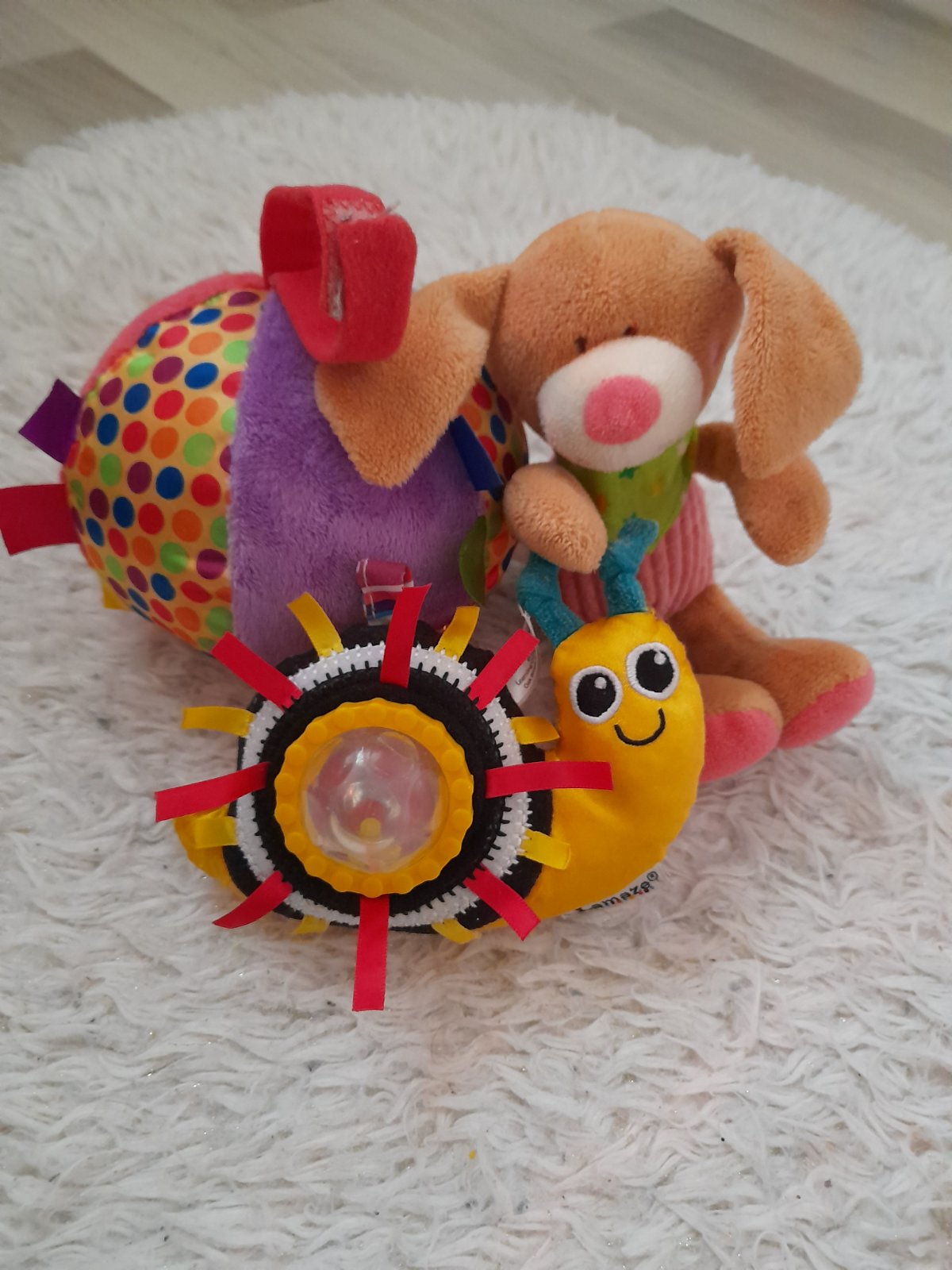 Plyšové hračky. Loptička zo šuštiaceho materiálu, hrká, dá sa zavesiť. Slimáčik Lamaze šuští a má vpredu hrkajúce guličky. Pekný stav.