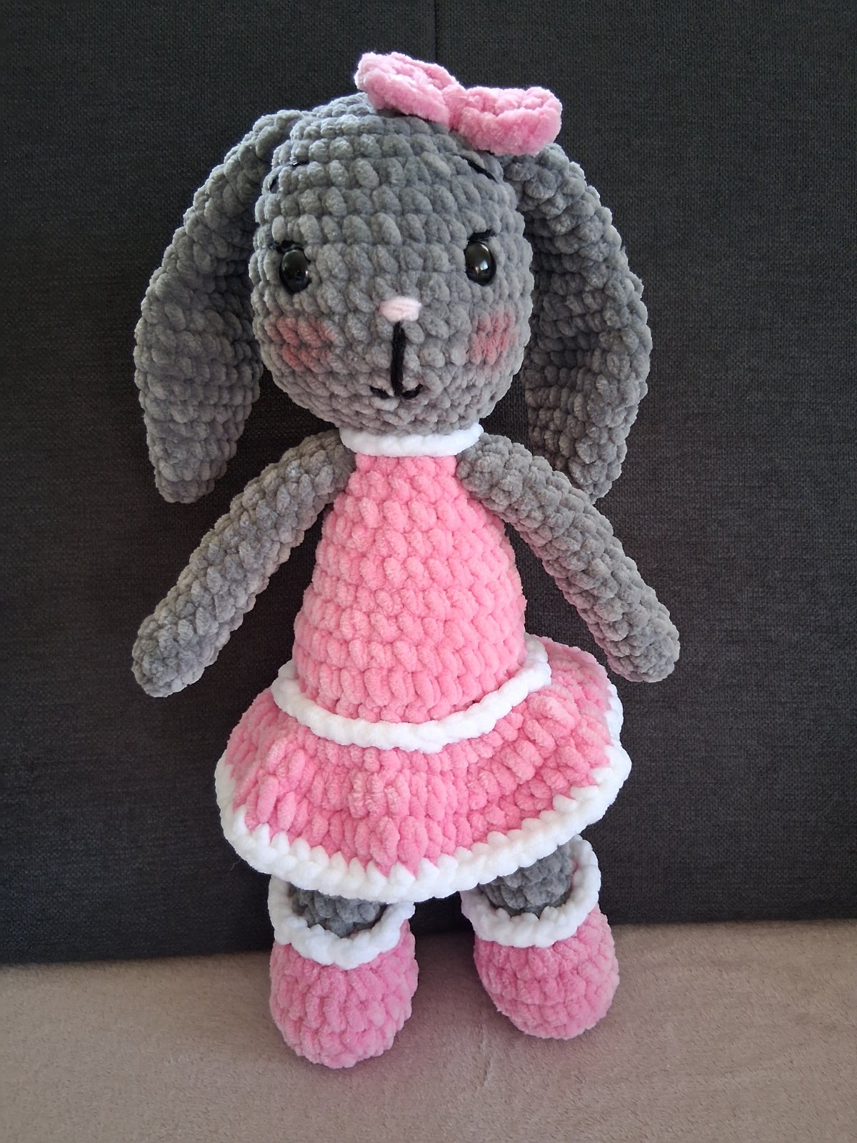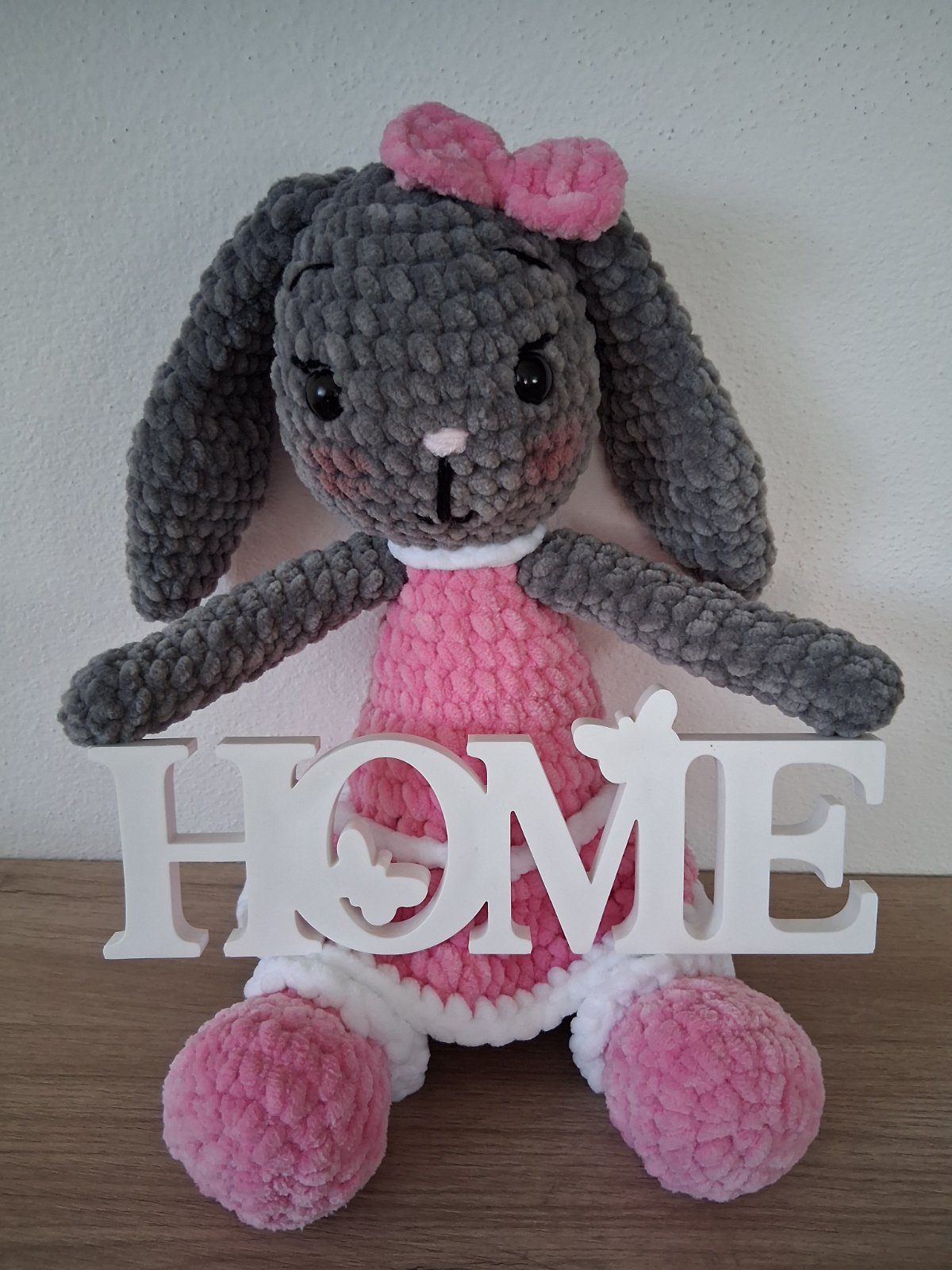 Háčkovaná zajačica z mäkkej príjemnej priadze, vyplnená dutým vláknom s bezpečnostnými očkami. Výška 30-35-40cm. Farba šedá+ ružová tmavá. Viem uháčkovať aj v iných farbách.