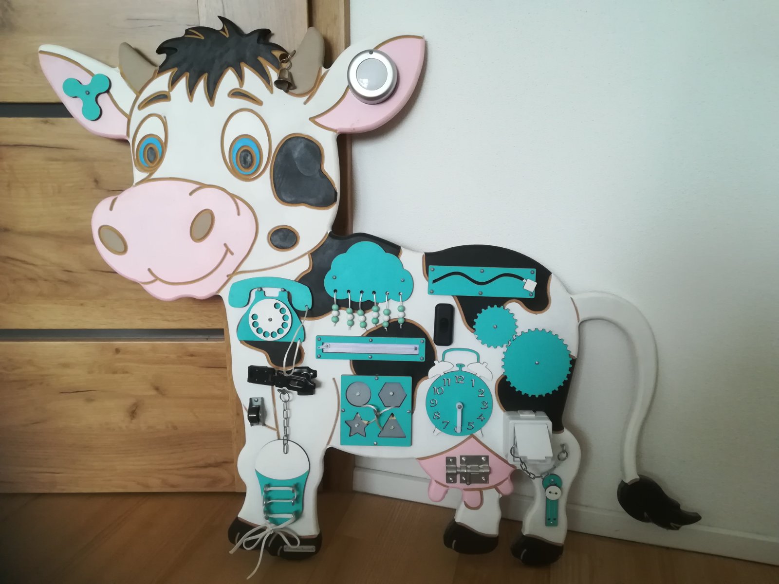 Ponúkam na predaj activity board kravičku, rozmer cca 95 x 80 cm. Je plne funkčná a vybavená všetkým, čo vidíte na foto. Vyhrajú sa s ňou chlapci i dievčatá.