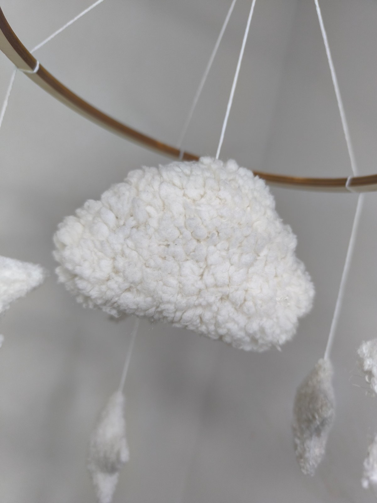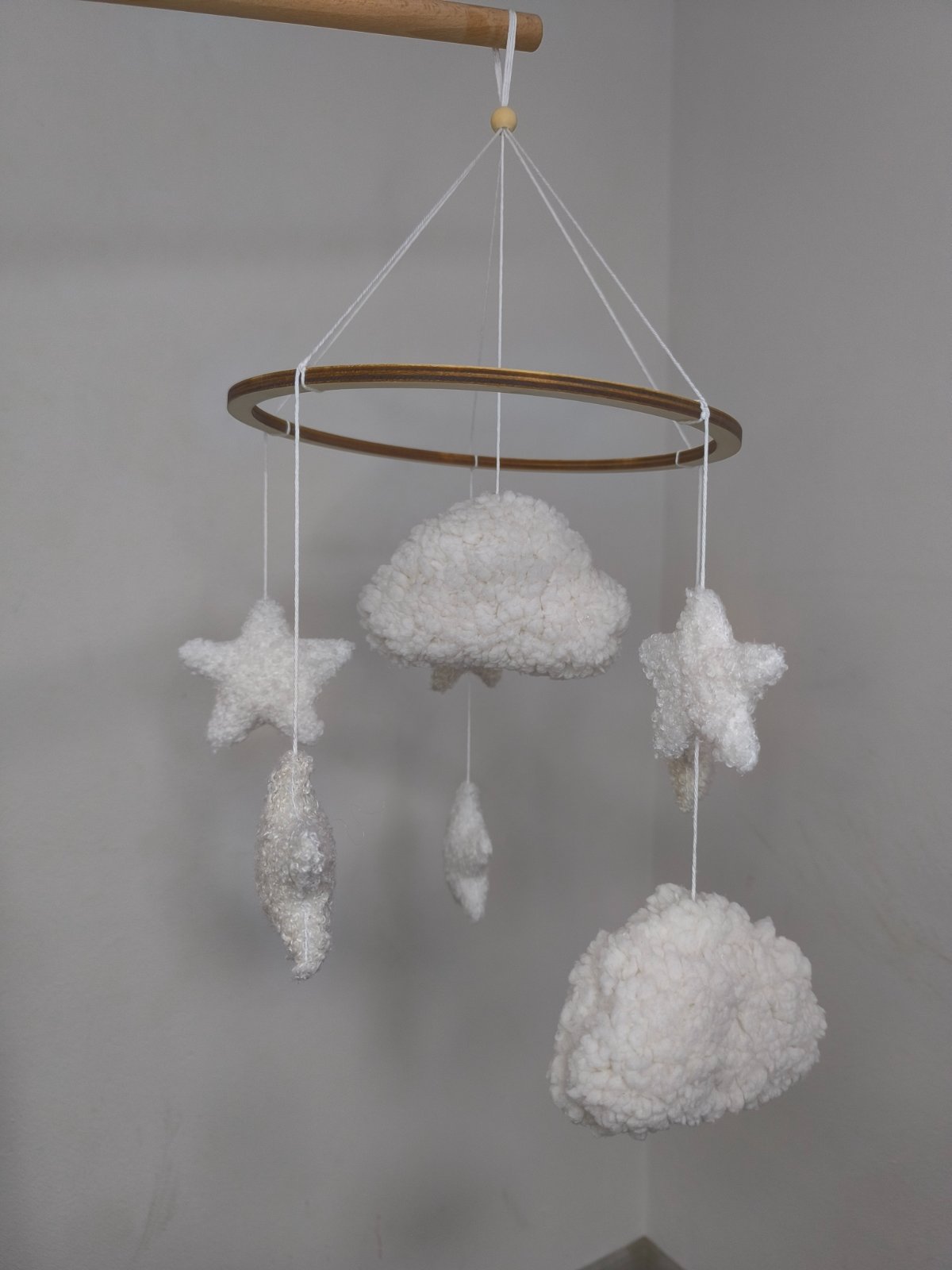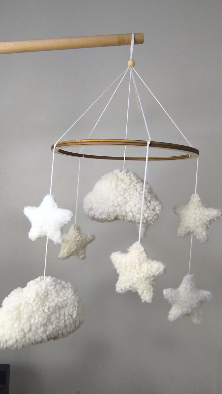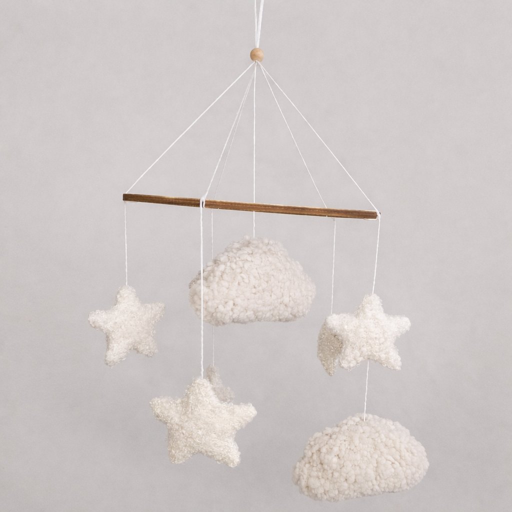 Tento nežný ručne vyrábaný detský kolotoč vytvára pokojné a harmonické prostredie pre bábätko. Kombinácia mäkkých textúr, neutrálnych tónov a prírodného dreva z neho robí krásny doplnok do každej detskej izby.
