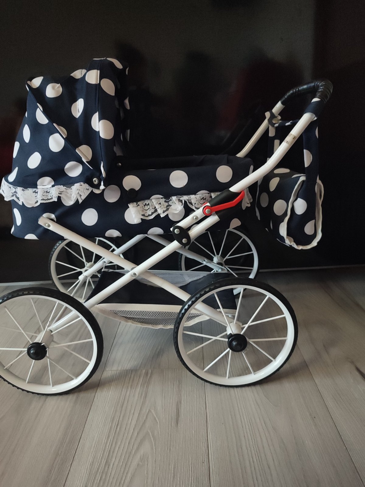 Krásny, kvalitný a veľmi zachovalý kočík pre bábiky. Je vhodný pre deti cca 3-4 ročné. Výška rukoväte 50cm.
