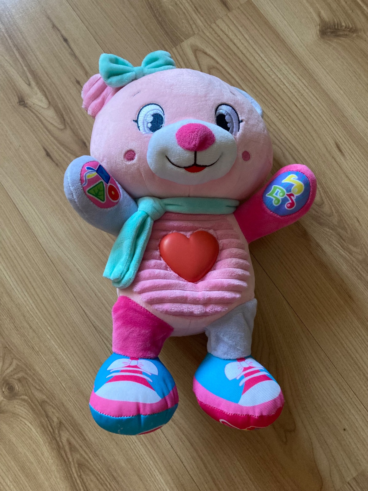 Ružová plyšová medvedica učí mnoho nových slov pomocou zábavných piesní a riekaniek, srdiečko na hrudi svieti, 5 interaktívnych tlačidiel pre učenie prvých číslic, tvarov a písmen.